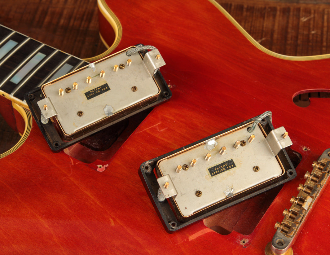 Rocking its original 'double white' PAFs with undisturbed gold plated covers and factory wiring harness with pots dating to the 44th week of 1958, this ES-355 reaches a level of tonal nirvana us mortals simply do not come in contact with on a daily basis! Clean tones are addictively good - a perfect balance of fundamental power, harmonic complexity, and an airiness that delivers some serious touch sensitivity these PAFs are known for. In the neck position, it's all about clarity and definition. Chimey and slightly forward sounding without ever feeling edgy. Switching to the bridge position rewards you with all the sweet, open midrange response and top end sizzle that is nothing short of amazing. Thanks to the stop bar tailpiece, all of that acoustic resonance and sustain is captured and put on display through the pickups. Plenty of focus, sure; but the tonality is deeper and more expressive thanks to the semi-hollow construction. The Ebony board tends to add a little bit of extra "zing" in the trebles as well.