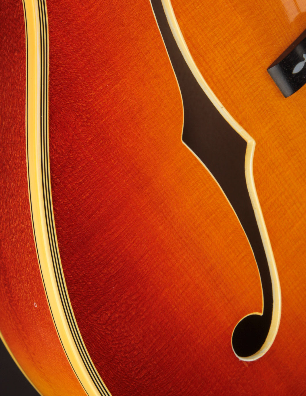 Tone is rich and warm, with a clear midrange voice that separates itself from the L5's more treble-forward response. The floating mini humbucker brings tight, focused lows and bell-like trebles to the mix, with a certain sweetness that doesn't mud up.