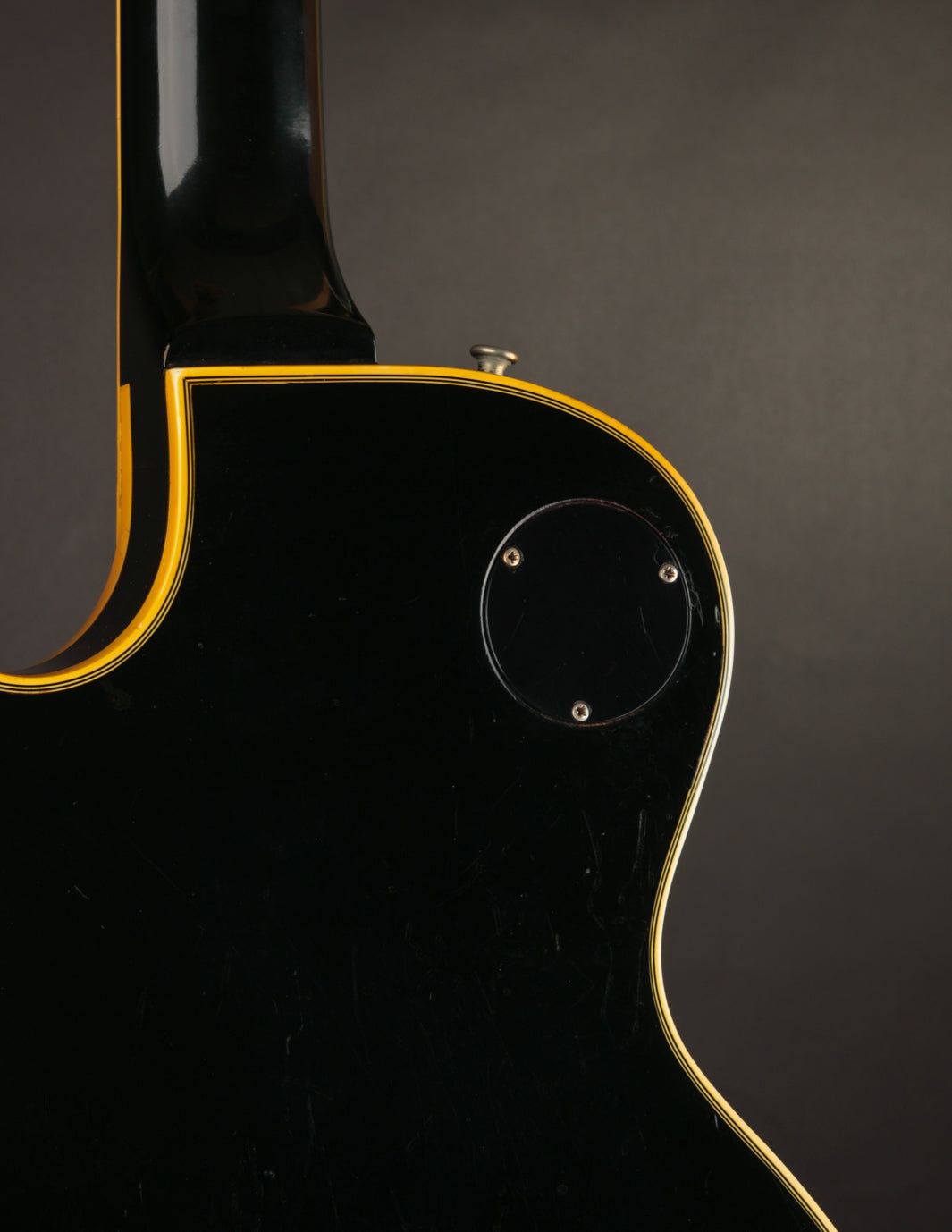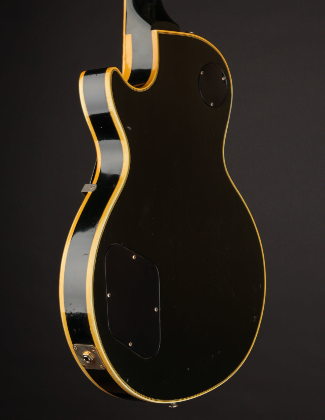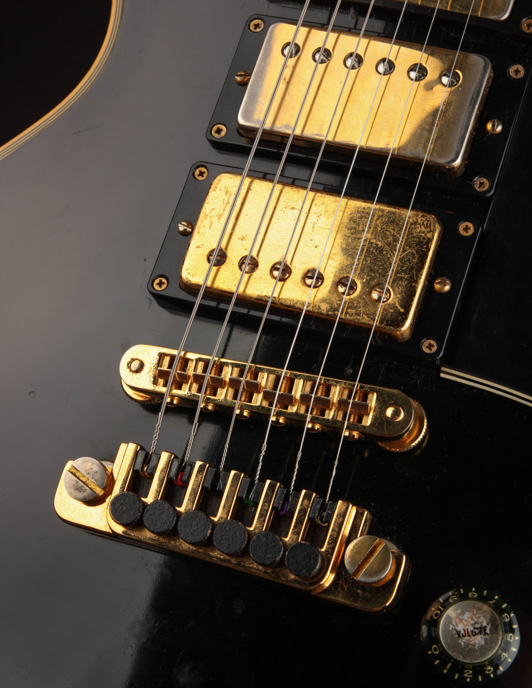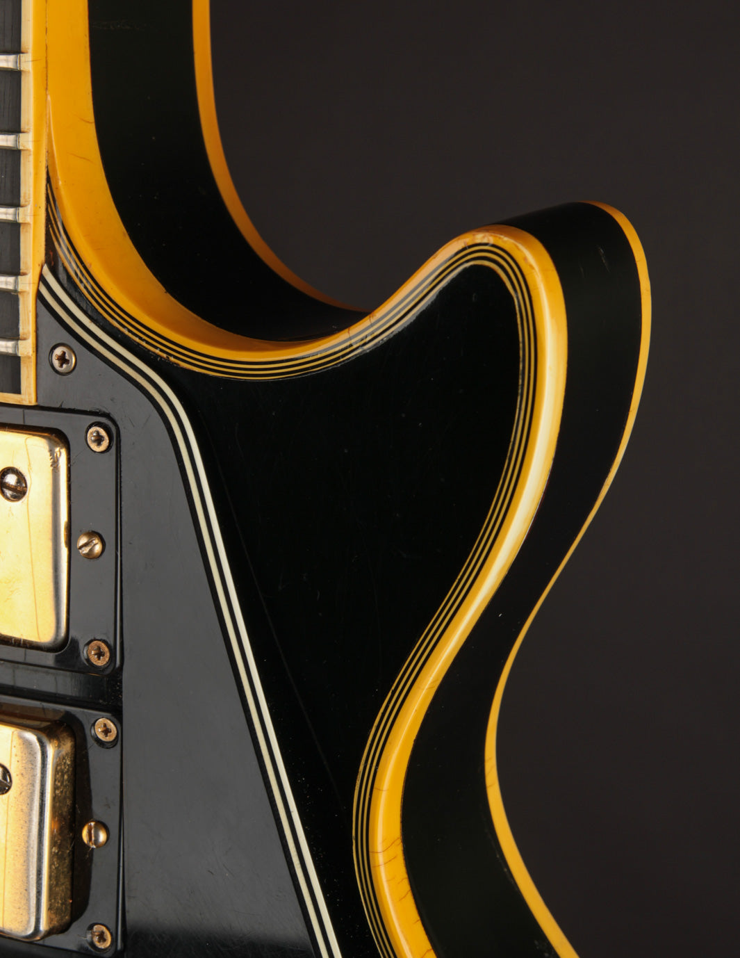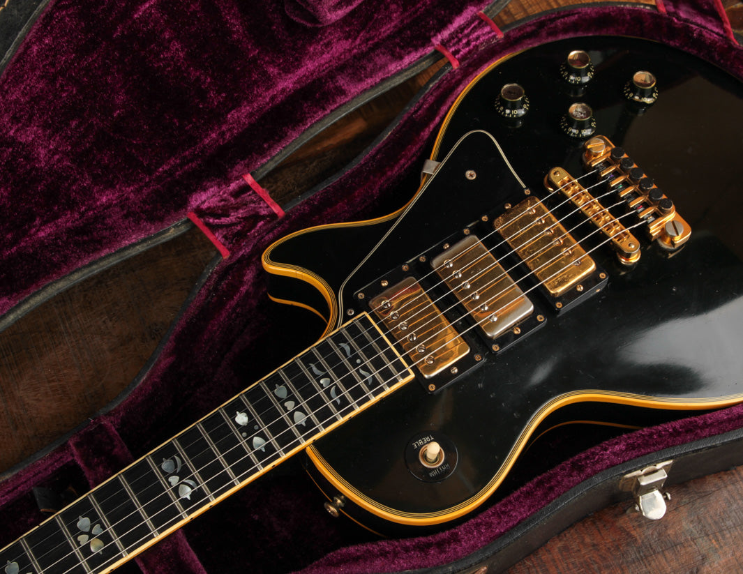 This is a lovely second-year example that's remained in very good condition, even with clear evidence it had been played and enjoyed for years. The body and neck binding have yellowed and the original Black finish has developed a bit of a lustery sheen over time. There are various nicks, dings, and scratches throughout, but no significant damage or breaks, and nothing that effects playability. All of the original gold hardware has some level of patina and wear, but there's a healthy amount of plating that remains. The pickups still have quite a bit of gold plating on their covers.