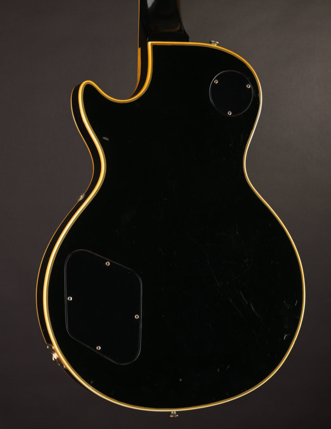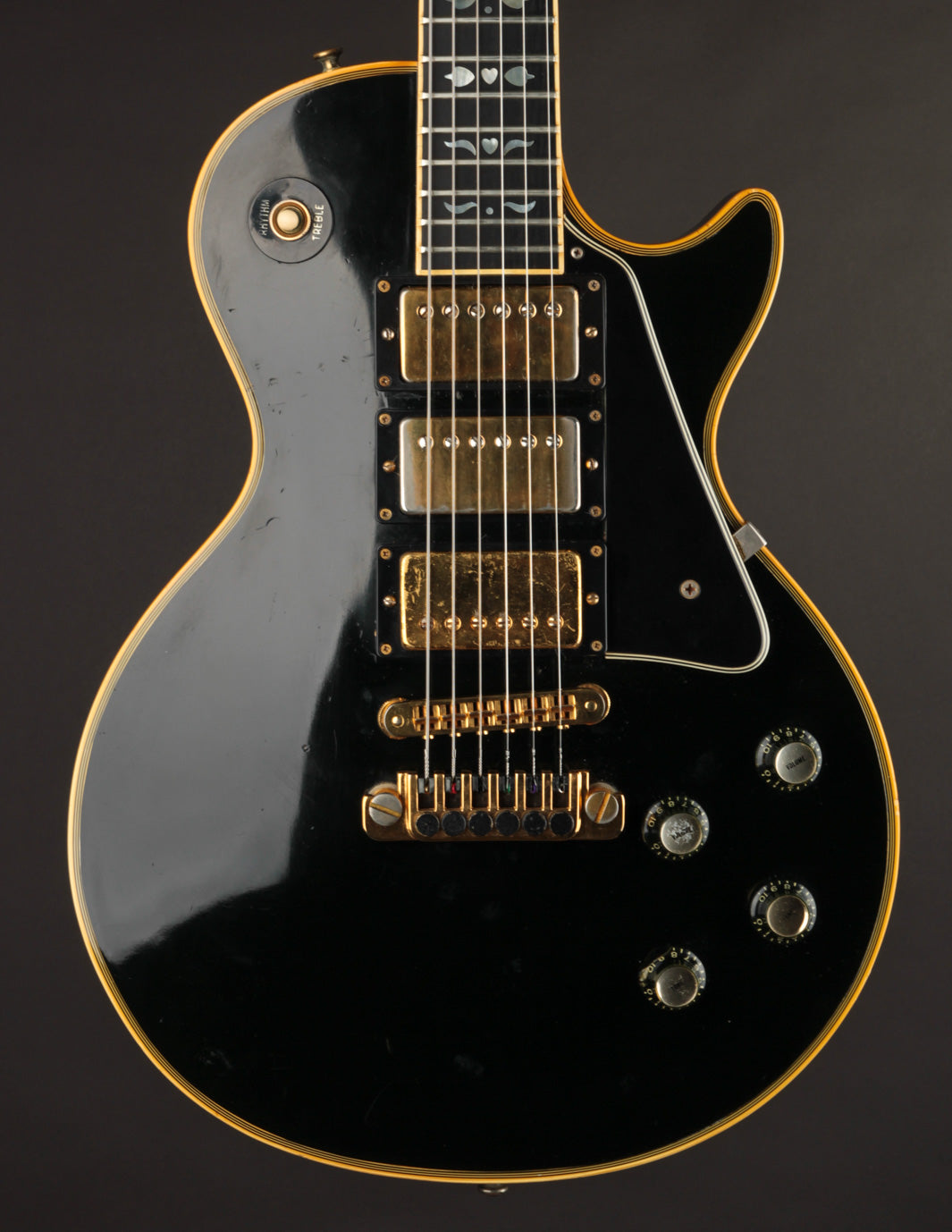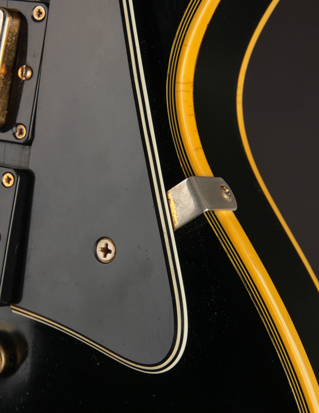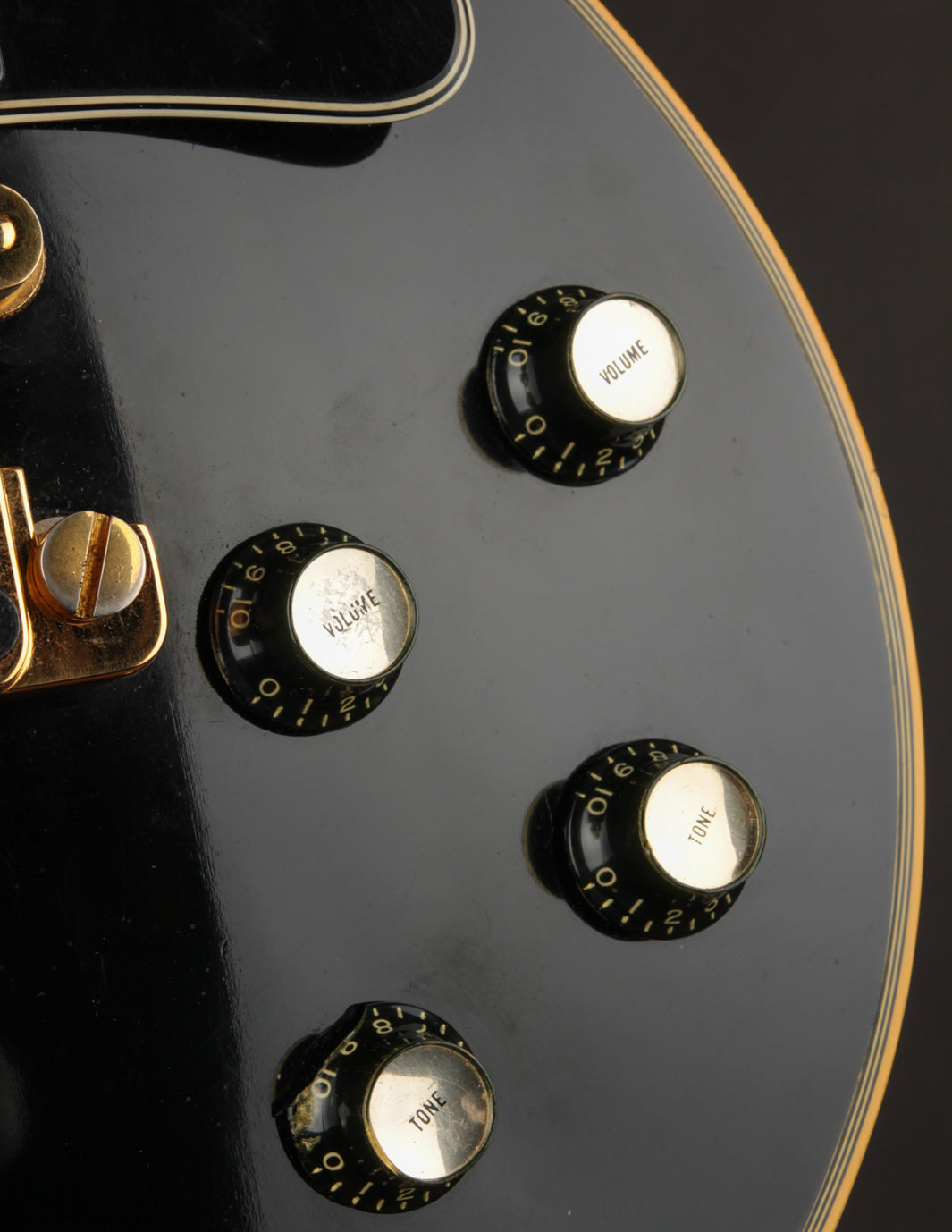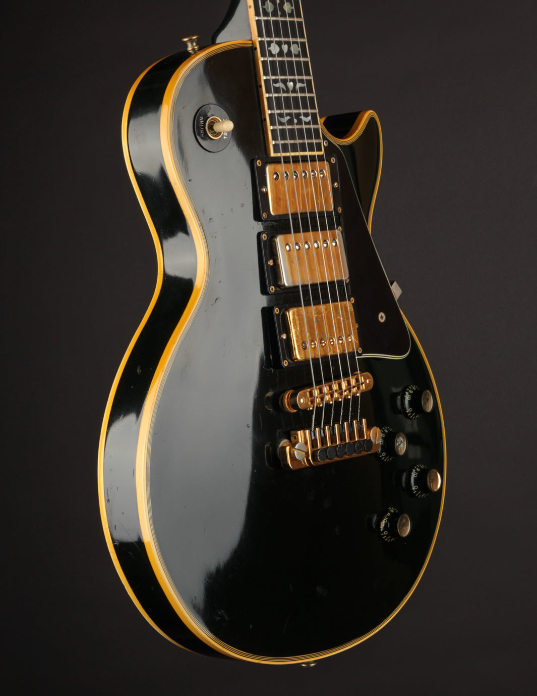 This is a lovely second-year example that's remained in very good condition, even with clear evidence it had been played and enjoyed for years. The body and neck binding have yellowed and the original Black finish has developed a bit of a lustery sheen over time. There are various nicks, dings, and scratches throughout, but no significant damage or breaks, and nothing that effects playability. All of the original gold hardware has some level of patina and wear, but there's a healthy amount of plating that remains. The pickups still have quite a bit of gold plating on their covers.