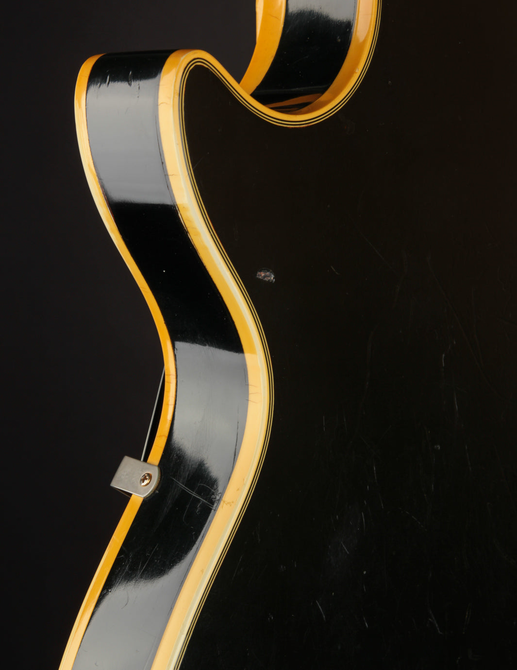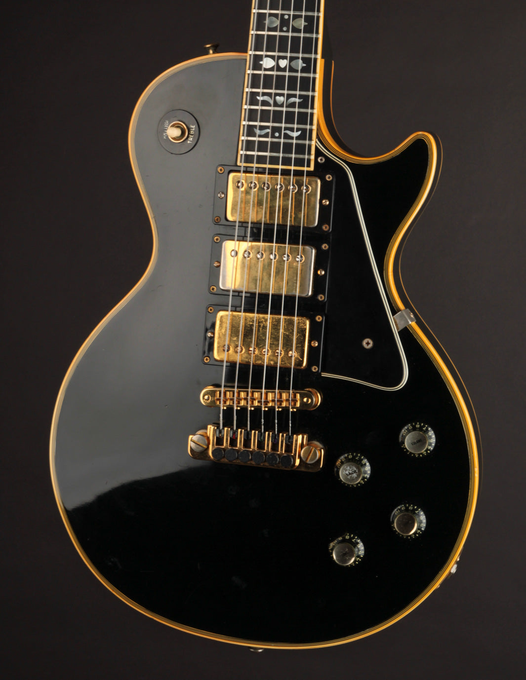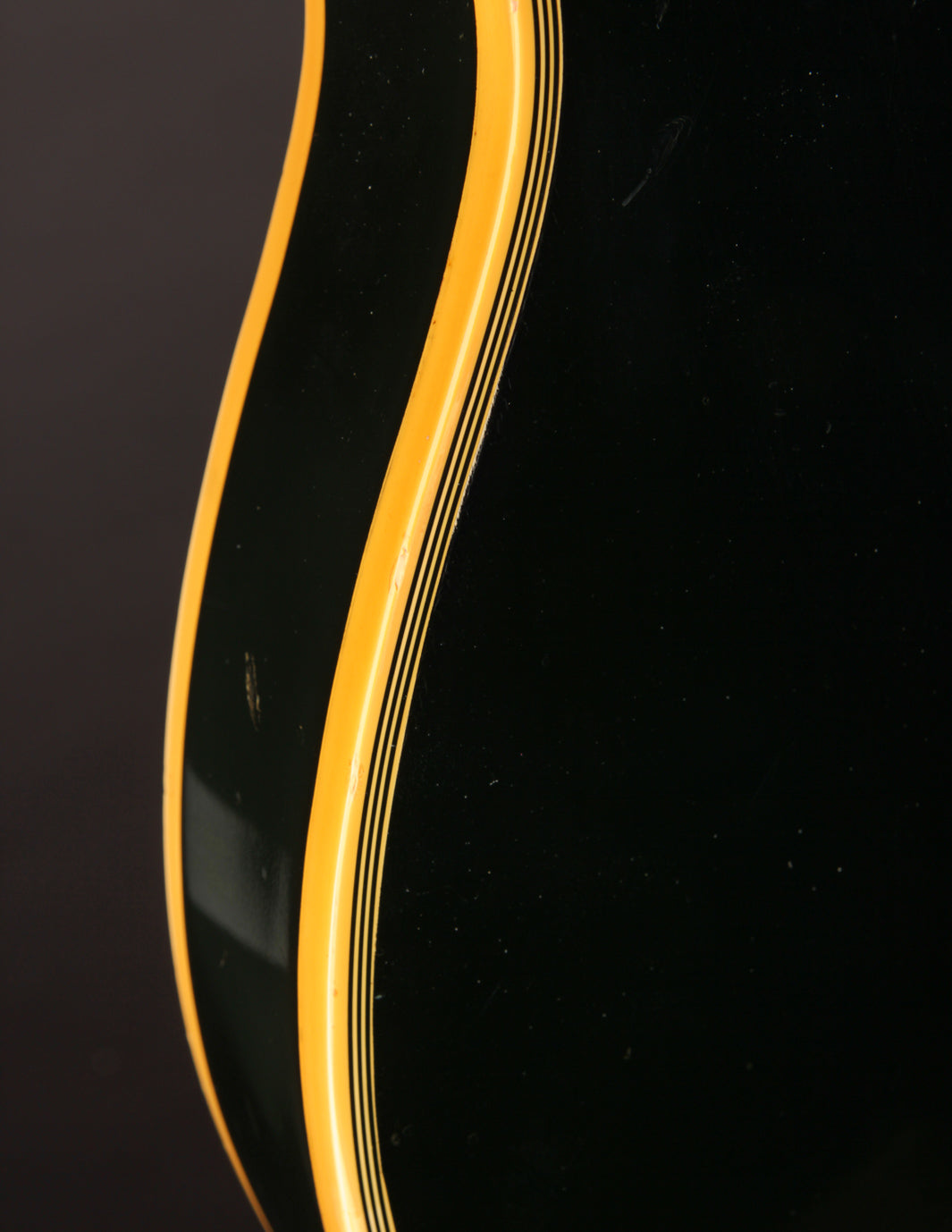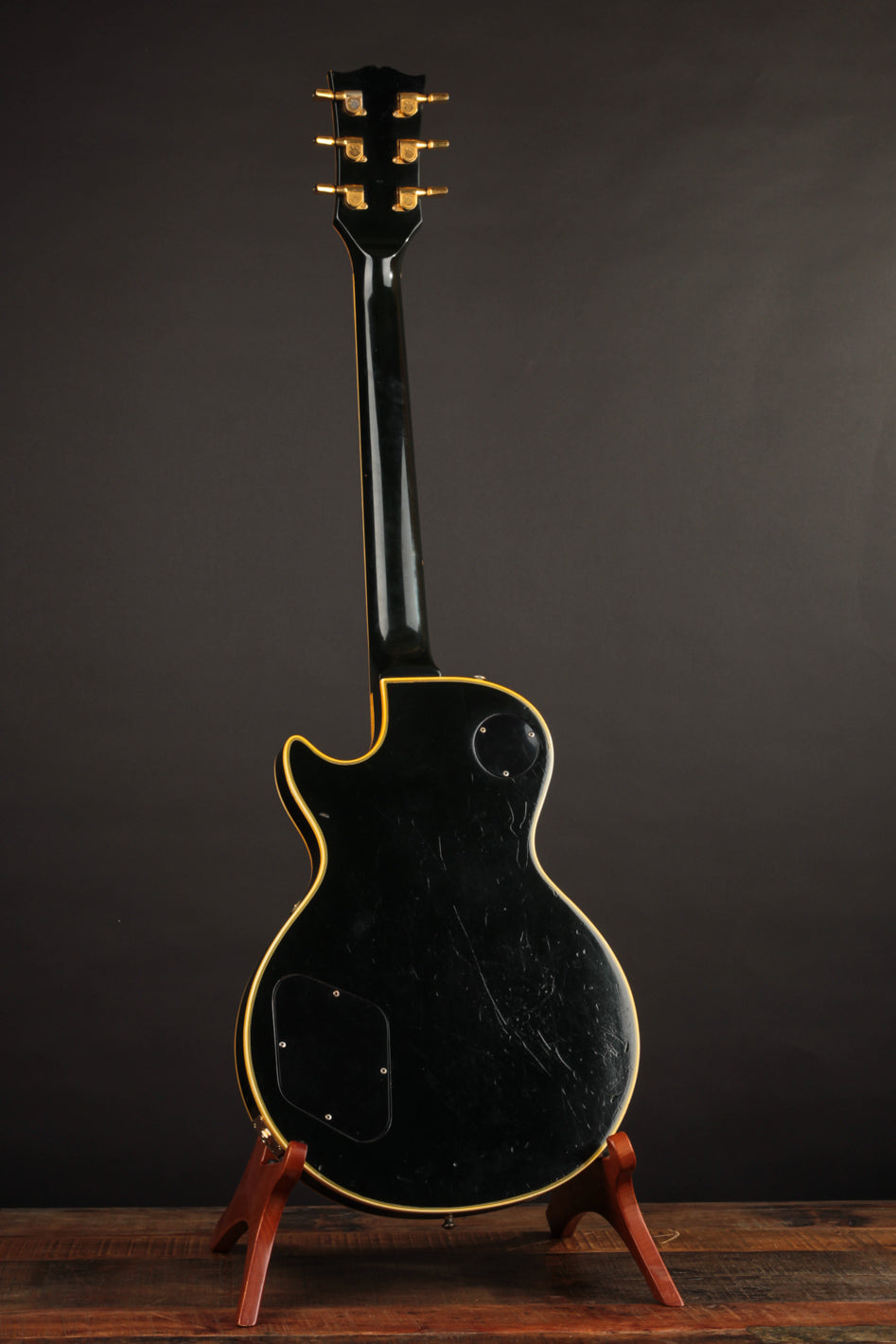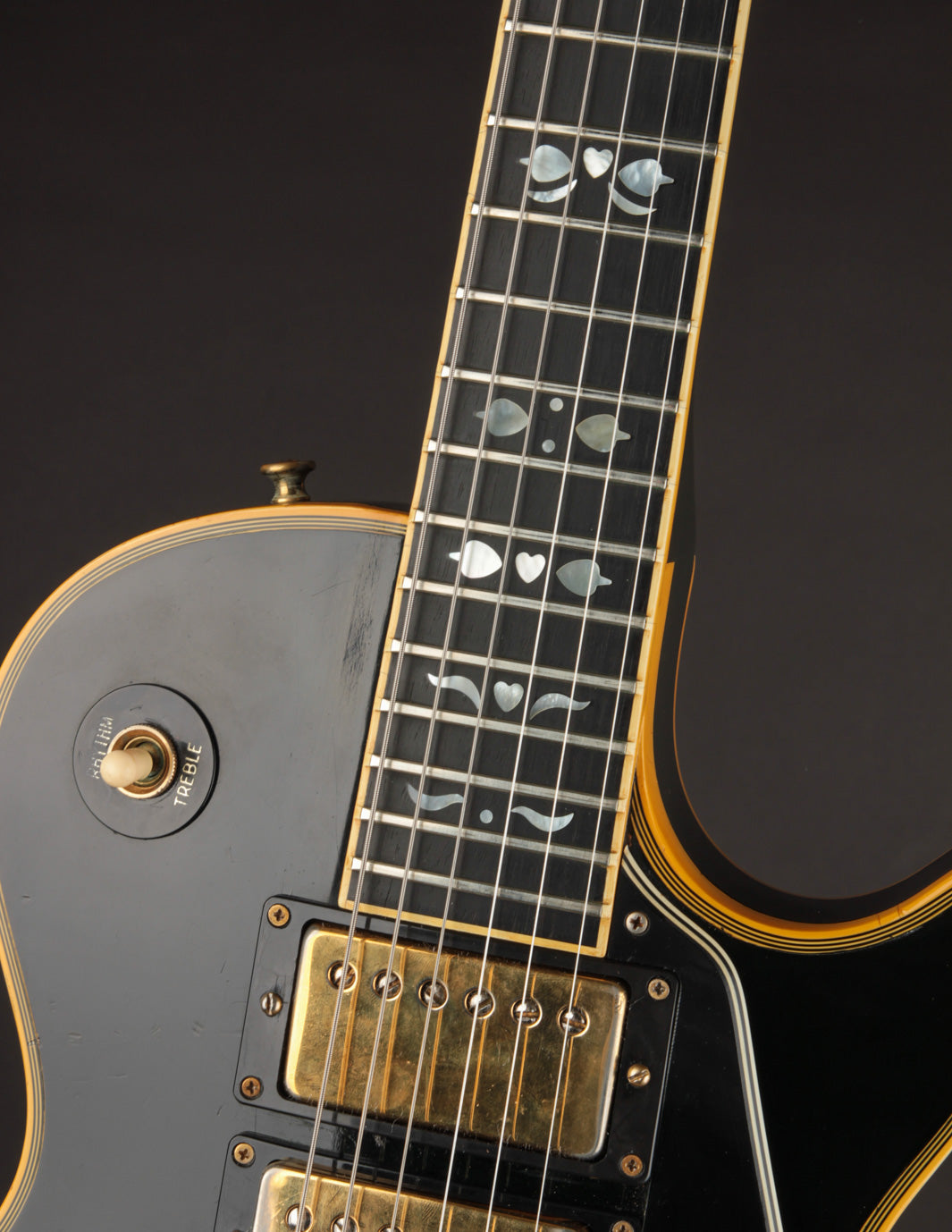 This is a lovely second-year example that's remained in very good condition, even with clear evidence it had been played and enjoyed for years. The body and neck binding have yellowed and the original Black finish has developed a bit of a lustery sheen over time. There are various nicks, dings, and scratches throughout, but no significant damage or breaks, and nothing that effects playability. All of the original gold hardware has some level of patina and wear, but there's a healthy amount of plating that remains. The pickups still have quite a bit of gold plating on their covers.