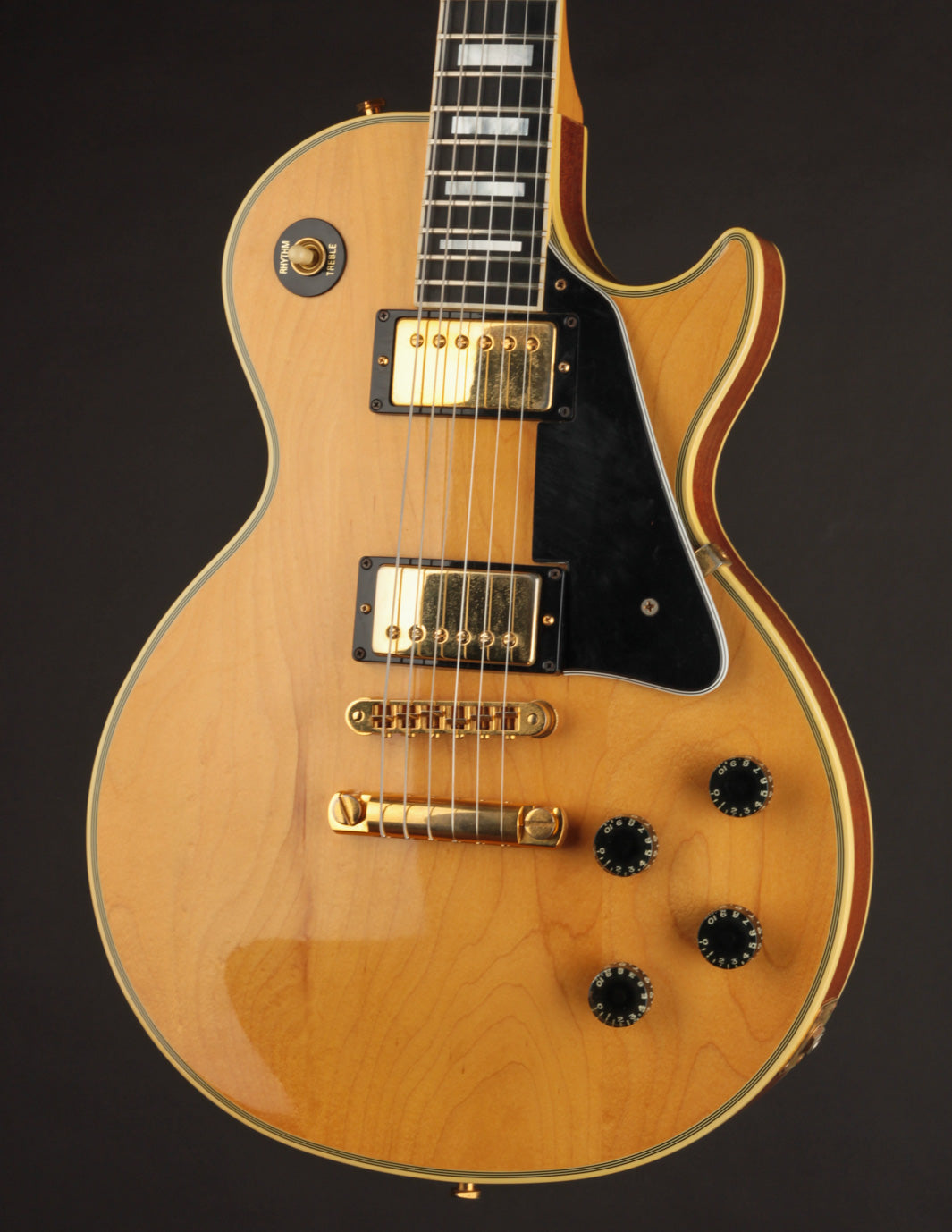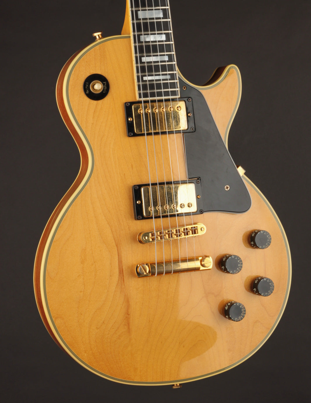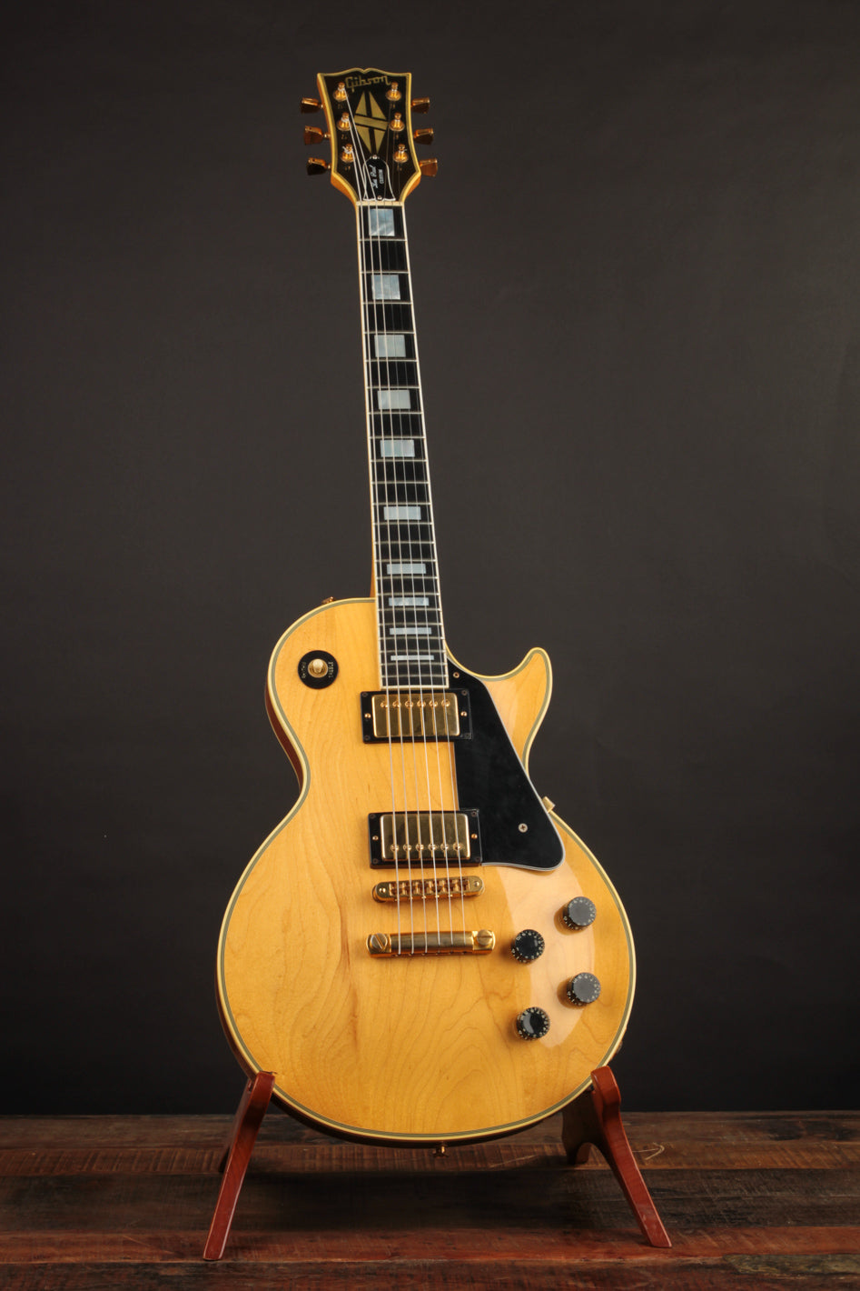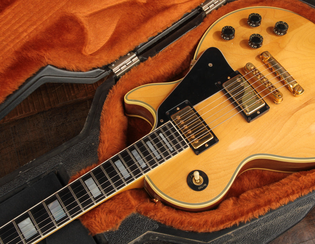 This 1982 Gibson Les Paul Custom is a great example of the short-lived Natural-topped Customs that came about at the beginning of the decade. The "custom" accoutrement like the large block fretboard inlays and gold hardware gives that au naturel top a more unique look than the more conventional Black, White, and Tobacco Sunburst finishes of the period.