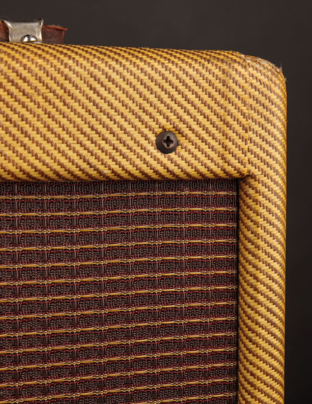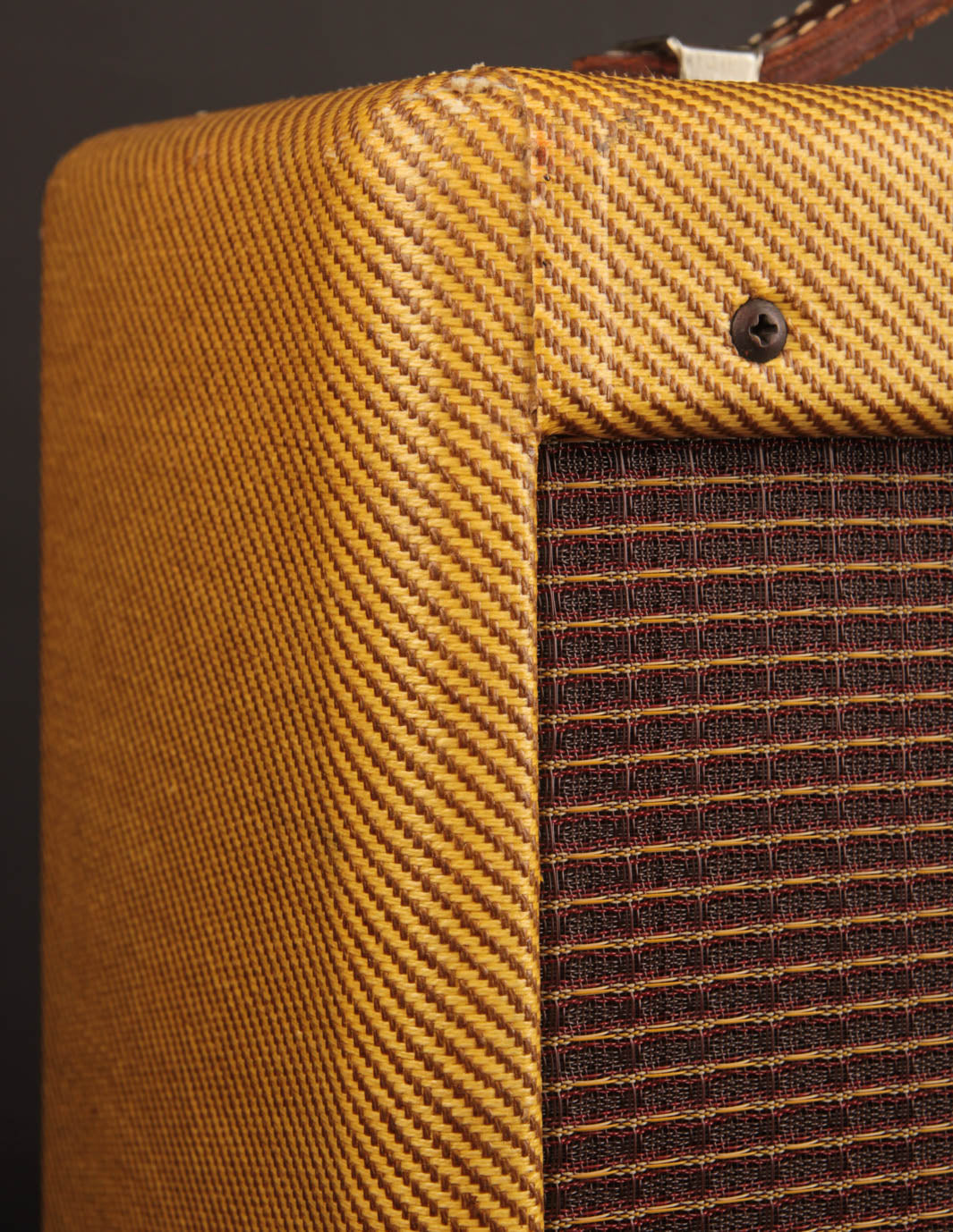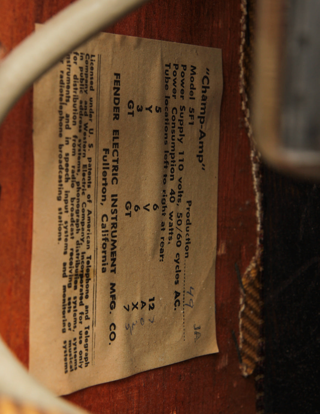 This preservationist's dream of a Tweed Champ was likely completed as 1959 drew to a close, with everything but the actual tube chart stamp showing late '59 manufacturing date codes throughout. Shirley wired up this Champ with caps dating to the 47th week of '59 and installed its power tube dated to the 48th week of '59.