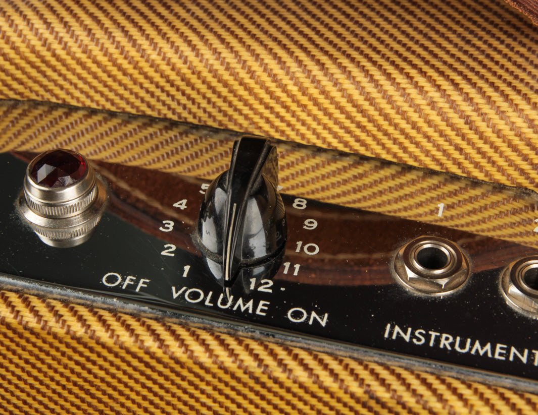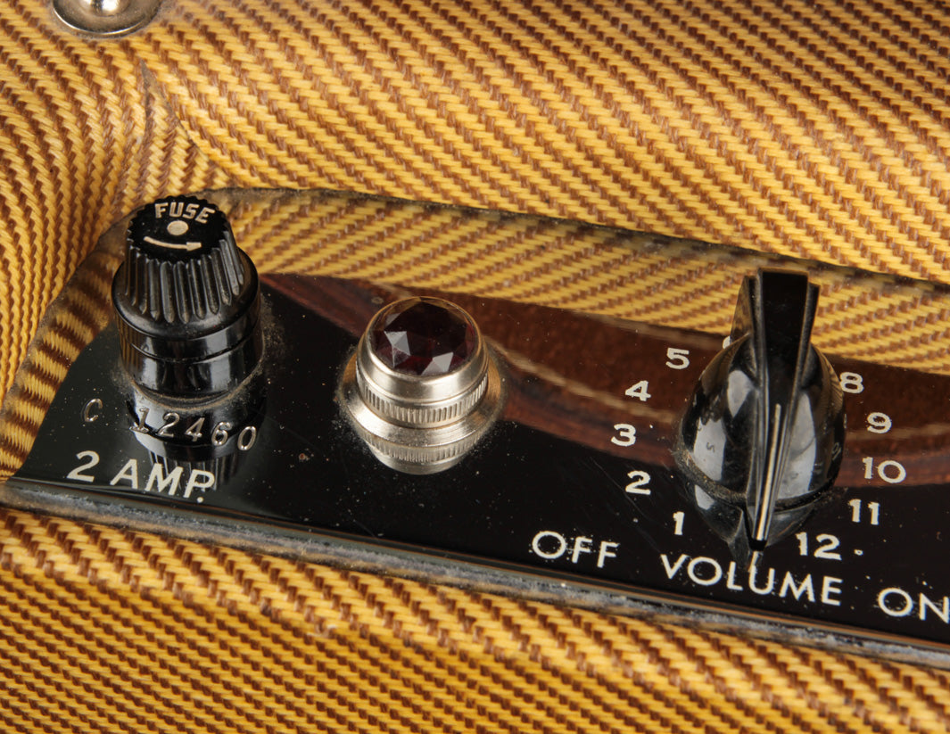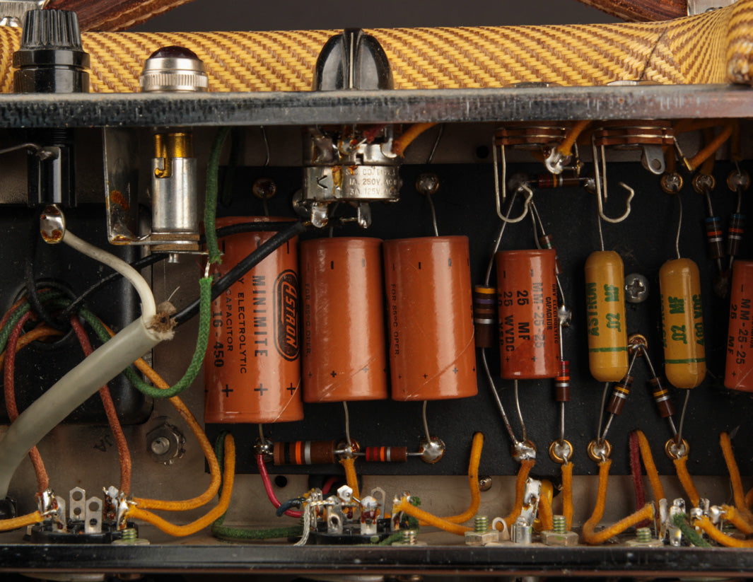 This preservationist's dream of a Tweed Champ was likely completed as 1959 drew to a close, with everything but the actual tube chart stamp showing late '59 manufacturing date codes throughout. Shirley wired up this Champ with caps dating to the 47th week of '59 and installed its power tube dated to the 48th week of '59.