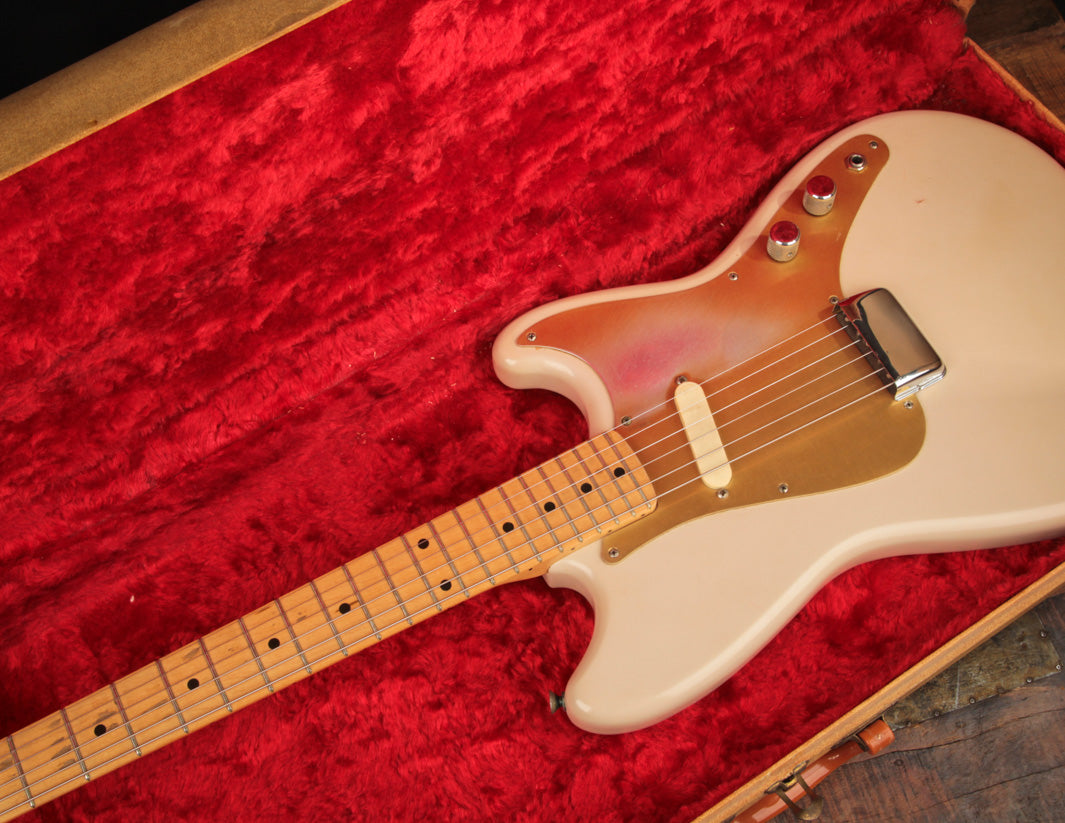 This 1956 Fender Musicmaster is one of the finer student model electrics made during Fender's heyday. With its unique aesthetic of Desert Sand body finish, anodized aluminum gold pickguard, and Maple neck, it's just as attention-grabbing as its older siblings in our book. The short scale, amazing V neck, and lightness of build undoubtedly made it an easy option for the youth of yesteryear. For vintage electric fans, the Musicmaster has remained largely accessible and affordable, especially when compared to the likes of the Jazzmaster, Stratocaster, and Telecaster.