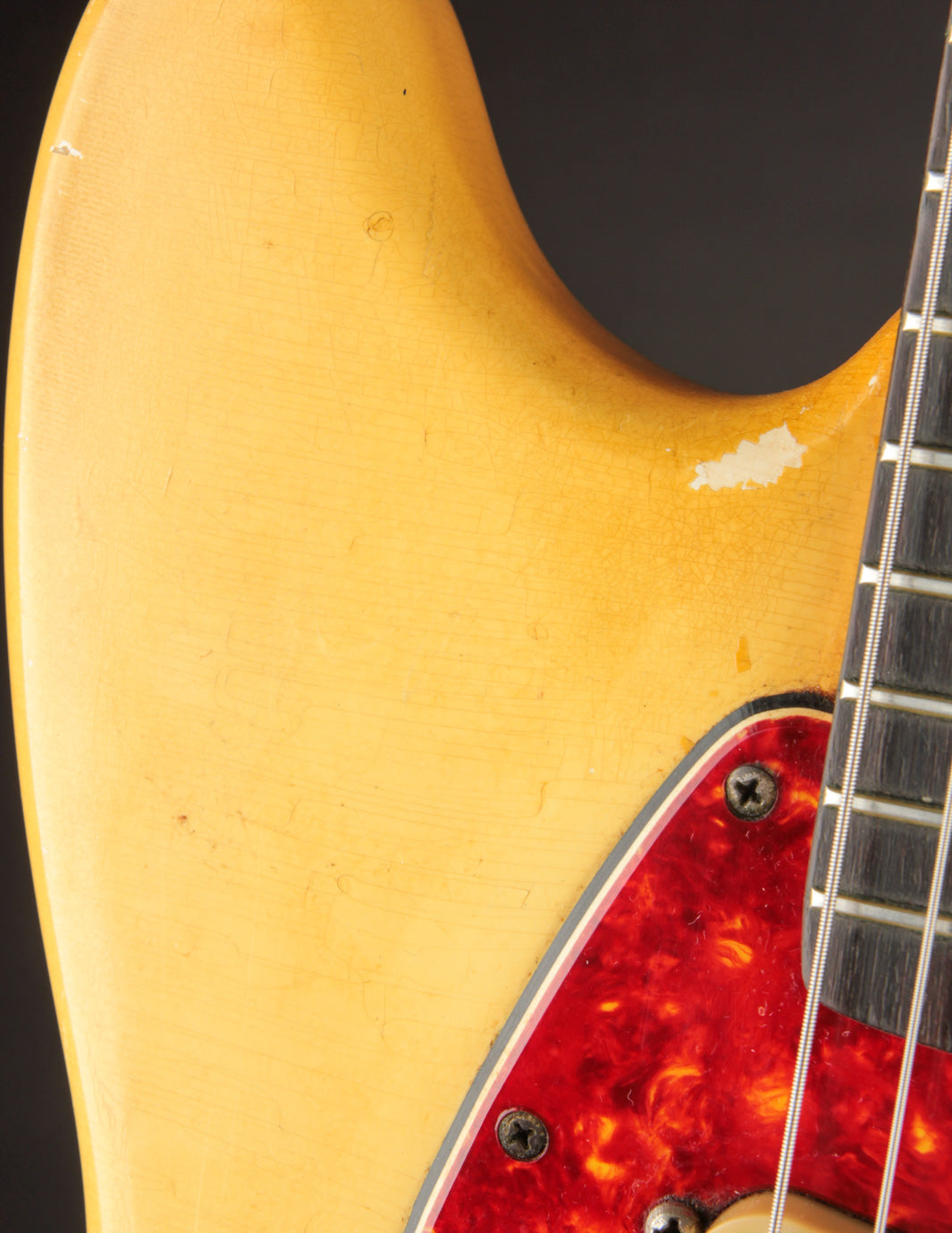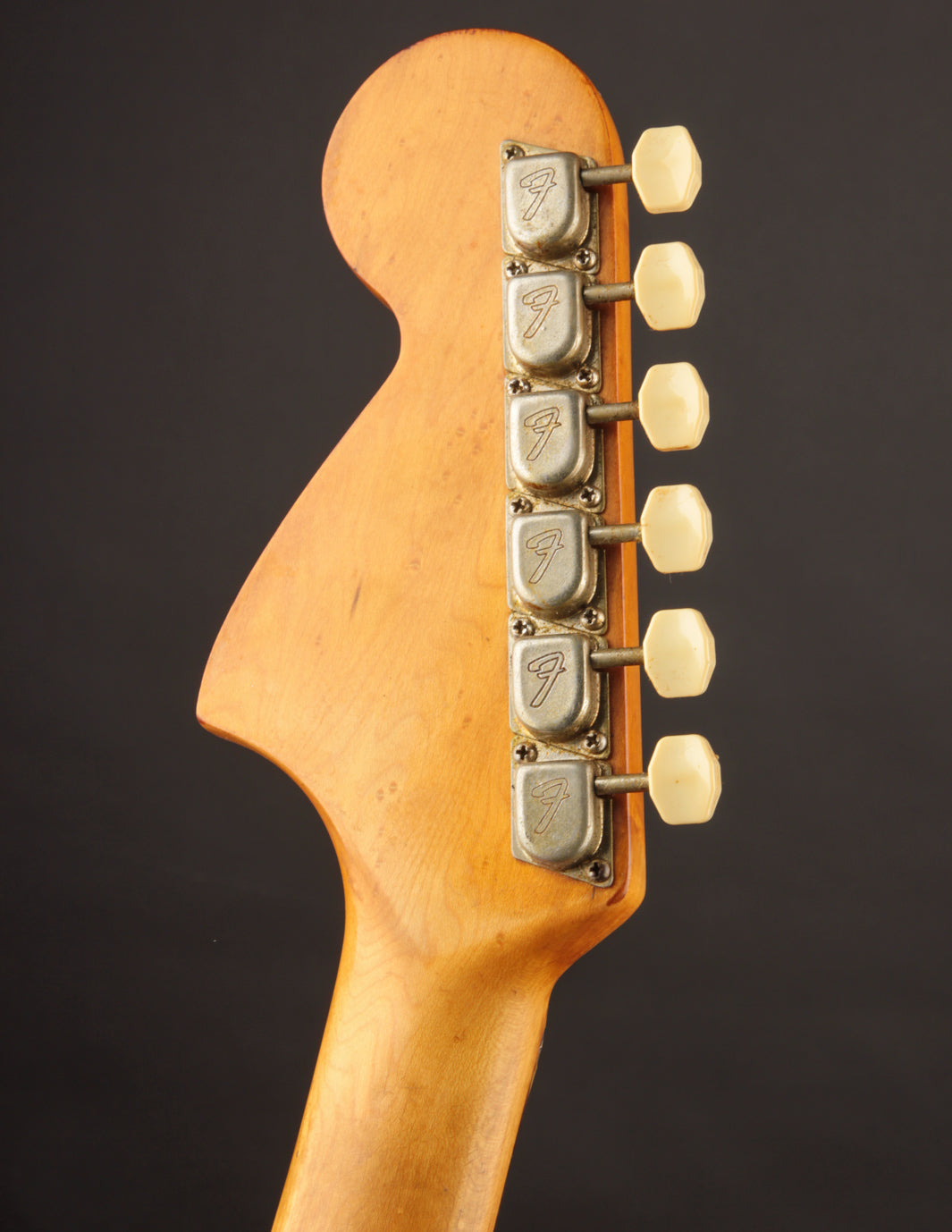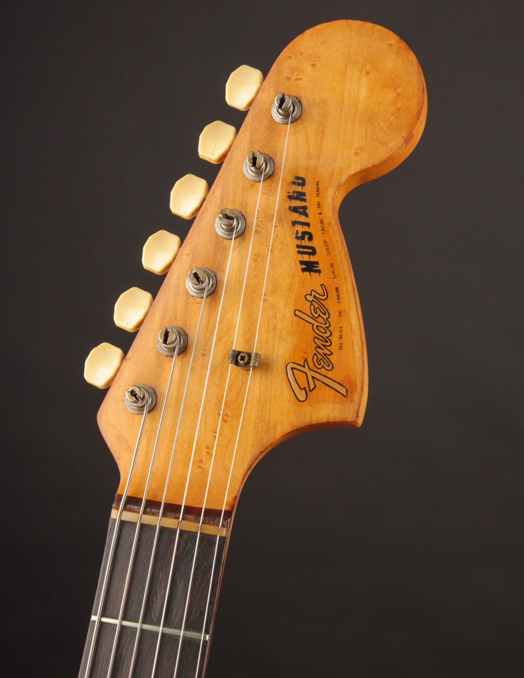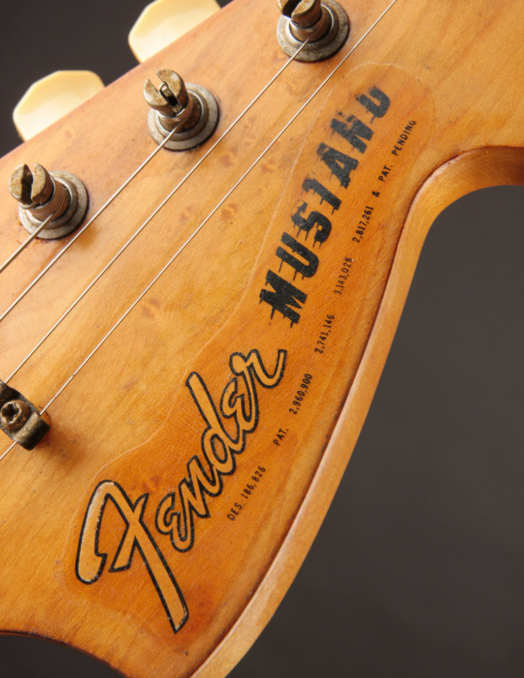 This Mustang has survived nearly 60 years in its original and unmodified state, including the frets! There was some evidence of old varnish overspray on the peghead and on the back of the neck, likely to protect some of the areas that were exhibiting lacquer wear. It was amateur work at best, and with some delicate cleaning here in our shop, we were able safely remove it without disturbing the lacquer.