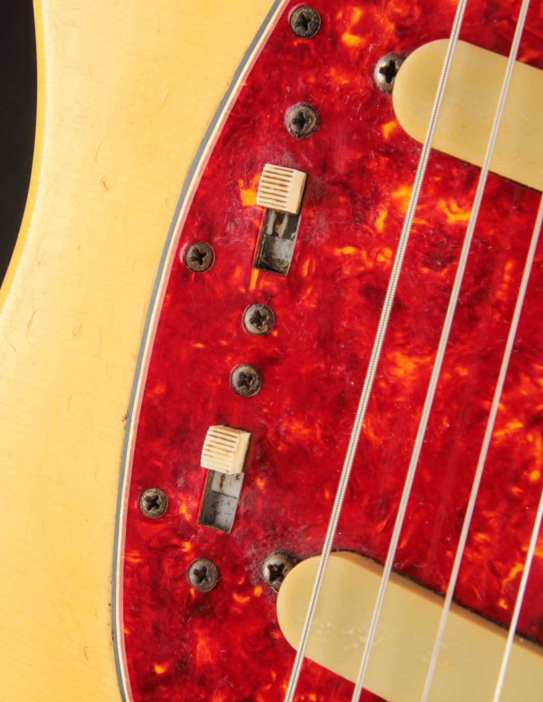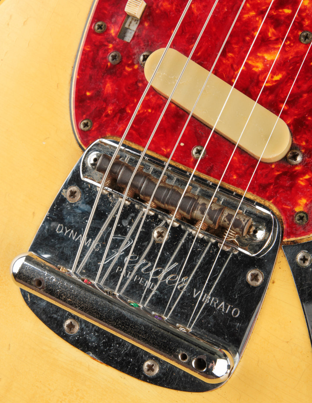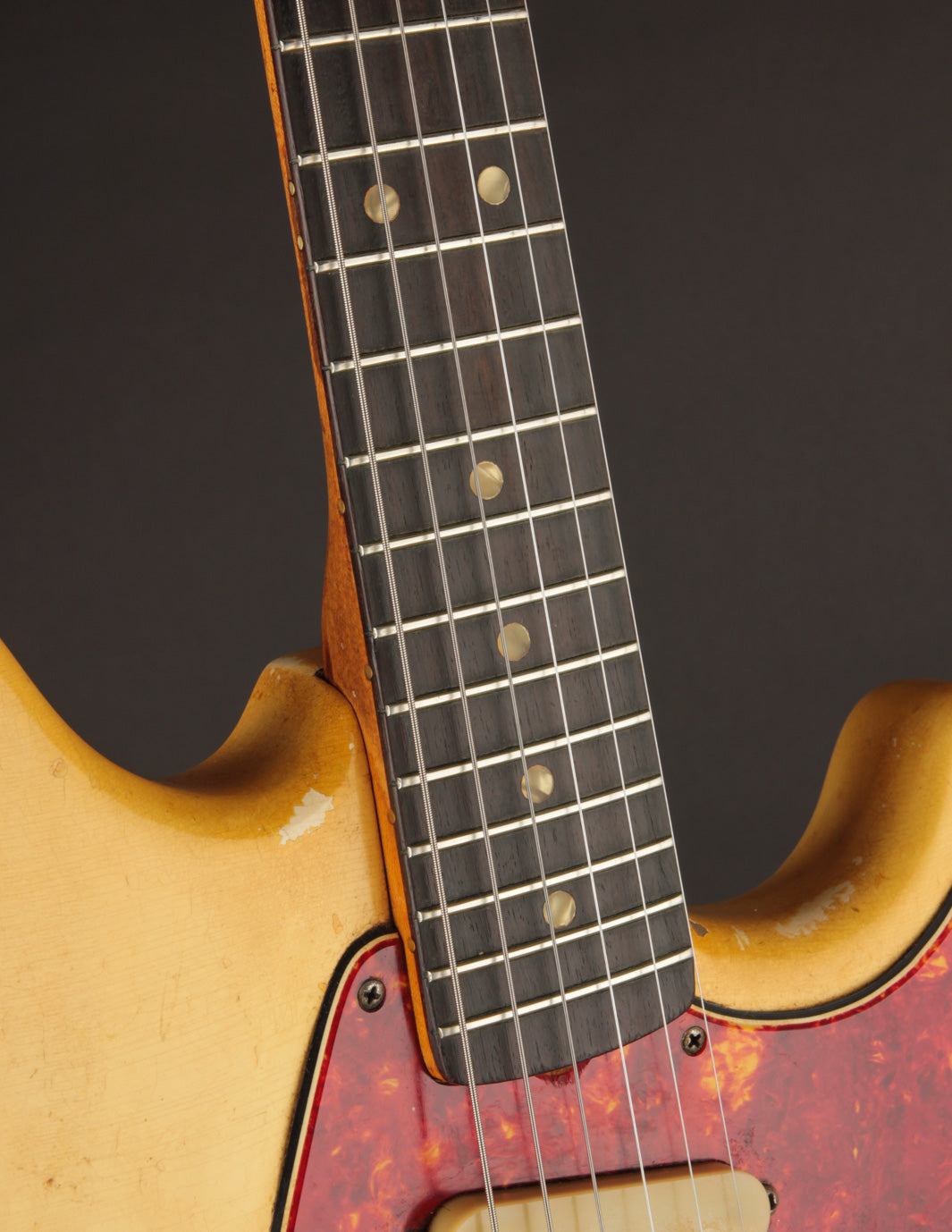 This Mustang has survived nearly 60 years in its original and unmodified state, including the frets! There was some evidence of old varnish overspray on the peghead and on the back of the neck, likely to protect some of the areas that were exhibiting lacquer wear. It was amateur work at best, and with some delicate cleaning here in our shop, we were able safely remove it without disturbing the lacquer.