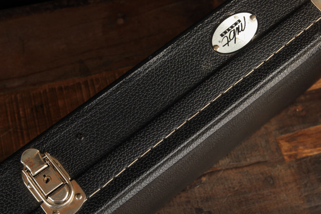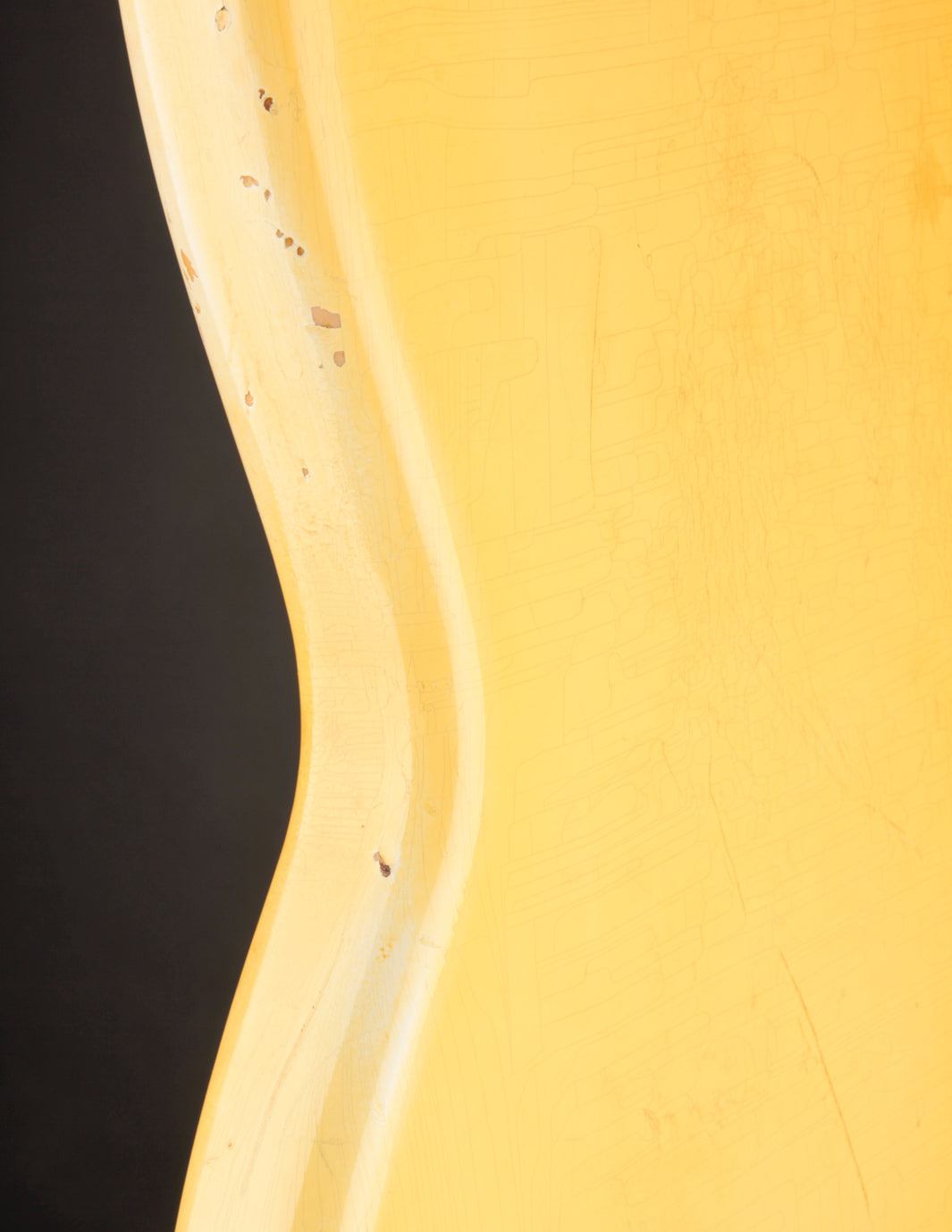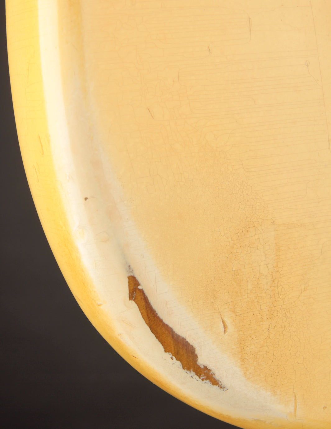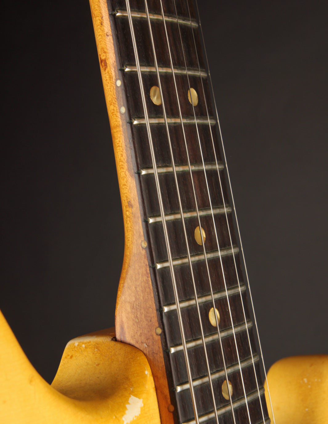 This Mustang has survived nearly 60 years in its original and unmodified state, including the frets! There was some evidence of old varnish overspray on the peghead and on the back of the neck, likely to protect some of the areas that were exhibiting lacquer wear. It was amateur work at best, and with some delicate cleaning here in our shop, we were able safely remove it without disturbing the lacquer.