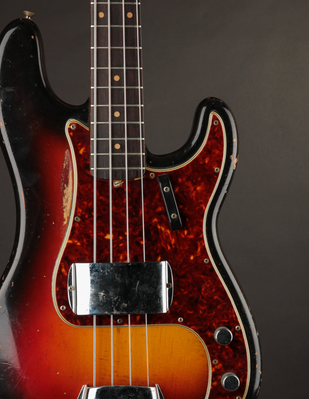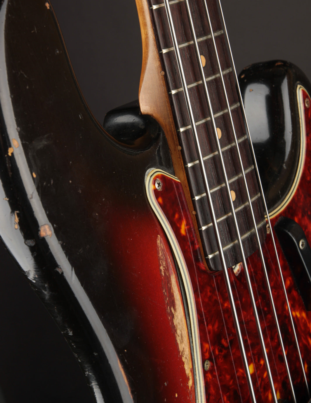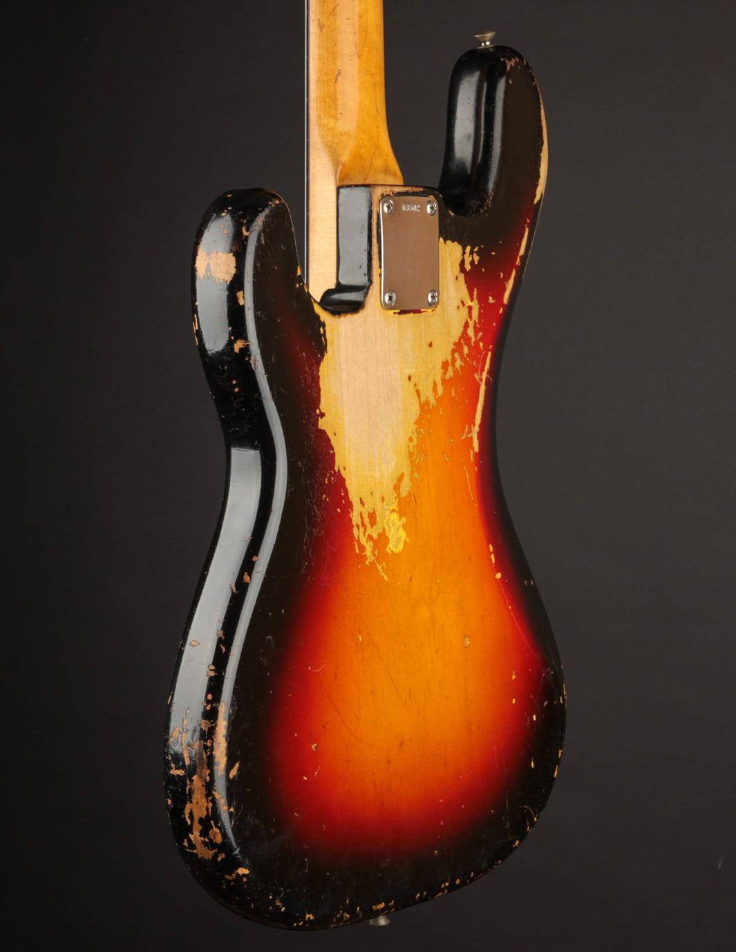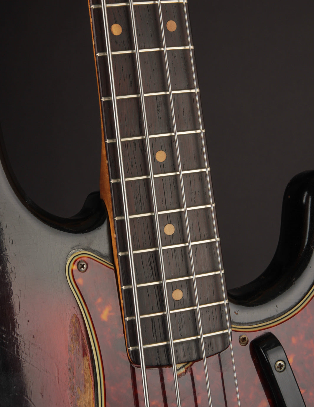 It's clear this bass was a good one from the start, as it bears some of the coolest true play wear you're going to find on a vintage Fender. Still, the 3-tone Sunburst hasn't totally faded out, maintaining a really vibrant and dynamic look. The original tortoise pickguard is also in excellent condition with very little signs of shrinkage. The original brown hardshell case is in impressively good condition as well, with both a clean interior and exterior.