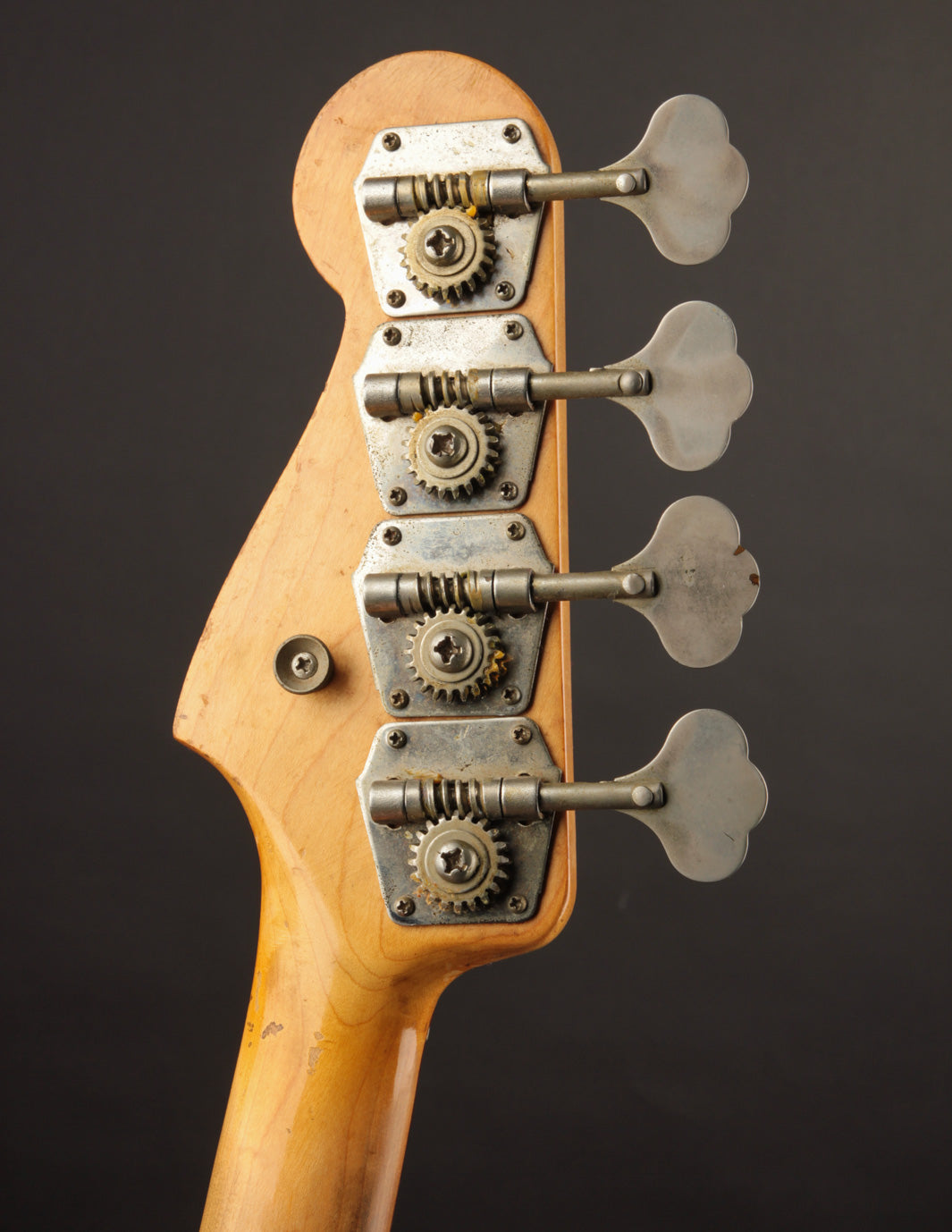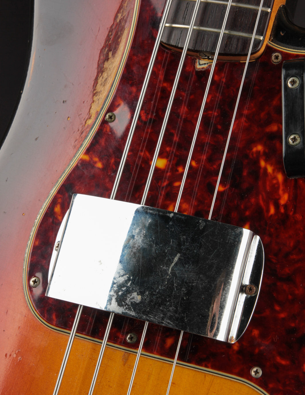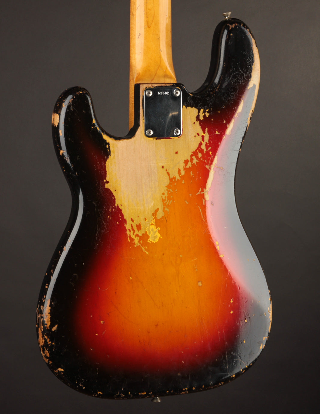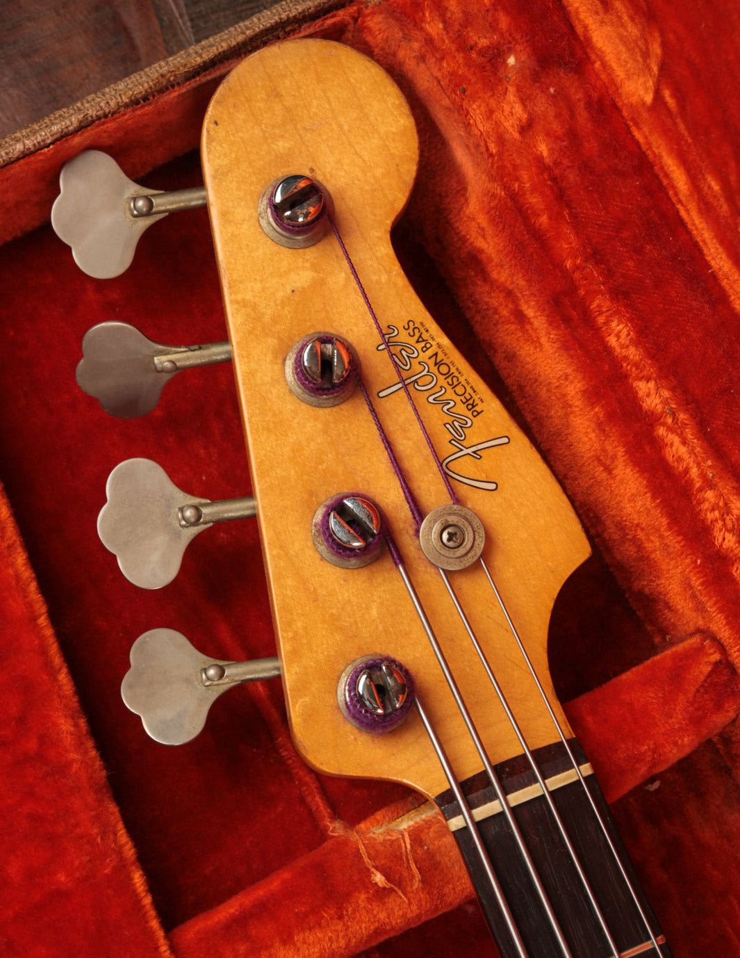 It's clear this bass was a good one from the start, as it bears some of the coolest true play wear you're going to find on a vintage Fender. Still, the 3-tone Sunburst hasn't totally faded out, maintaining a really vibrant and dynamic look. The original tortoise pickguard is also in excellent condition with very little signs of shrinkage. The original brown hardshell case is in impressively good condition as well, with both a clean interior and exterior.