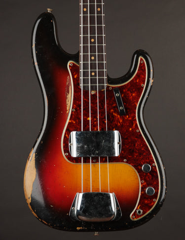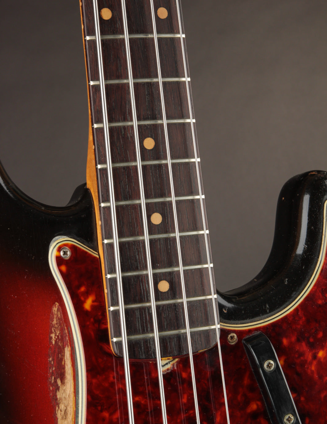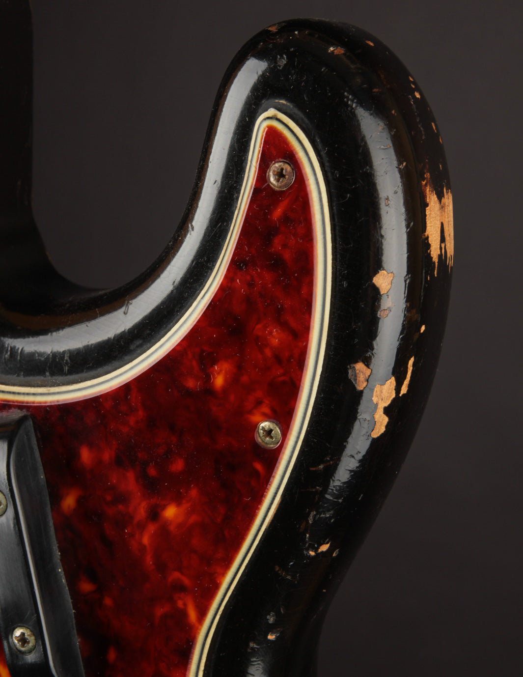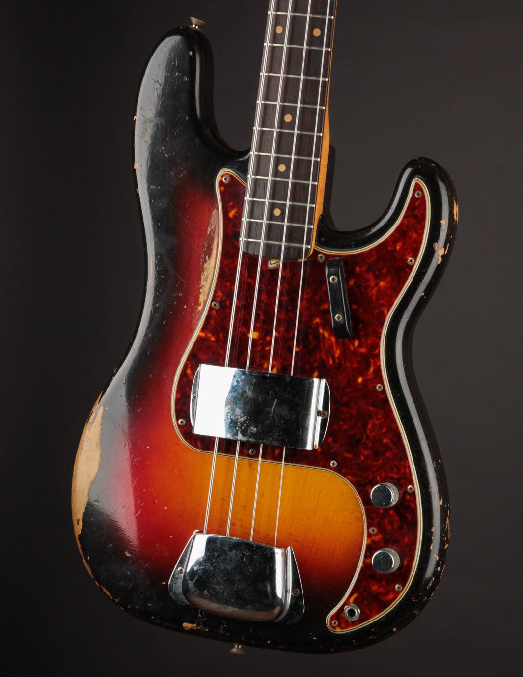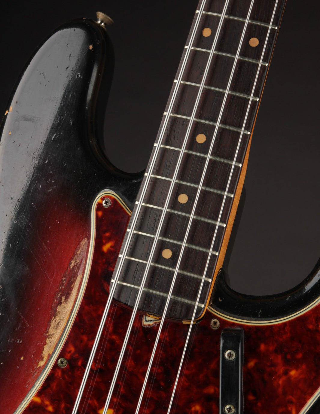 It's clear this bass was a good one from the start, as it bears some of the coolest true play wear you're going to find on a vintage Fender. Still, the 3-tone Sunburst hasn't totally faded out, maintaining a really vibrant and dynamic look. The original tortoise pickguard is also in excellent condition with very little signs of shrinkage. The original brown hardshell case is in impressively good condition as well, with both a clean interior and exterior.