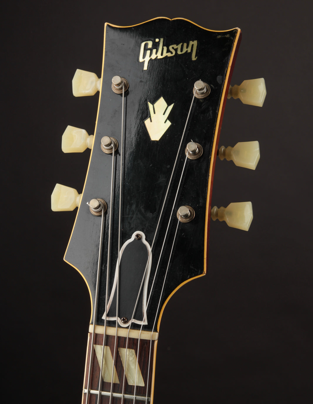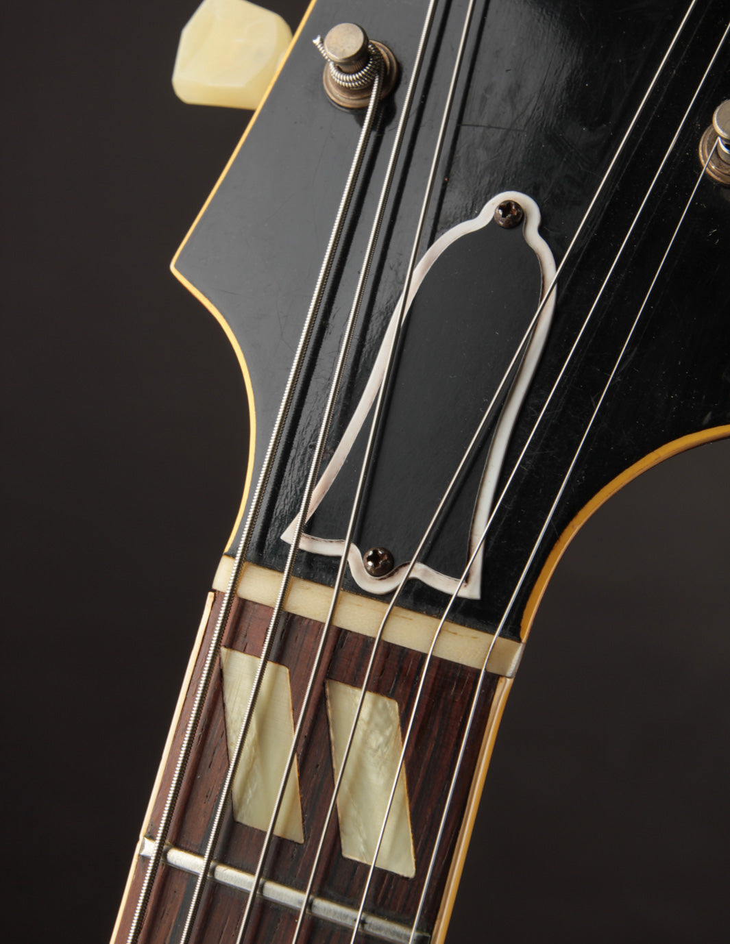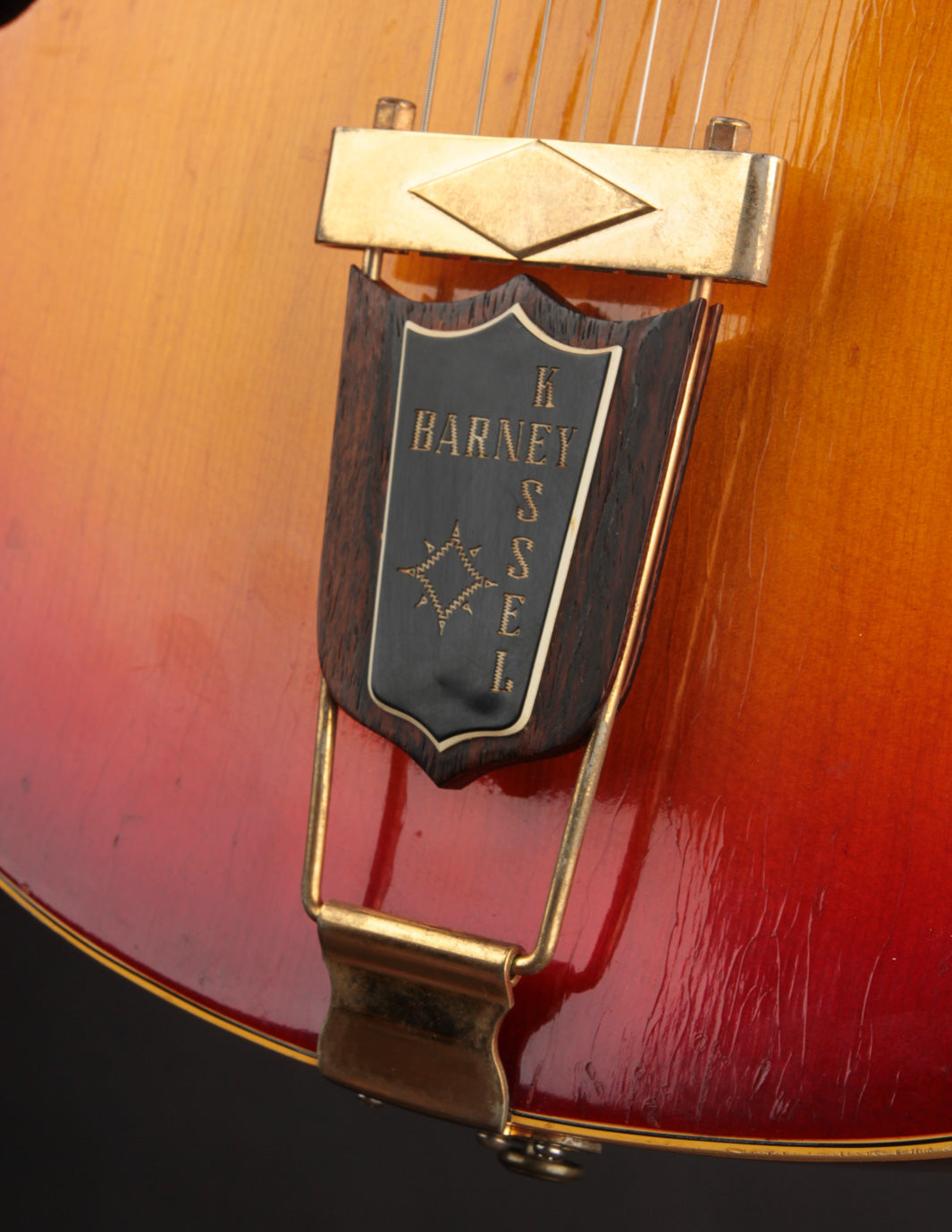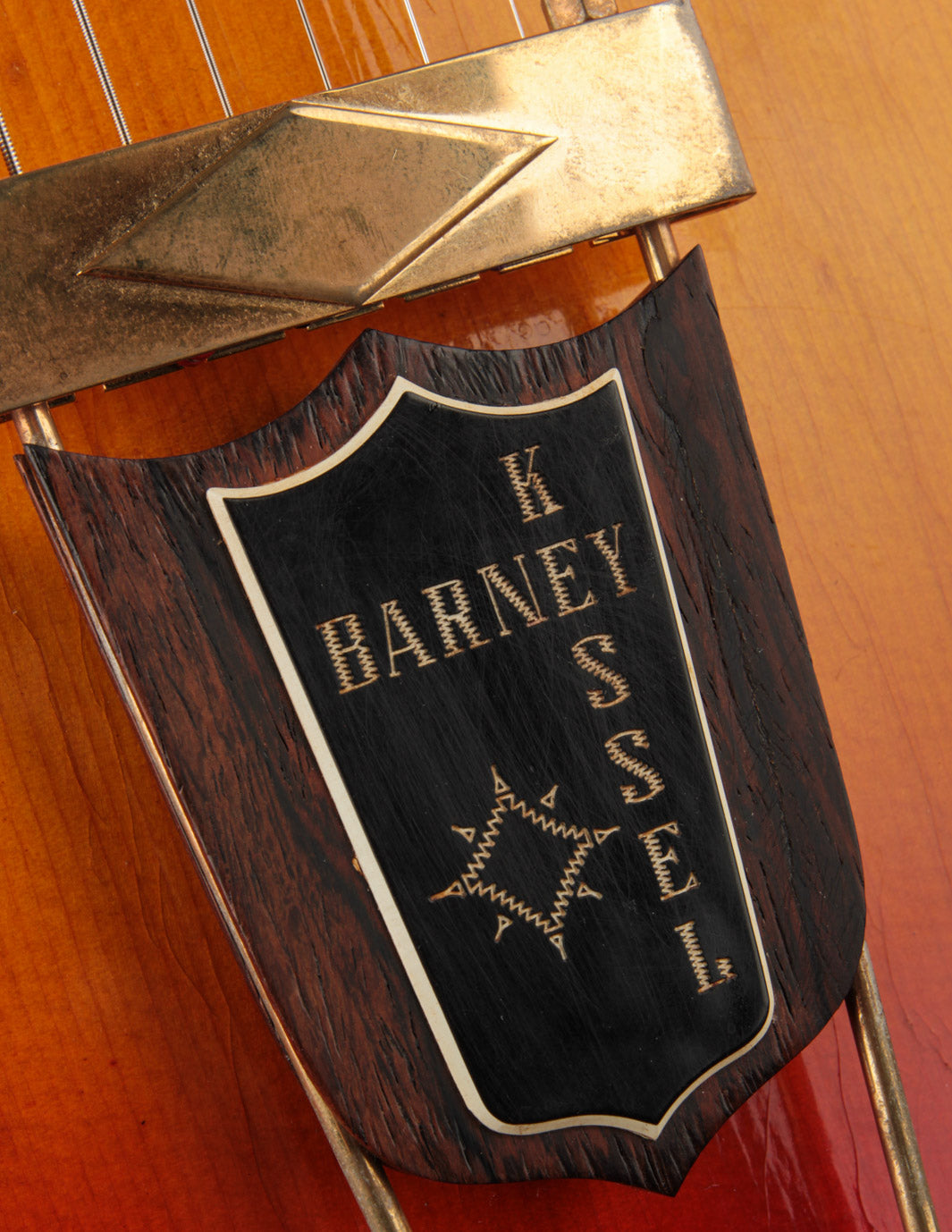 The parallelogram inlays find their way onto the Brazilian Rosewood fingerboard like they do on many of the electric archtops of the time, and this model is one of just a few to receive the wooden tailpiece badge with custom 'Barney Kessel' plaque attached. The larger, more dramatically flared headstock is also a look that's rather unique to the model, and keeps in line dimensionally with the body.