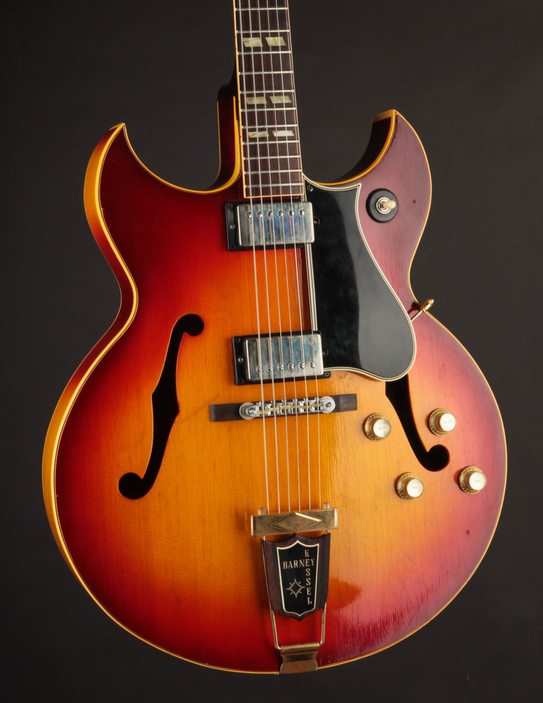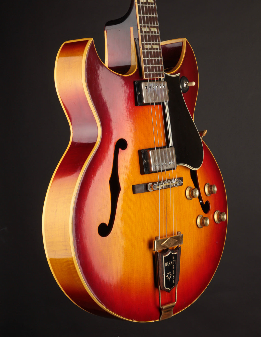 As is often the case with many of these great professional-grade archtop electrics from the early 60s, this Barney Kessel Regular was harvested for its very valuable original parts, including what would've likely been PAF pickups (or early Patent # pickups) pickup rings, wiring harness, and knobs. This one fell victim to it, but efforts were made to restore some of its original tone and vibe.The guitar has a very high quality modern wiring harness installed, tied into a pair of original Gibson Patent # T-Top humbuckers that sound sublime! The pickup covers and rings and knobs are aftermarket, and the tuners are quality vintage style reproductions. The ABR-1 bridge is a replacement, but the pickguard and tailpiece are original.