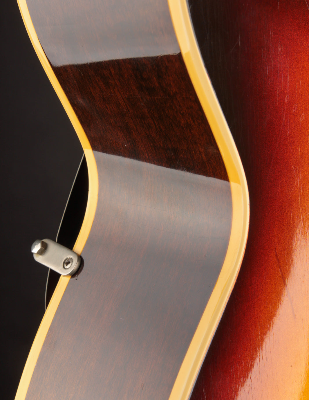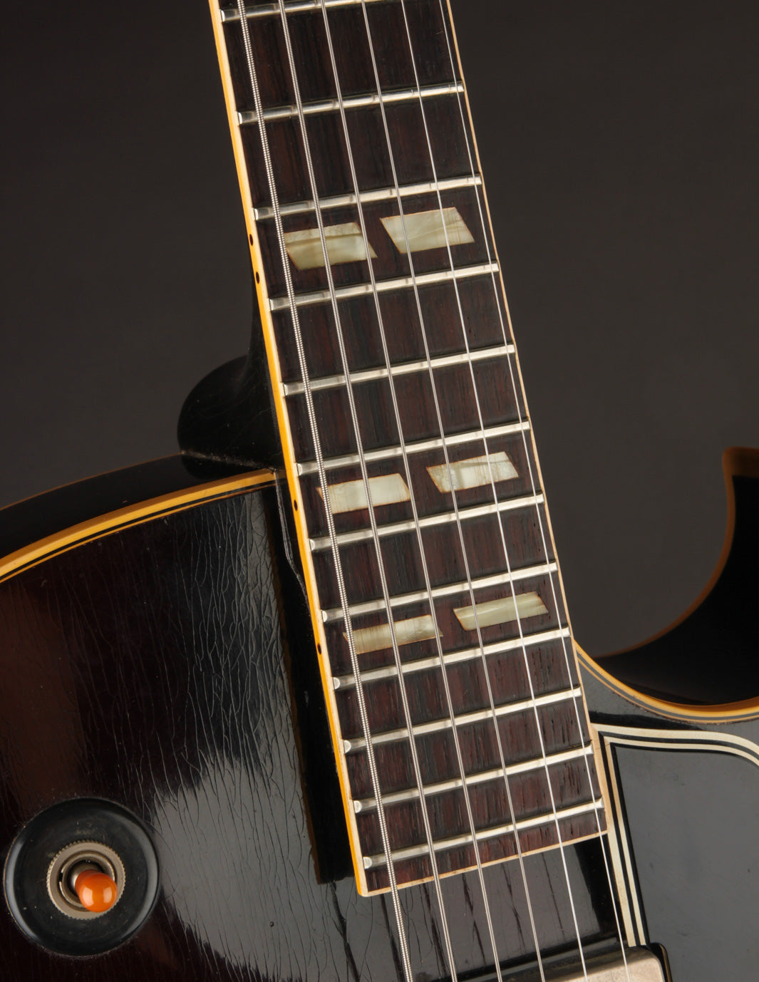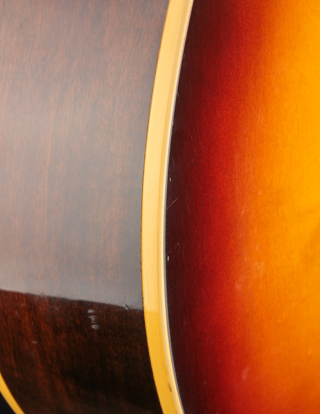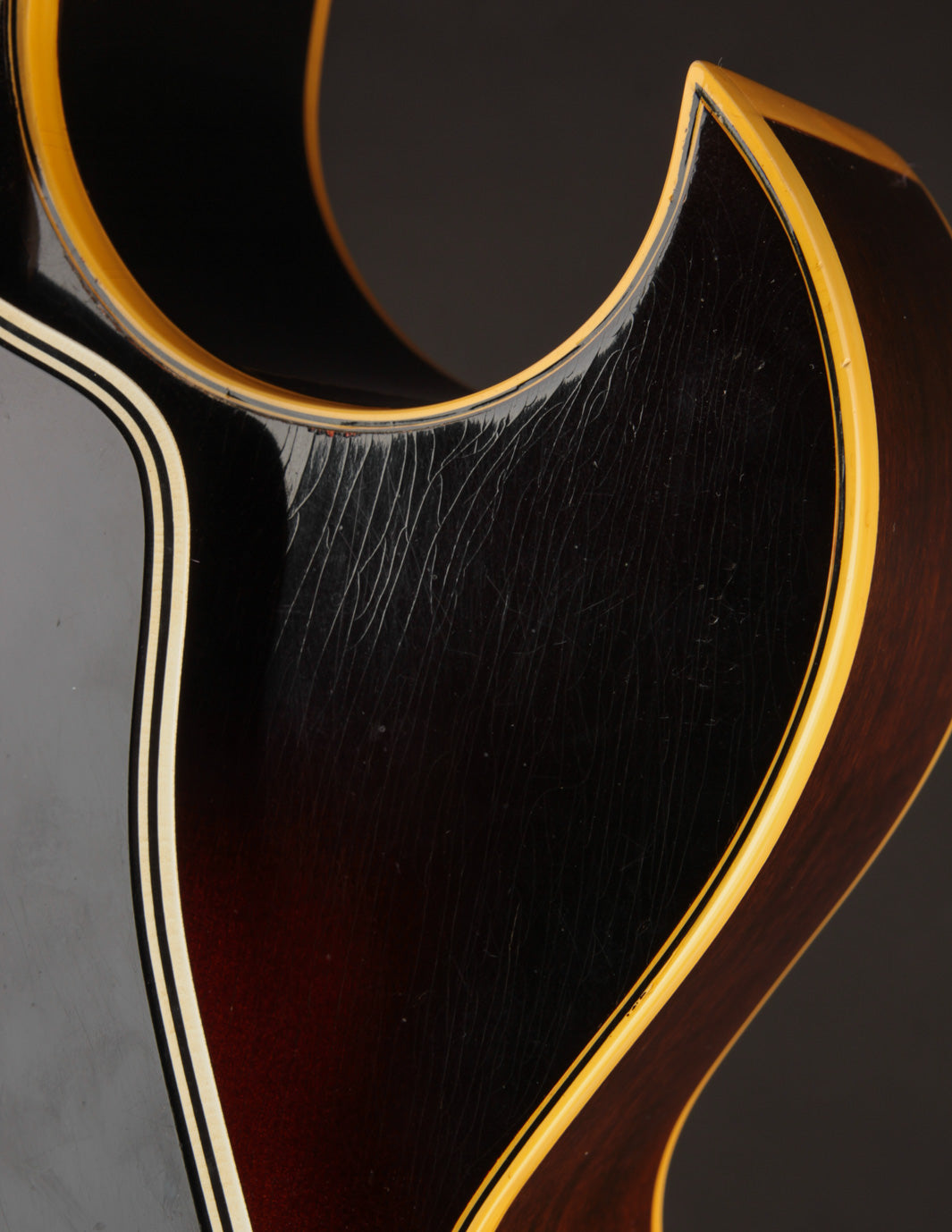 As you can tell from the photos, this ES-175 is exceptionally clean. If it weren't for the replaced tuners and a small repaired laminate crack on the back, in fact, this would be very close to being NOS. The 3-tone Sunburst is superb, with all hues wonderfully represented without any real fading. The original nitrocellulose lacquer is also very clean, with light lacquer checking throughout.