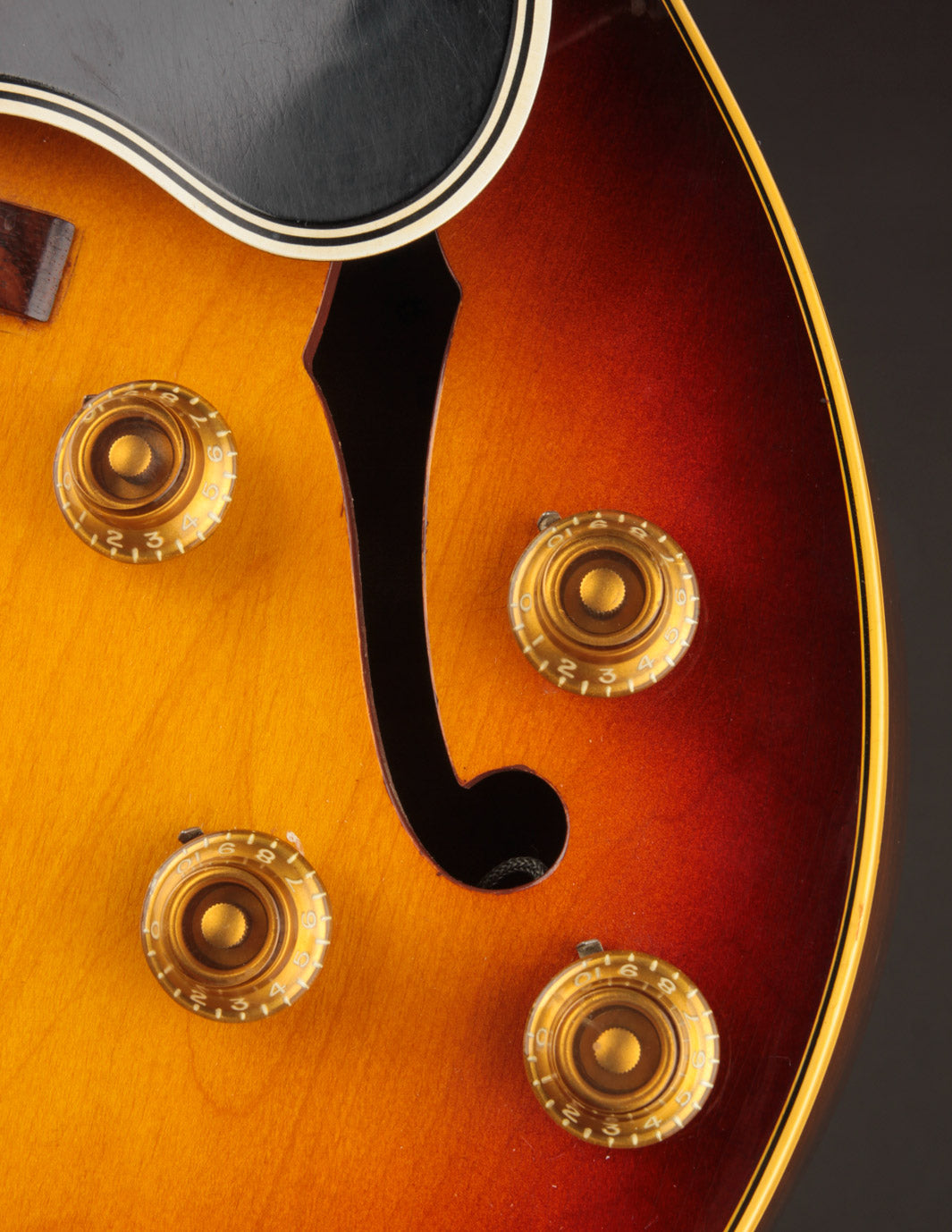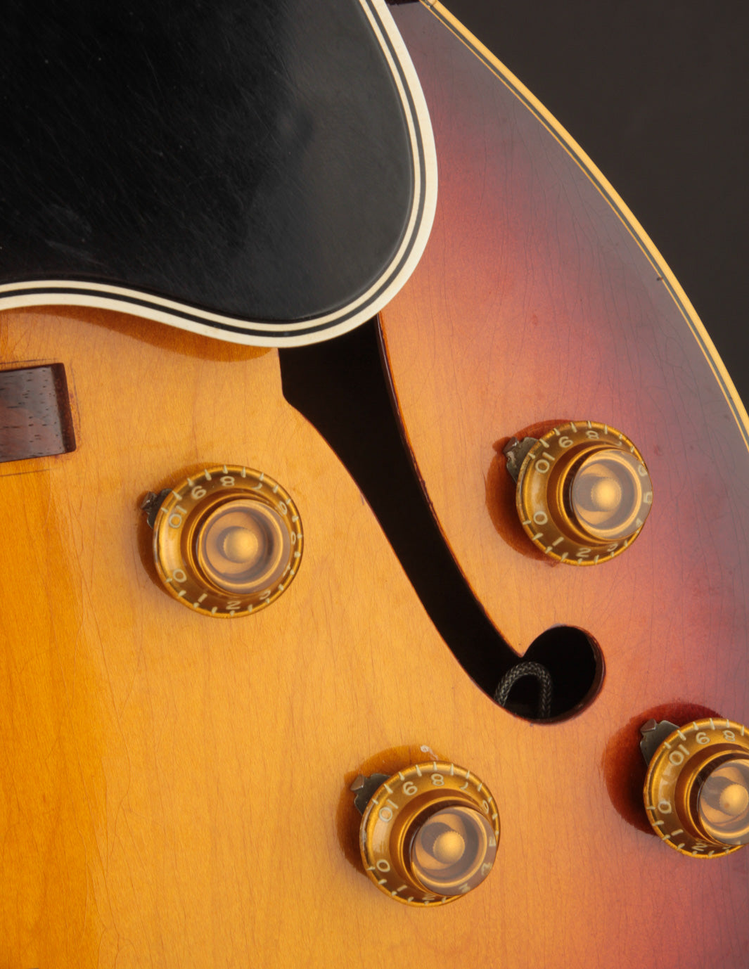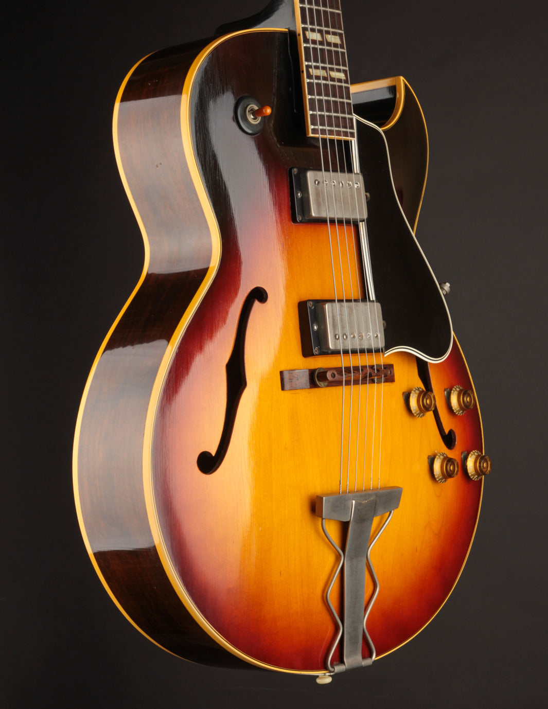 As you can tell from the photos, this ES-175 is exceptionally clean. If it weren't for the replaced tuners and a small repaired laminate crack on the back, in fact, this would be very close to being NOS. The 3-tone Sunburst is superb, with all hues wonderfully represented without any real fading. The original nitrocellulose lacquer is also very clean, with light lacquer checking throughout.