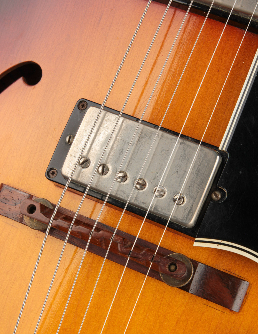 As with any late 50s Es-175, you're bound to find some exciting pickups in the guitar - that is, if they haven't been ripped out of the instrument like so many have. Well we found 'em! An original an undisturbed pair of PAF pickups reside in this guitar, both featuring the highly desirable double white bobbin configuration. Measuring in the low/mid 8k range, respectively, they sound sublime in this guitar. Clear, open, and harmonically rich, with strong note definition like a great PAF can deliver. It's not just relegated to being a jazz guitar, either. Hit it with some overdrive and watch out!