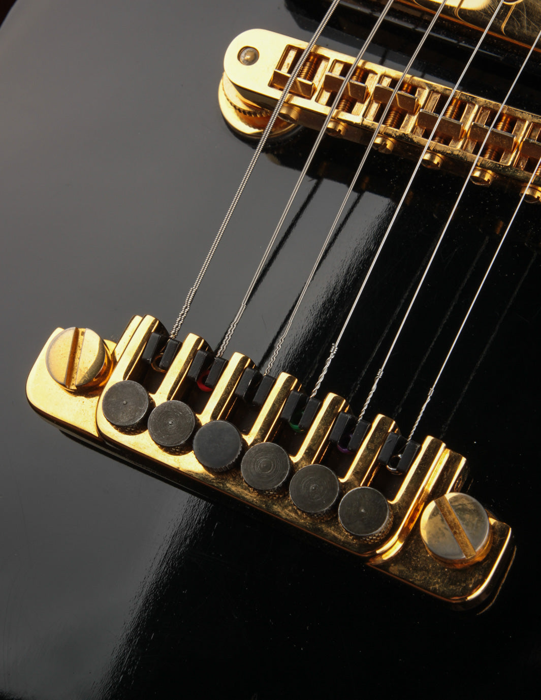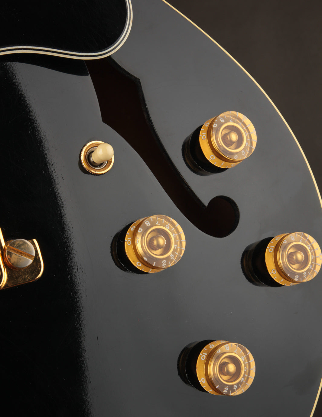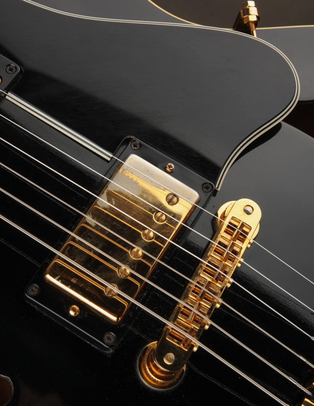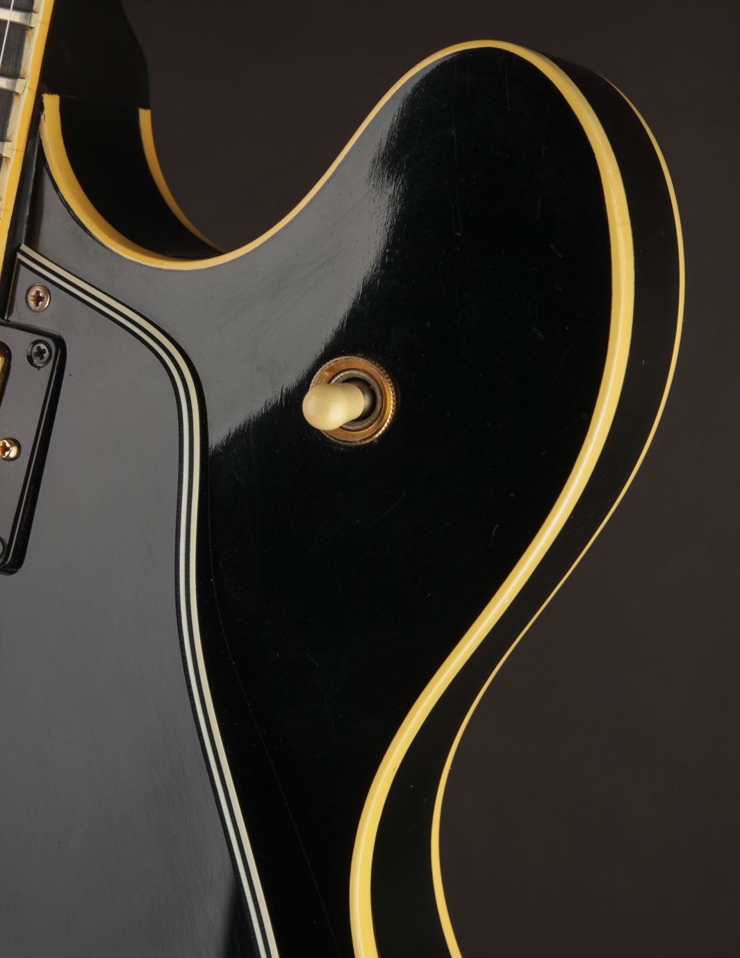 This guitar features almost all of its original hardware save for the strap buttons. All of the gold plating remains mostly intact with some light oxidation and corrosion on the pickup covers. The original black speed knobs have been swapped for the amber variant, and the pickguard is original.