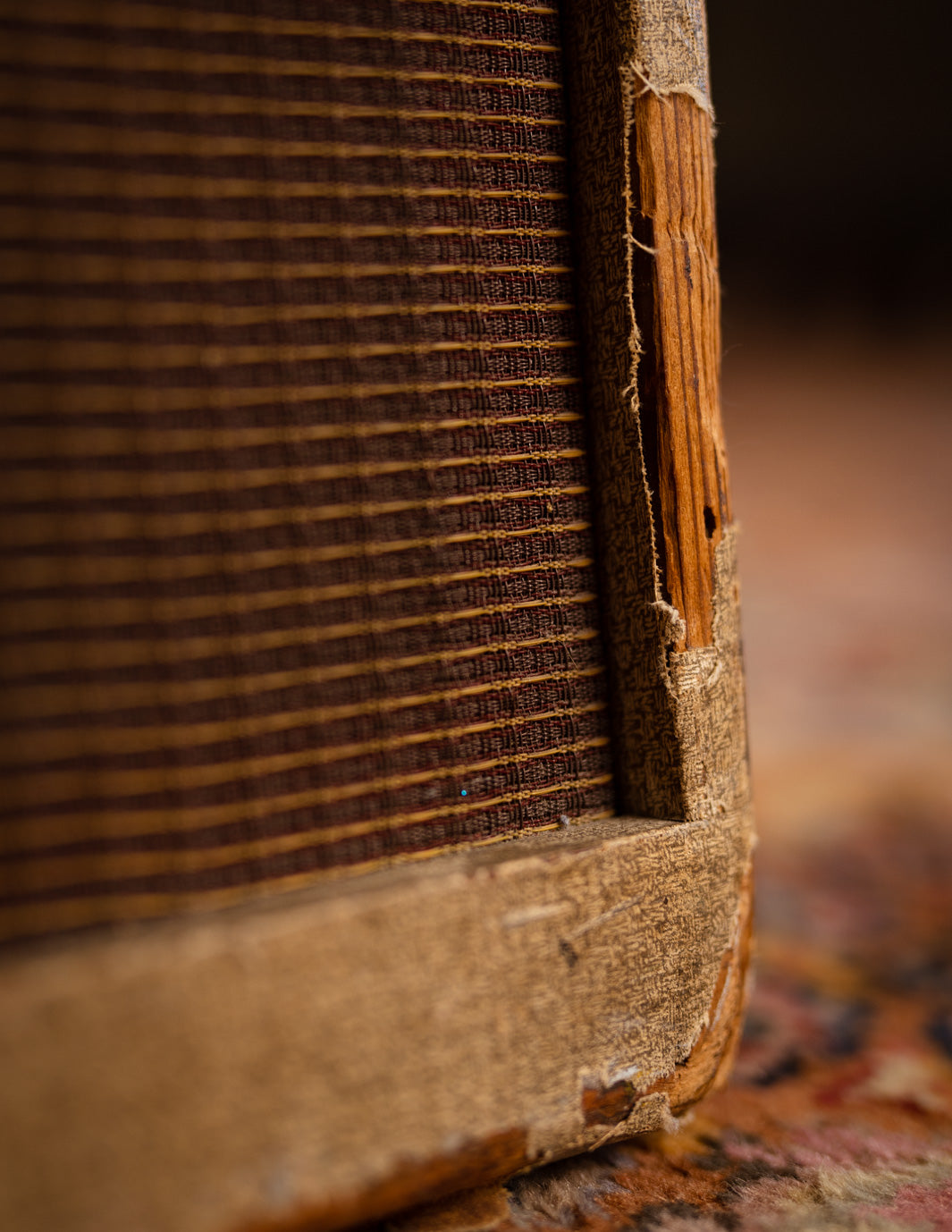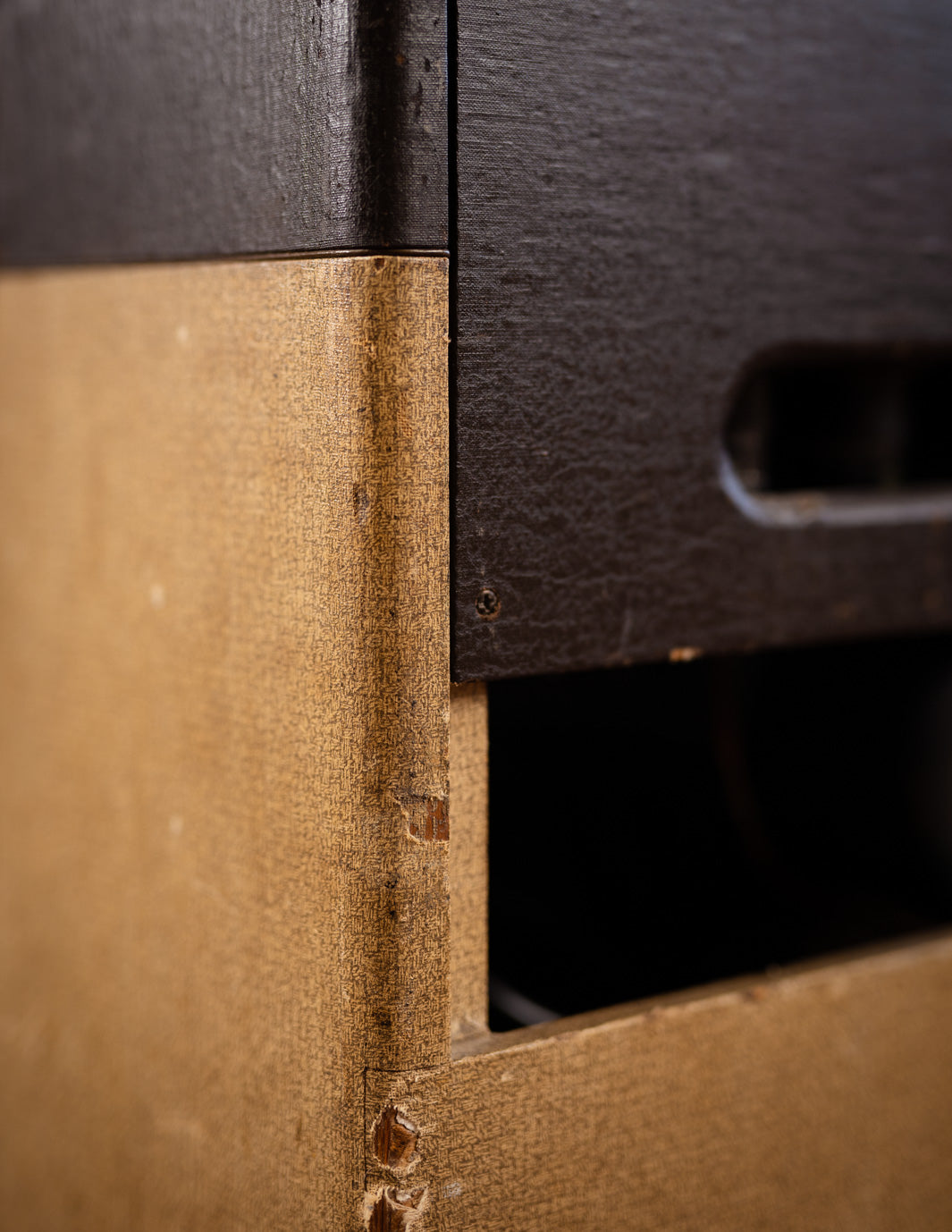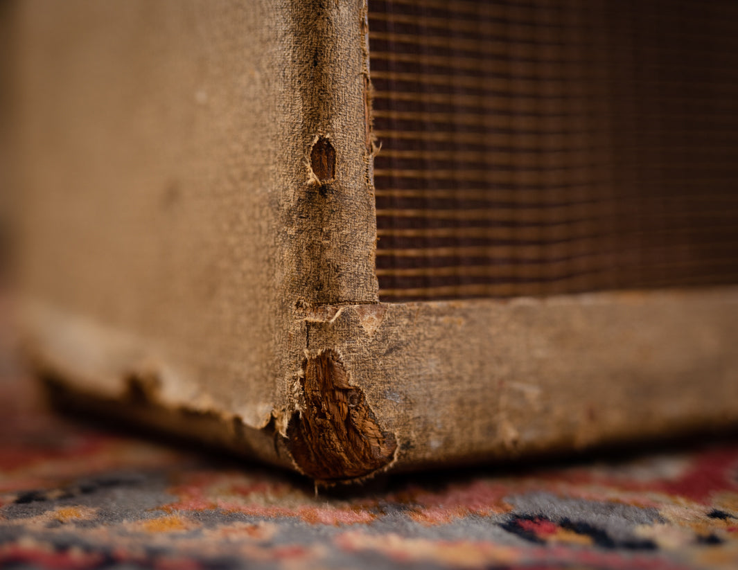 The amp was just serviced by our friend Stan Day, who swapped out a couple of tired preamp tubes and replaced the old lamp style power cord. The original plastic badge had broken off at some point prior to our acquisition, so we sourced a nice replacement, which has been glued to the cab. It's a handsome amp, and sounds fabulous with just about anything you plug into it.