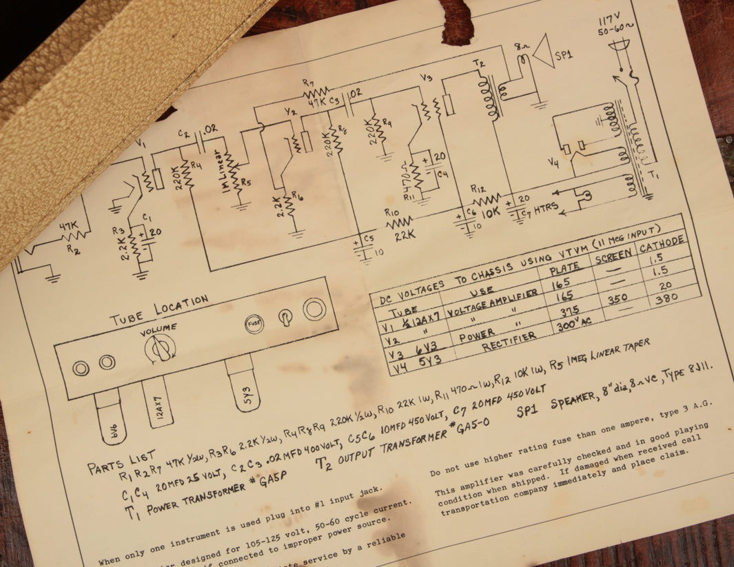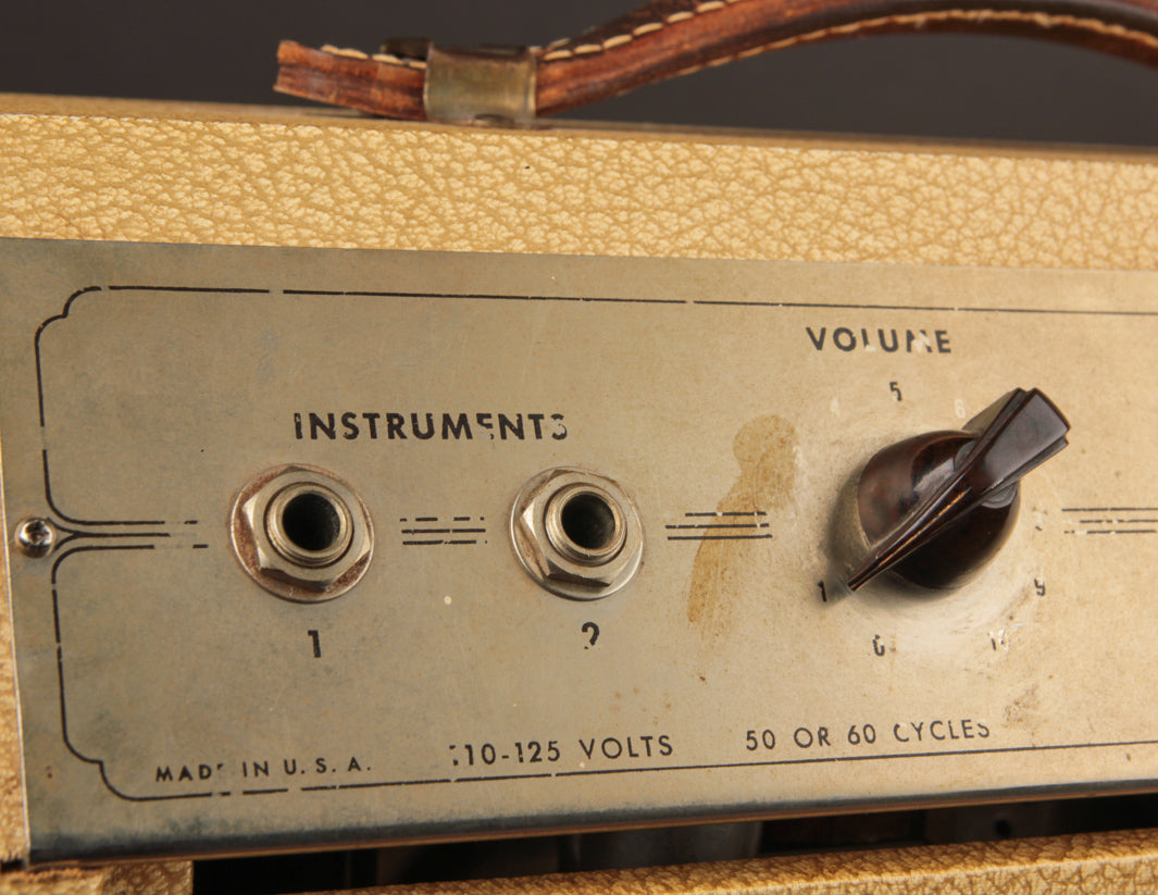 This particular variant is the most common, with just a single Volume control and a pair of high and low inputs. The cabinet is very clean with its original smooth Blonde vinyl and rear-mounted baffle with Oxblood grill cloth. The amp has recently been serviced but not modified, and the transformers are original throughout. Operationally sound and ready for action, this Gibson GA-5 is TME favorite when it comes to vintage low-watt combos.
