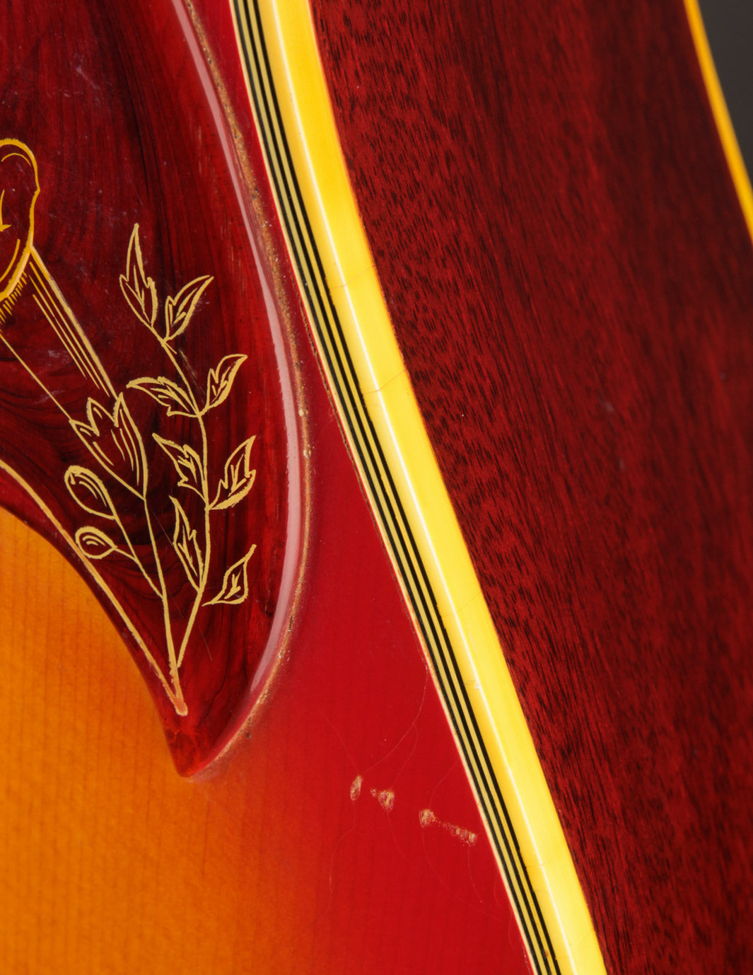 This 1967 Gibson Hummingbird was recently acquired from its local, original owner. After an enthusiastic beginning to his guitar-playing life, said owner let this Hummingbird sit dormant for many years when life gets in the way as it often does. The consequences of that dormancy were twofold: the guitar's original bridge, and pieces of its original binding, cracked due to dryness, but the overall condition of the guitar's structure is beautifully preserved. Our shop has performed the necessary repairs, and the instrument is playing beautifully once again -- and sounding wonderful! Anyone interested in a prototypical sounding Gibson strumming guitar would do well to pounce on this one -- it's got pedigree, tone, and looks any vintage guitar geek would drool over. (And now that we think of it, a third consequence of all those years spent in a case is the gorgeous, unfaded cherry sunburst you see in our photos.)