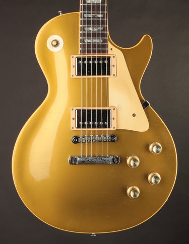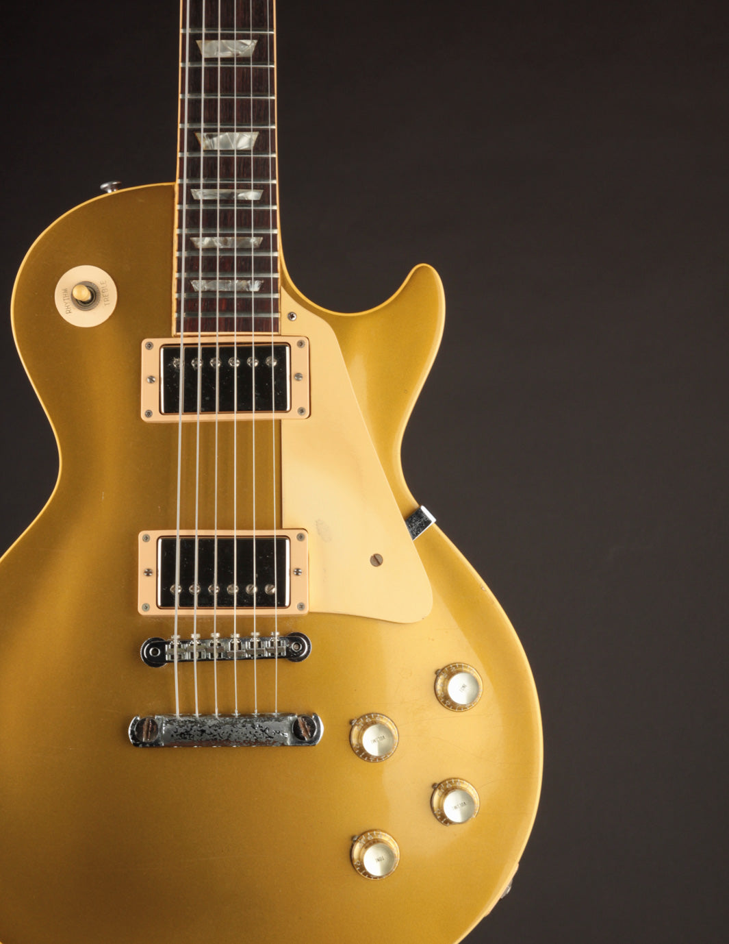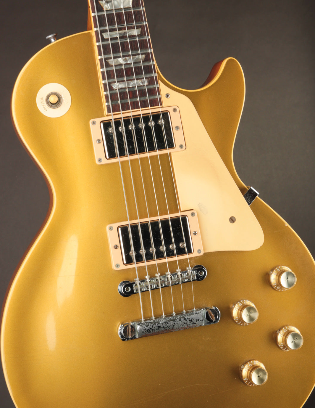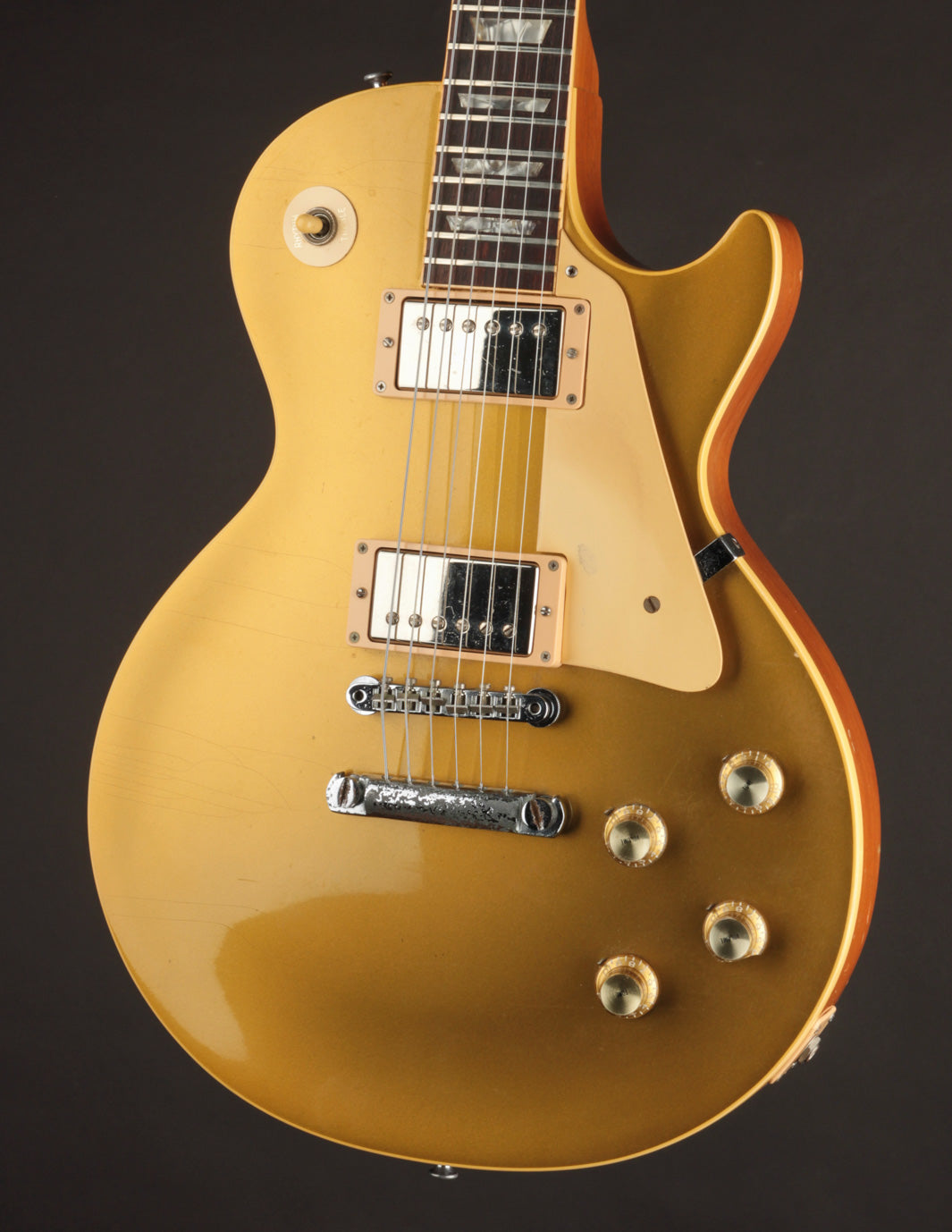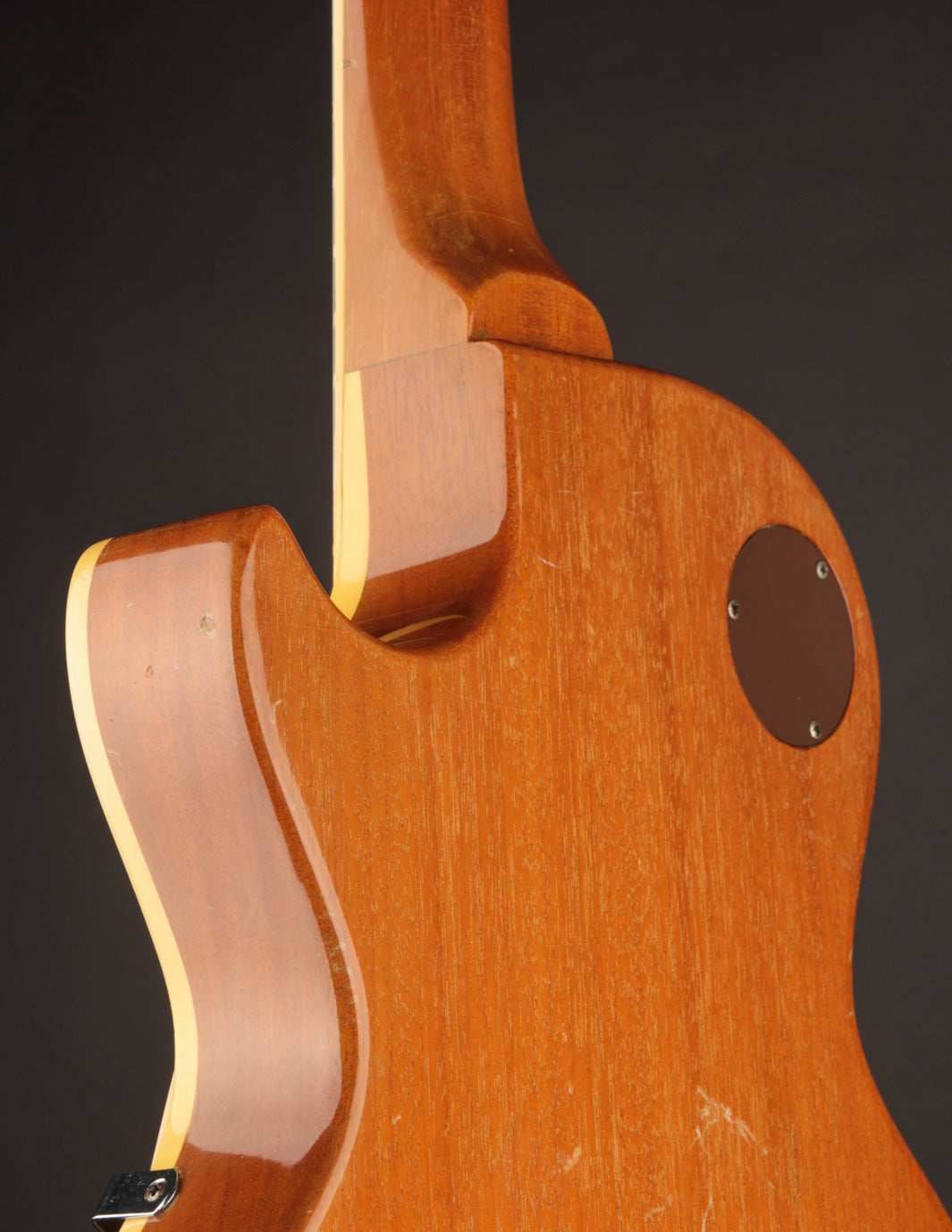 Having left the factory in the Deluxe format, it once originally outfitted with mini humbuckers. The all-too-common modification for these LPs was to rout them for full-size humbuckers as was the case with this one. The top was also refinished by Lay's Guitar Shop in Akron, OH, re-establishing its gold glory.