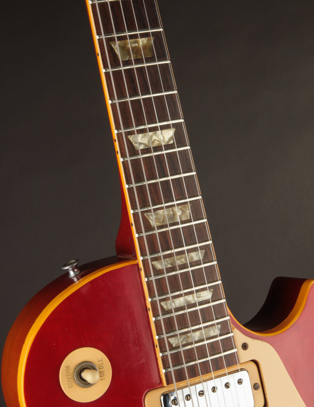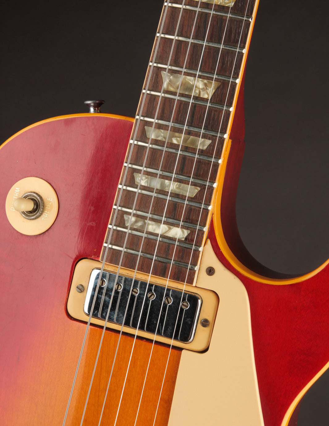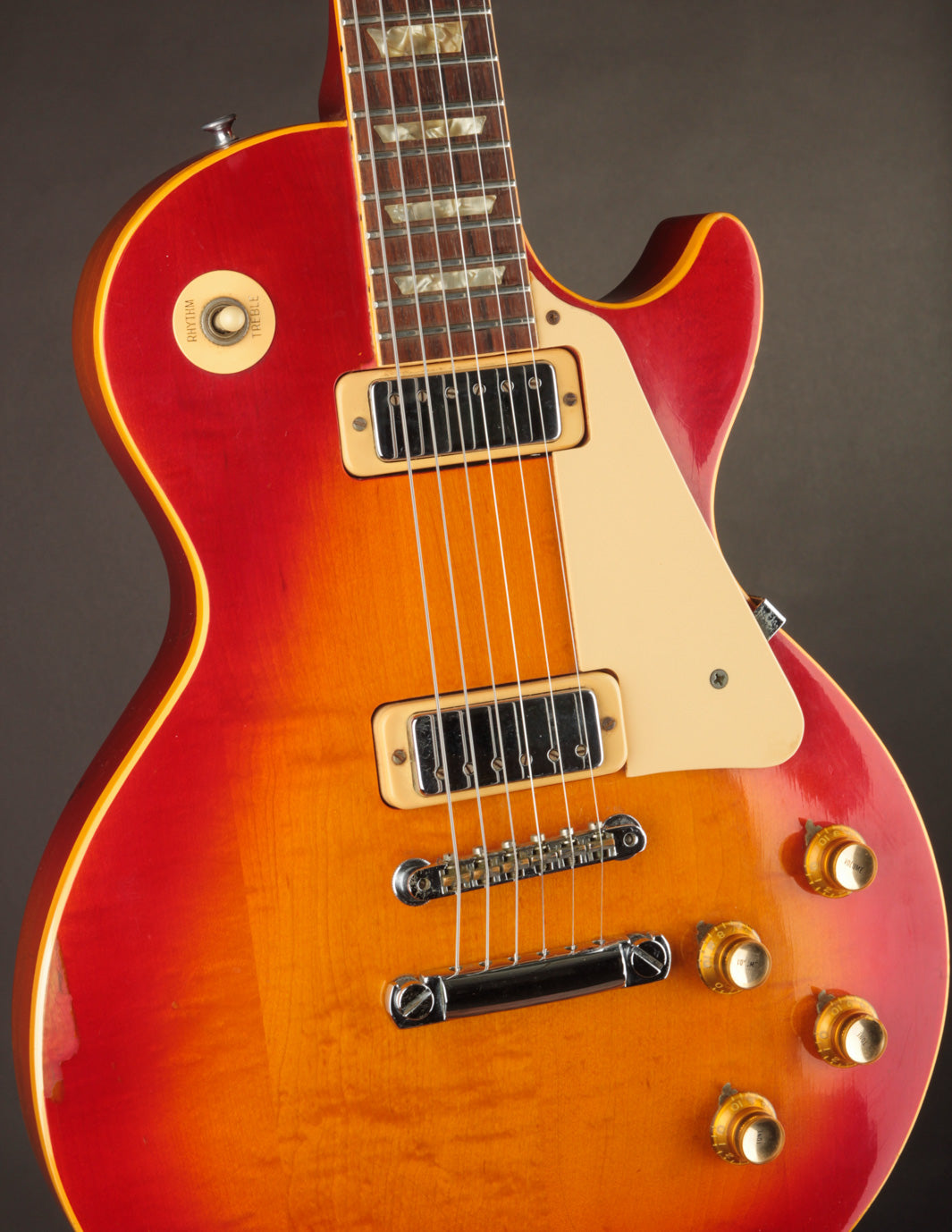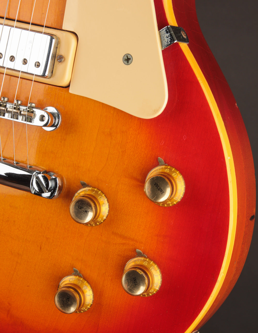 The original input jack plate was replaced with a metal version, and the stopbar tailpiece was swapped out at some point. Otherwise all of the electronics are original to the guitar as are the plastics (pickguard, knobs).