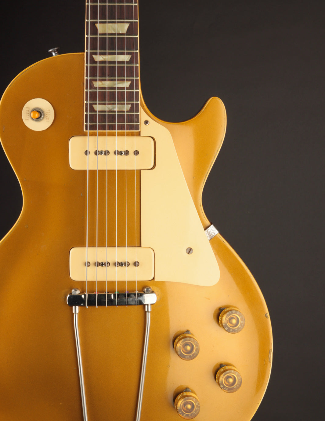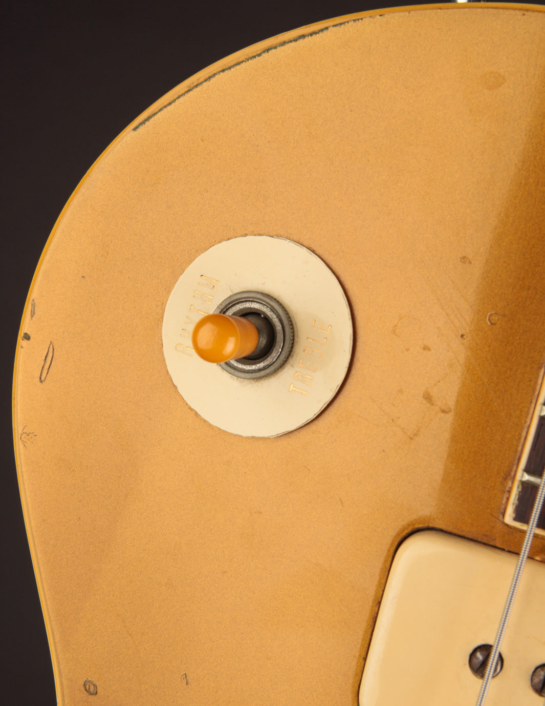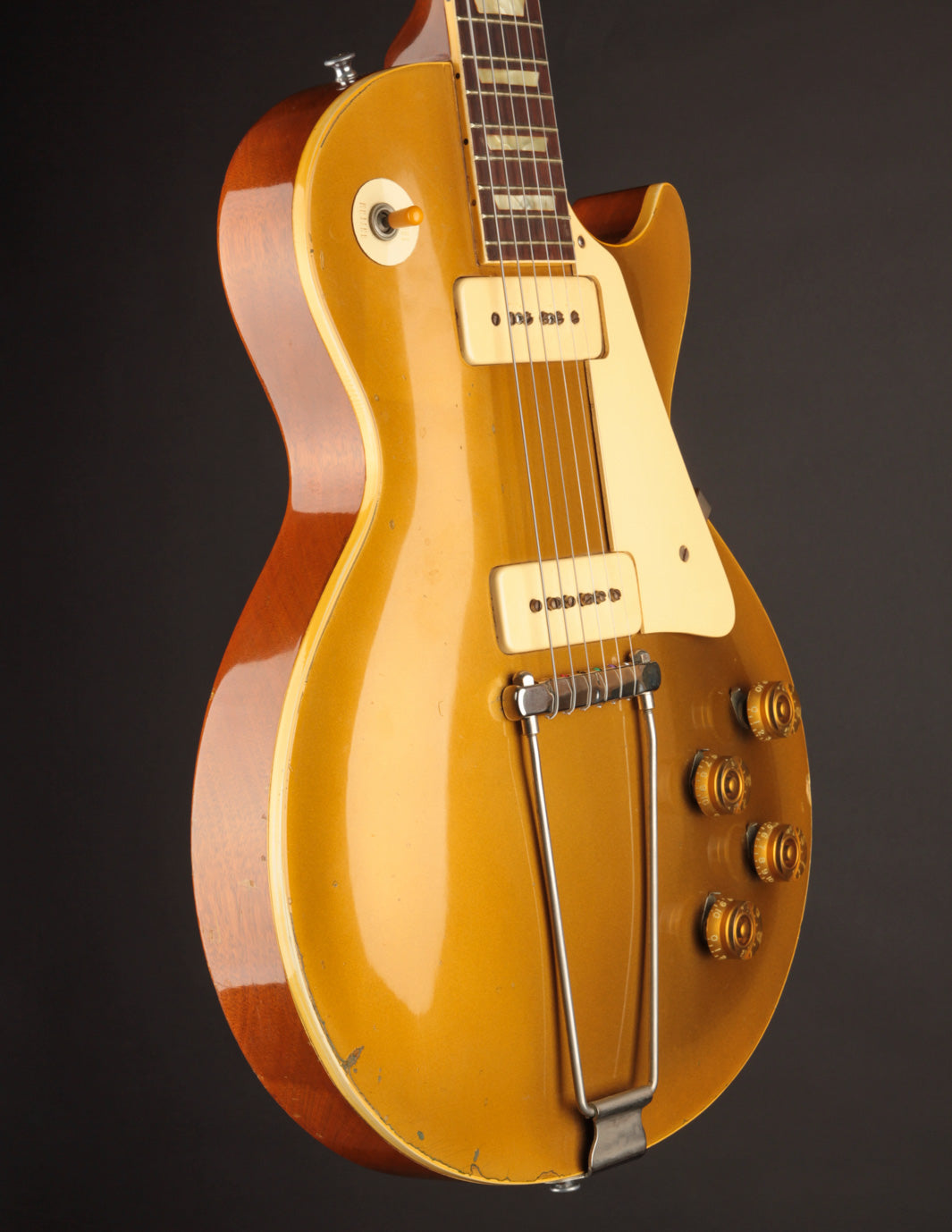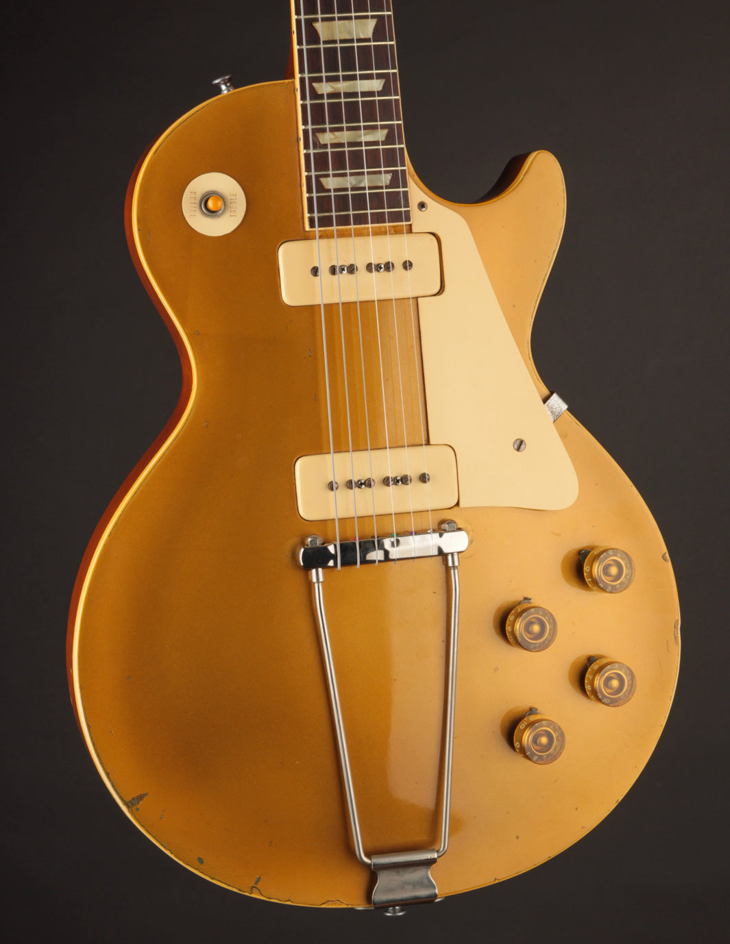 With the exception of the input jack plate and the aforementioned bridge swap, the guitar is otherwise entirely original. Frets, tuners, nut, pickguard, knobs, electronics...all untouched. The finish is in truly exceptional condition, with very little fading on the gold, and a clean natural lacquer finish on the body and neck. There's even some evidence of the guitar having worn its original toggle switch card for a period of time long enough to create the slightest of UV shadowing adjacent to the switch. Super cool!