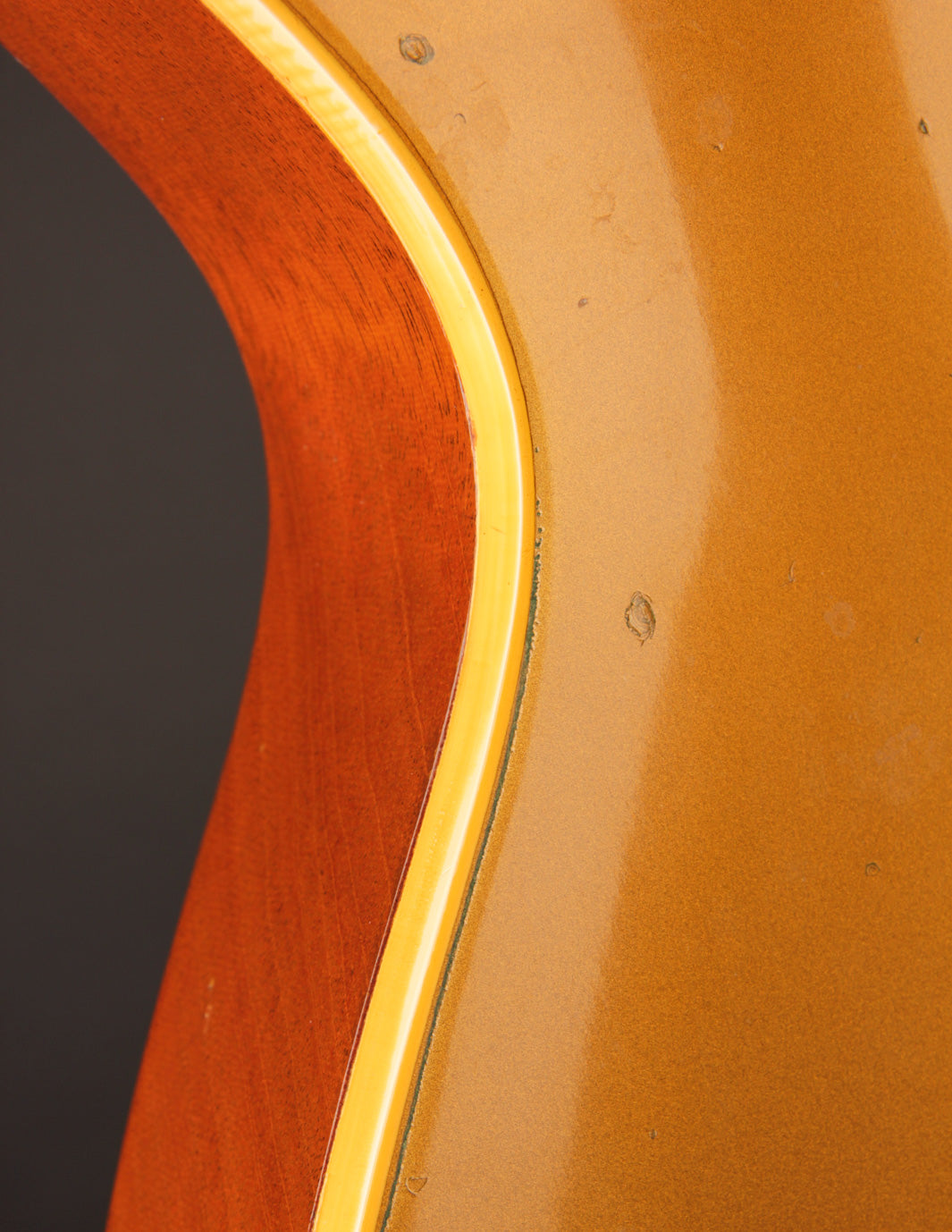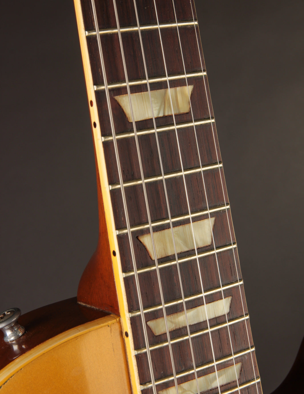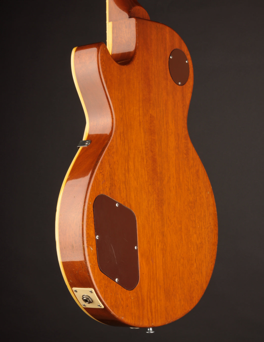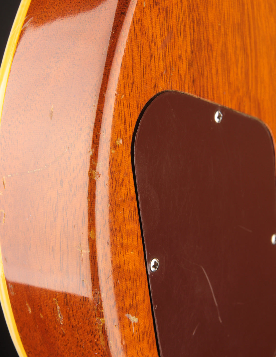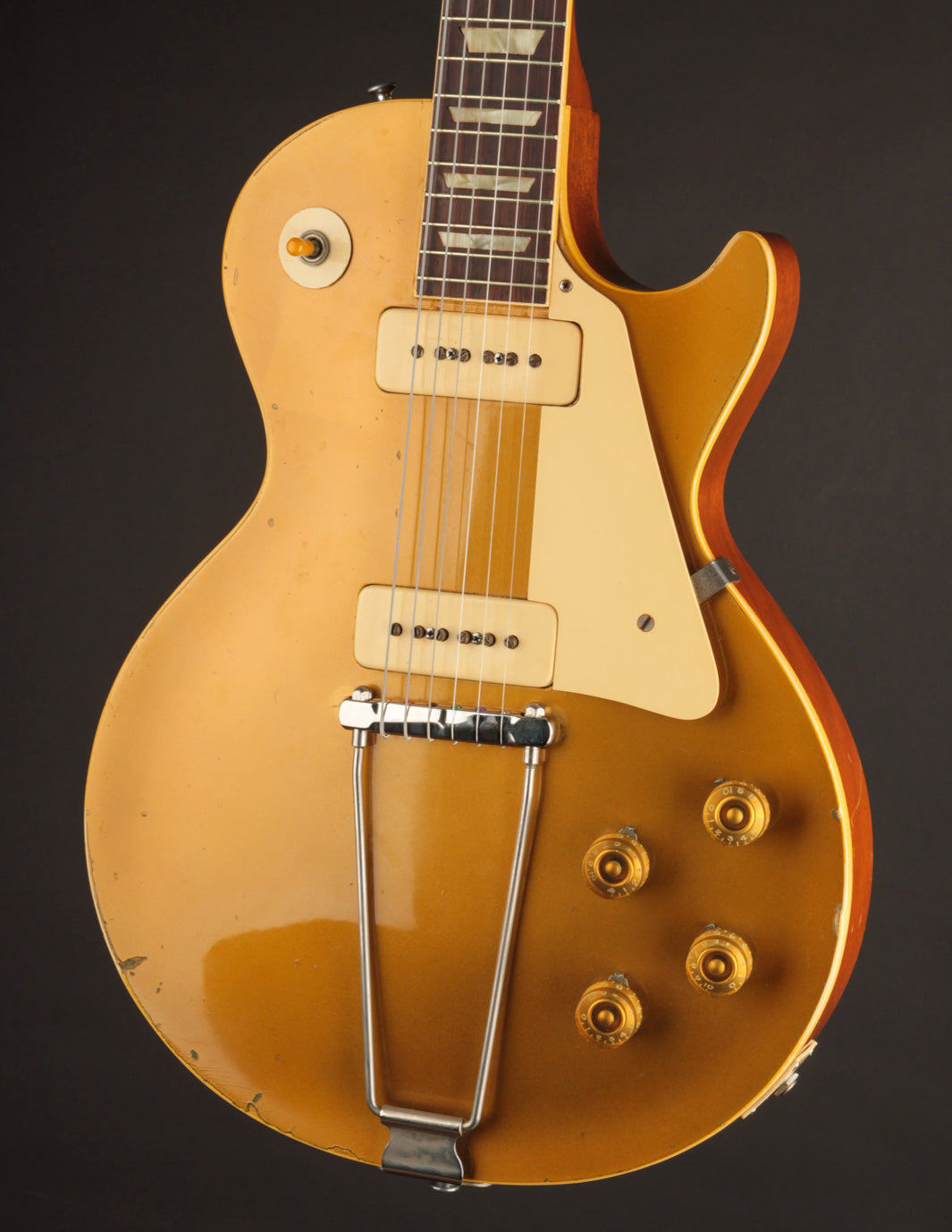 With the exception of the input jack plate and the aforementioned bridge swap, the guitar is otherwise entirely original. Frets, tuners, nut, pickguard, knobs, electronics...all untouched. The finish is in truly exceptional condition, with very little fading on the gold, and a clean natural lacquer finish on the body and neck. There's even some evidence of the guitar having worn its original toggle switch card for a period of time long enough to create the slightest of UV shadowing adjacent to the switch. Super cool!