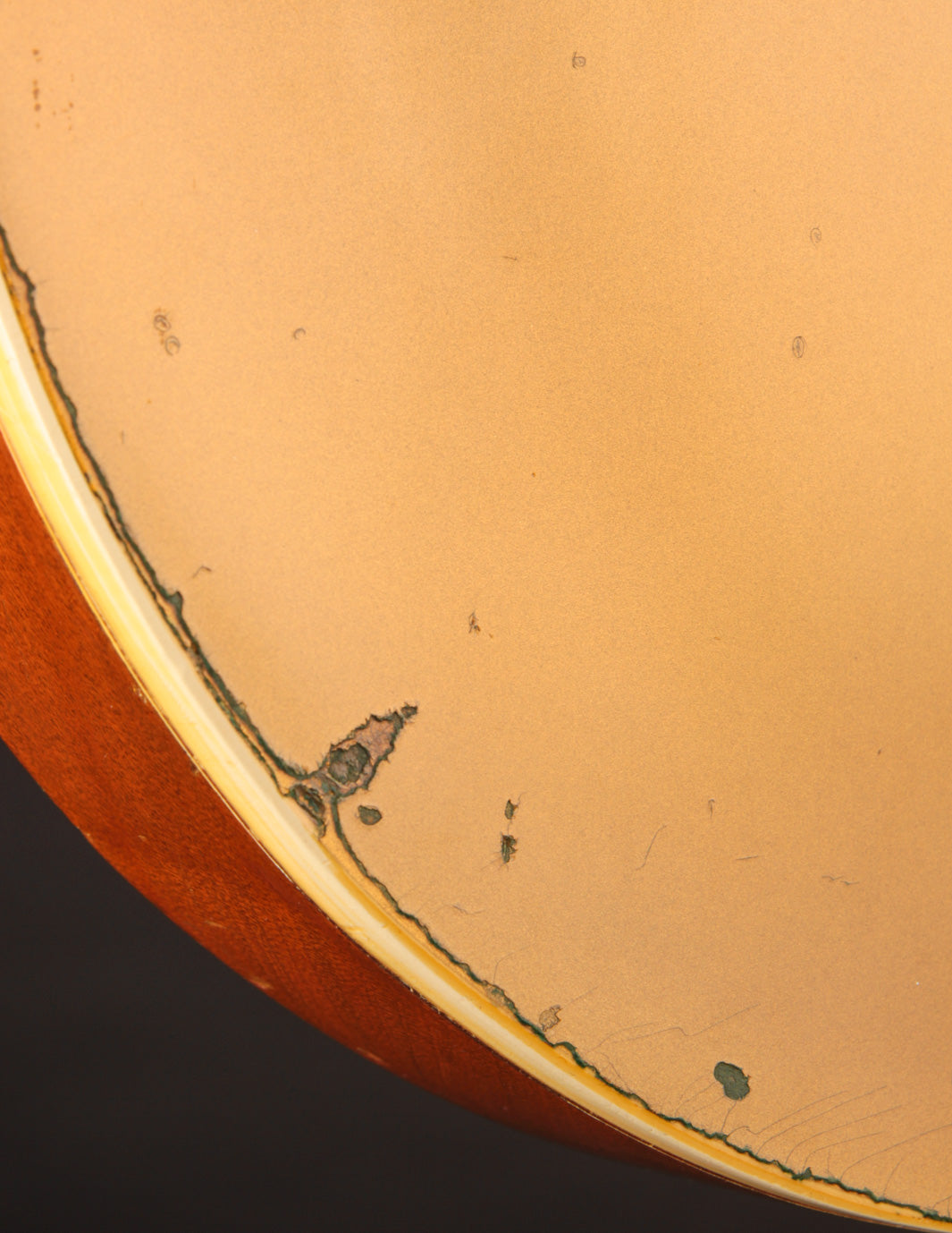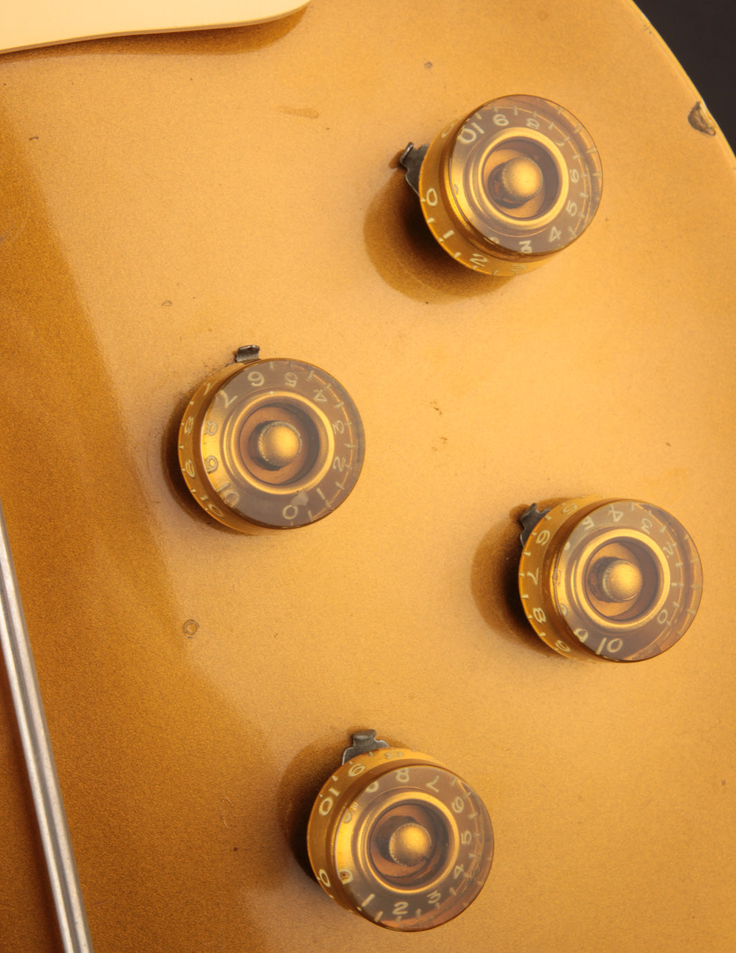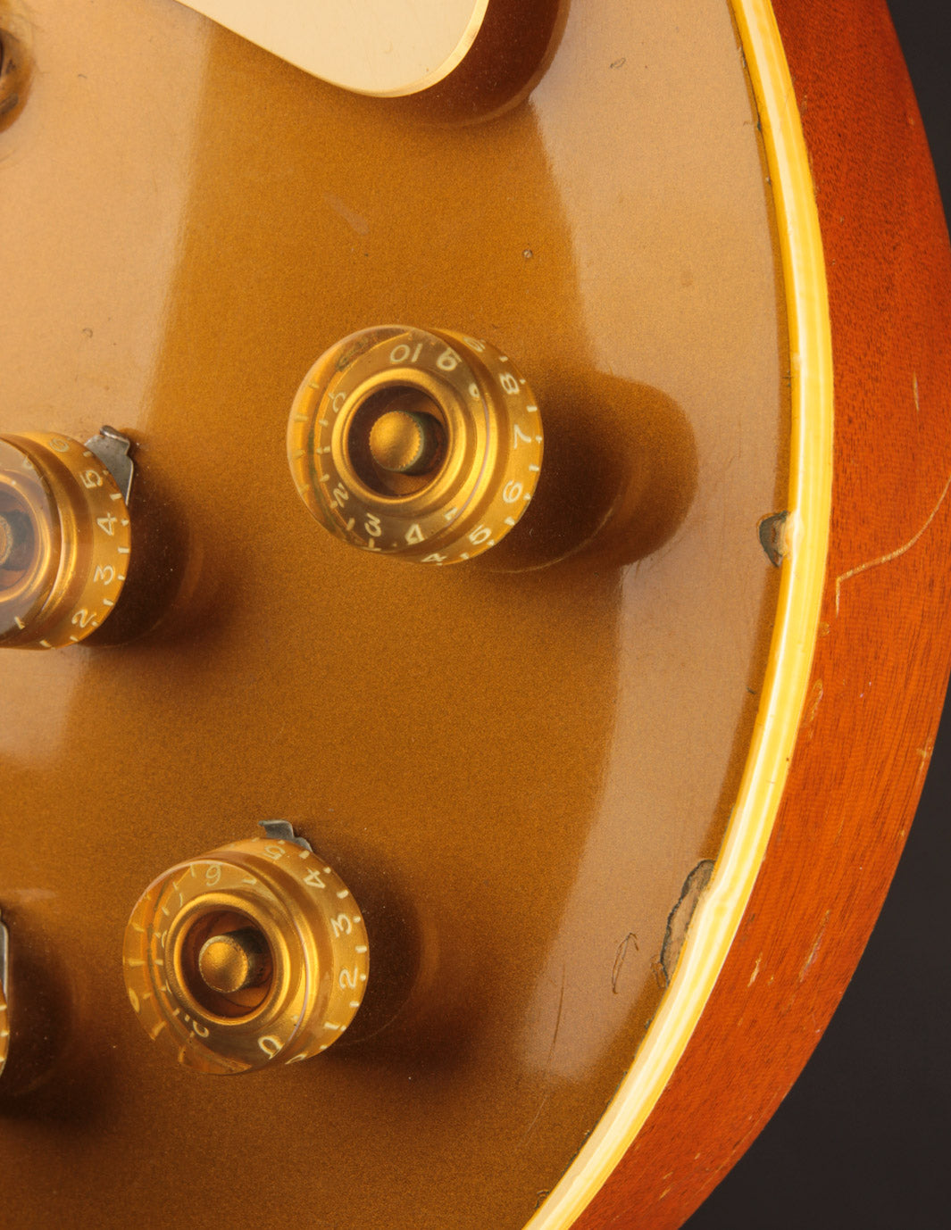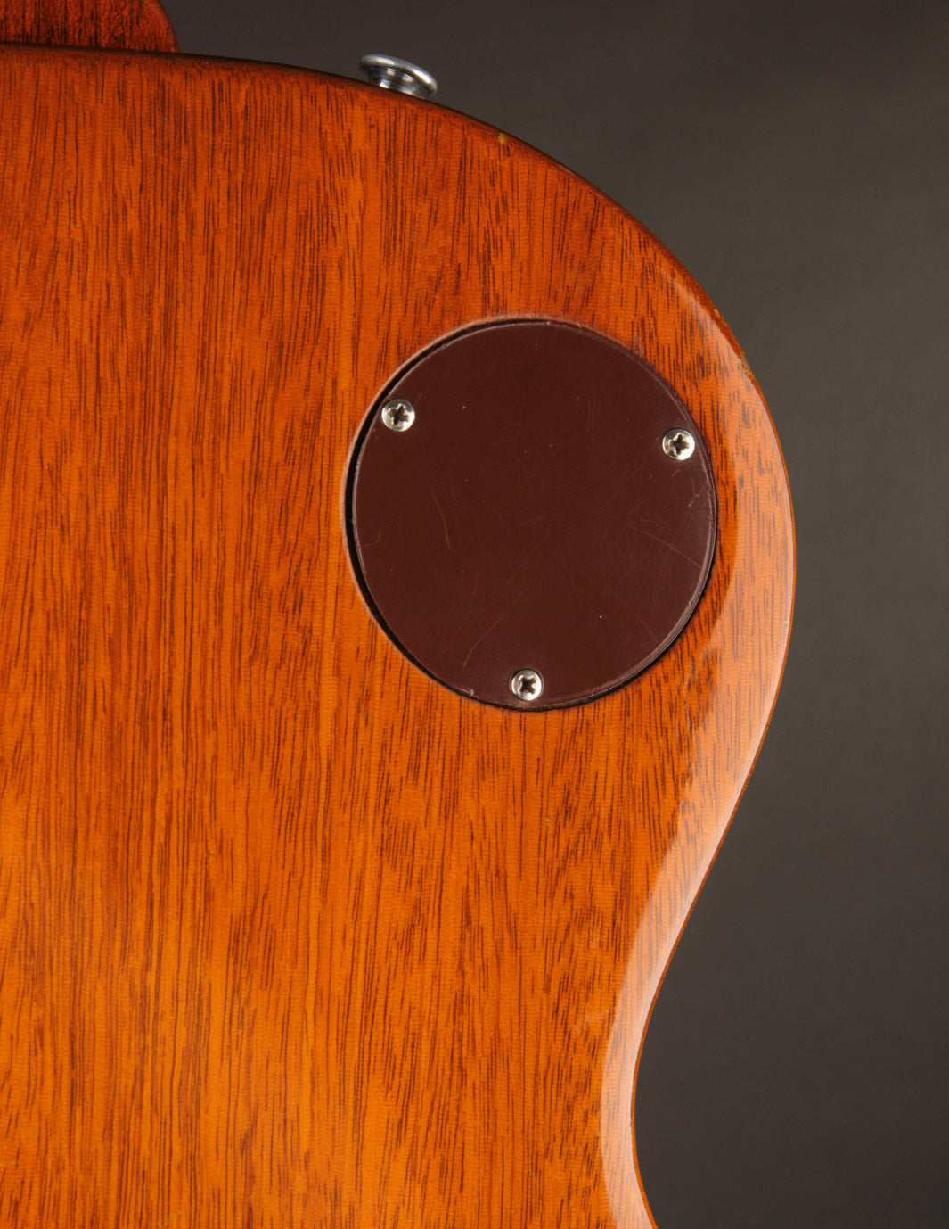 With the exception of the input jack plate and the aforementioned bridge swap, the guitar is otherwise entirely original. Frets, tuners, nut, pickguard, knobs, electronics...all untouched. The finish is in truly exceptional condition, with very little fading on the gold, and a clean natural lacquer finish on the body and neck. There's even some evidence of the guitar having worn its original toggle switch card for a period of time long enough to create the slightest of UV shadowing adjacent to the switch. Super cool!