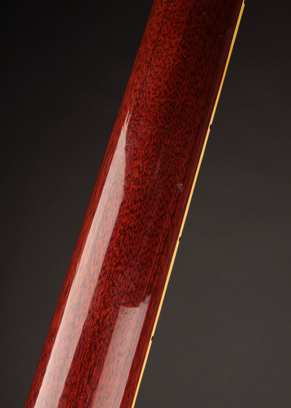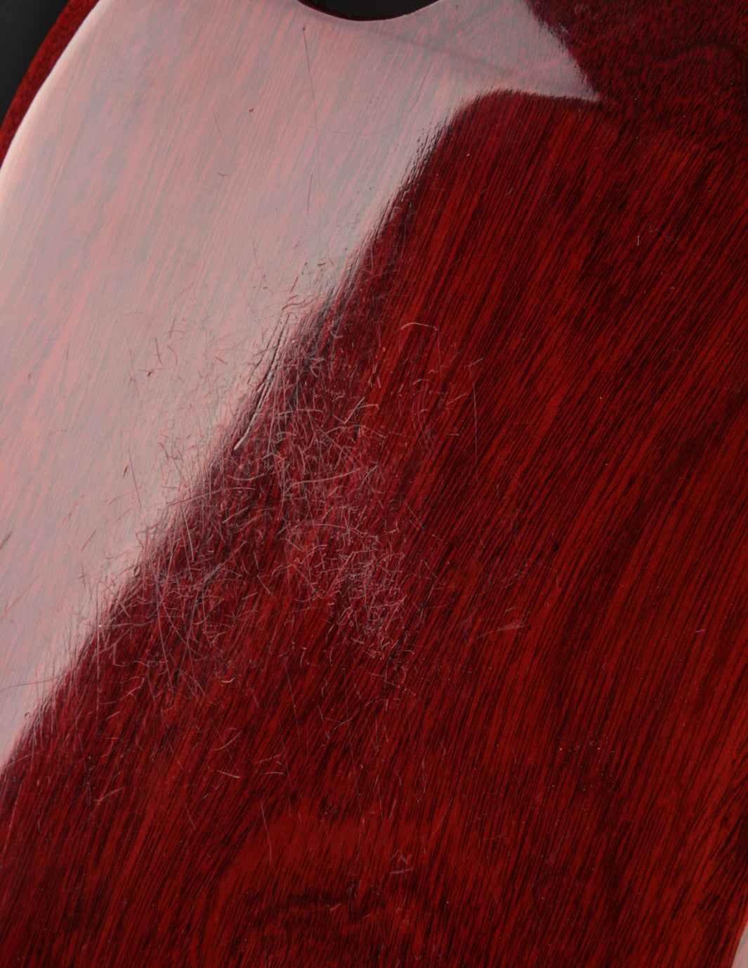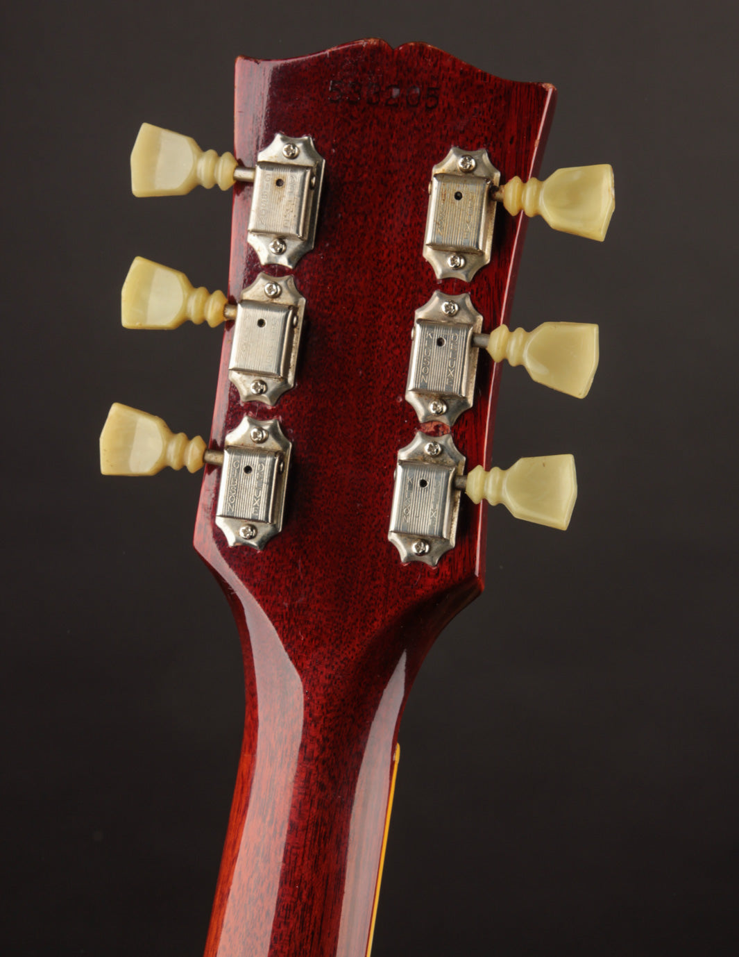 The tuners had been replaced with Grover Rotomatics at one point, but era-correct Klusons were reinstalled, with four of the tuners marked as true Kluson double lines and two marked 'Gibson', which had made their way onto Gibsons in the 1970s. Some light and clean finish touchup was performed on the peghead, likely to even out the marks left by the Grover bushings. Kluson conversion bushings were installed as well. However, there's no evidence of any headstock breaks or subsequent repair under blacklight.