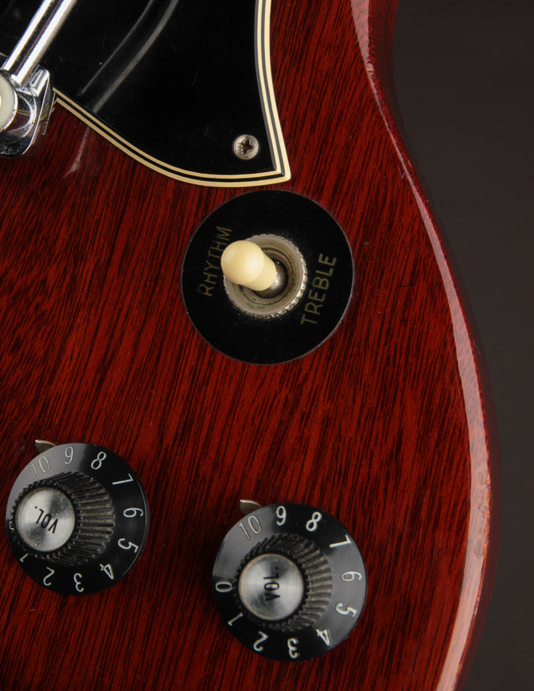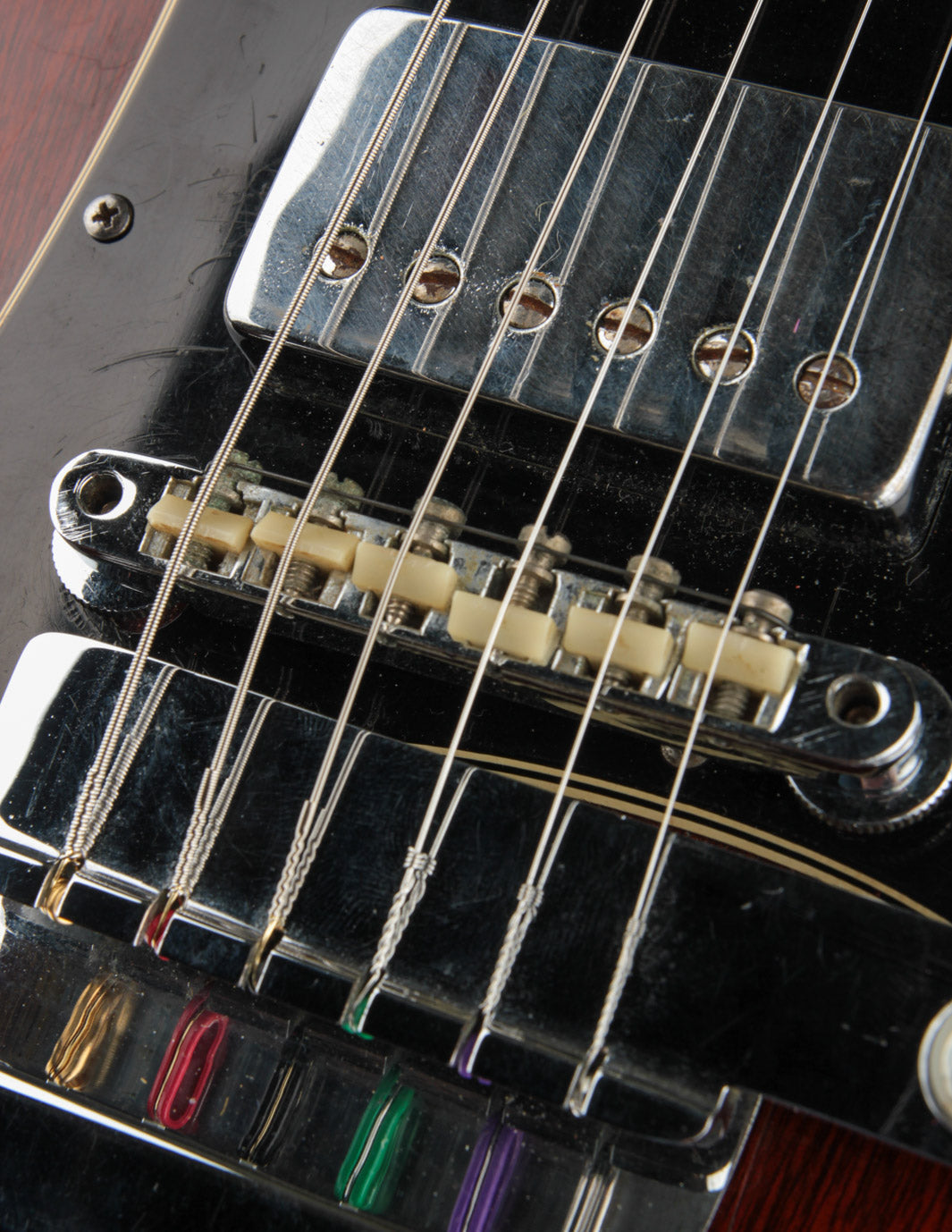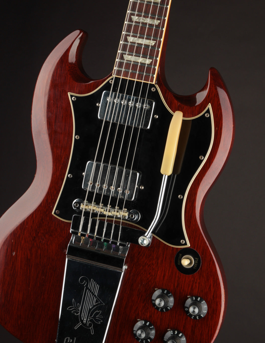 It's outfitted with what appears to be its original Patent # T-Top humbuckers that were spliced into a replacement DiMarzio harness made by Centralab to DiMarzio's specs in late 1987. The pickups have that classic late 60s Gibson HB sound - clear and punchy with a openness to the top end that really comes alive with some gain.