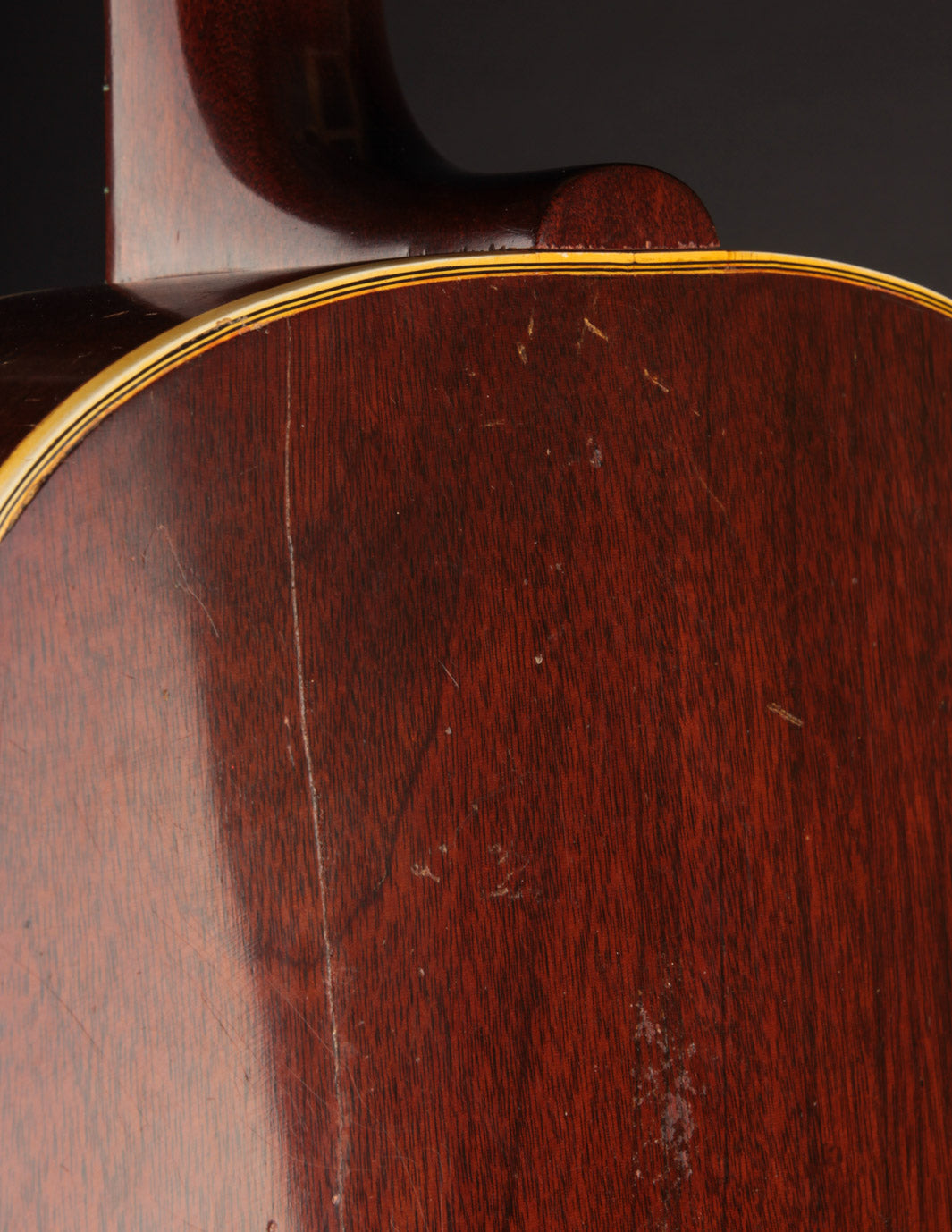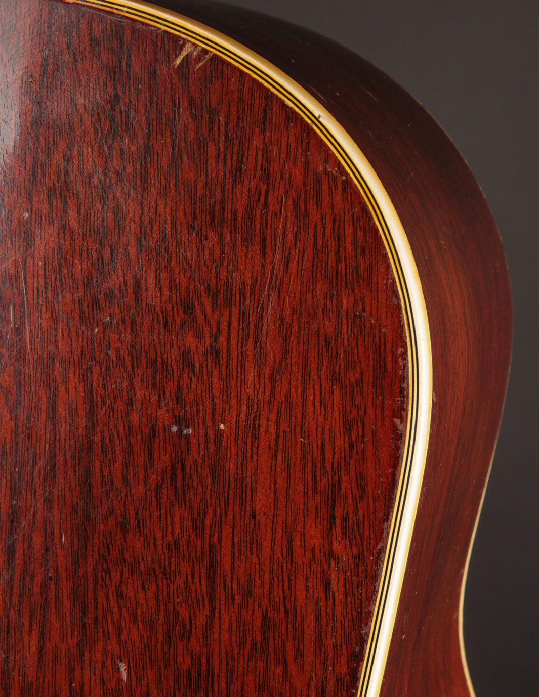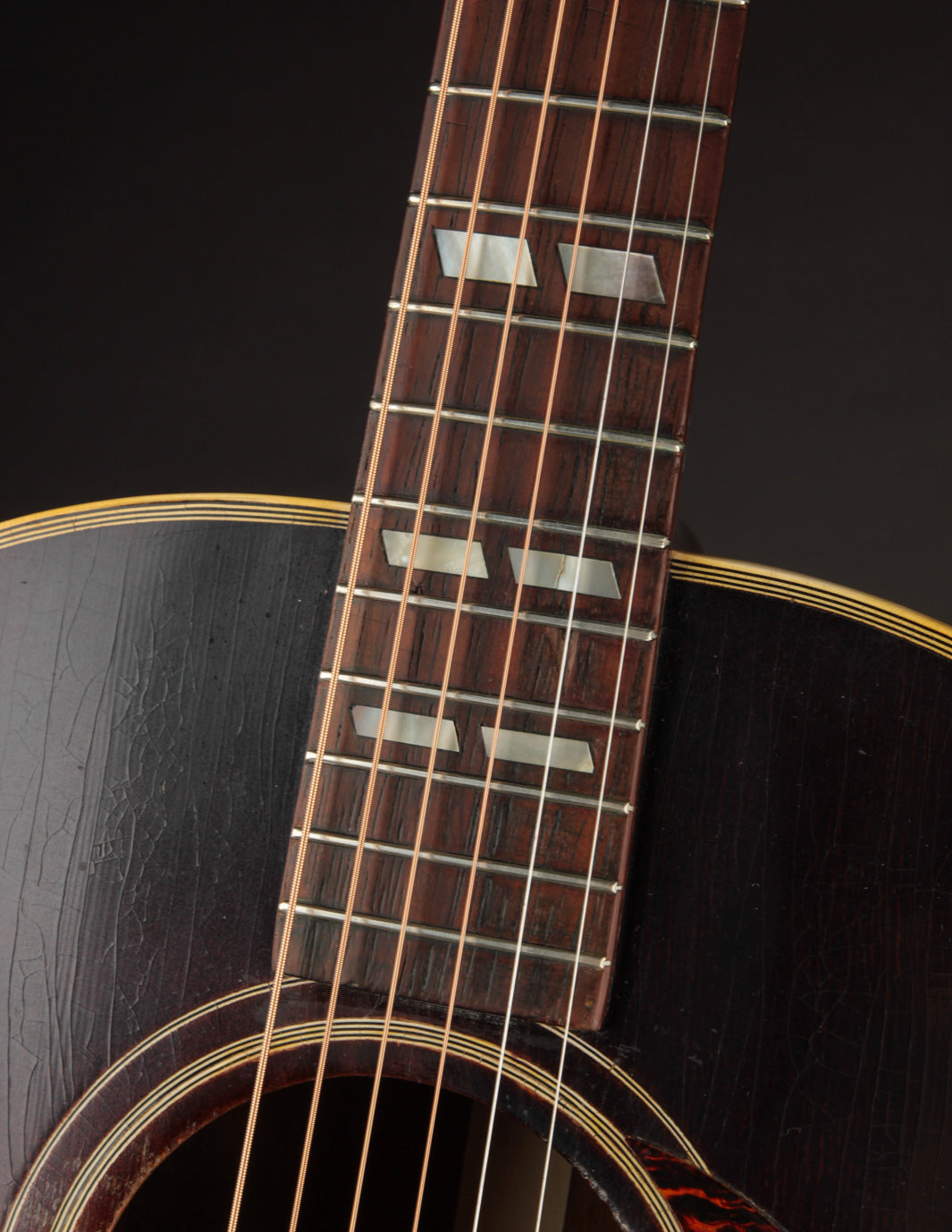 Condition: the back of the neck has been refinished, two back cracks have been glued and stabilized, the bridge plate has been replaced, and a small stabilizing cleat has been added underneath the pickguard. The top appears crack-free, and sports its original finish. The guitar has had a well-executed neck reset, and is not in need of another one. The setup is excellent under tension of light gauge strings; and the frets have been freshly dressed. There is some play wear evident in the fingerboard, but we can attest that it doesn't affect the guitar's in-hand feel at all. Price includes non-original hardshell case. On consignment; shipping calculated at checkout.