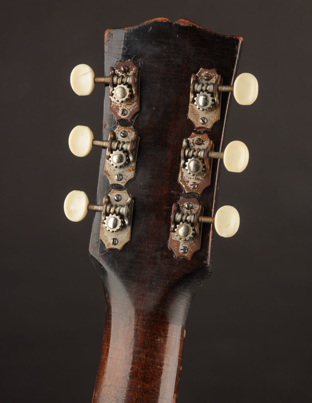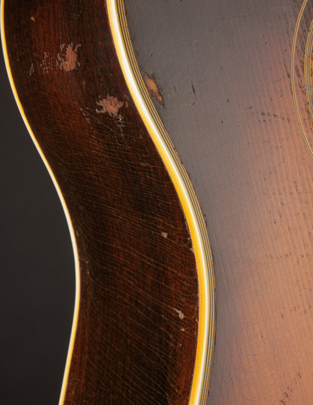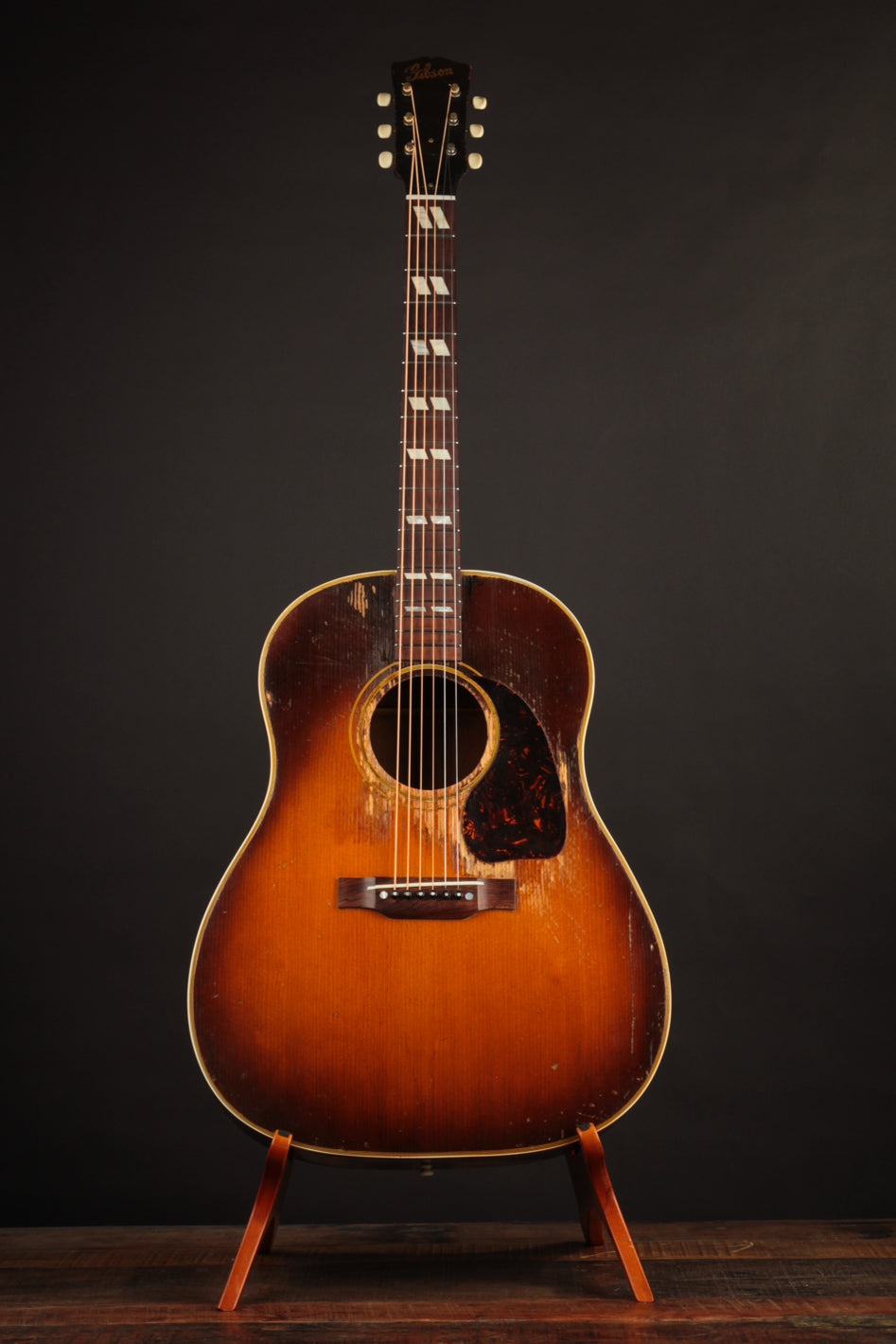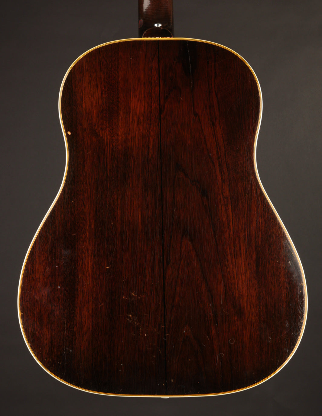 Condition: it's likely evident from looking at the photos, that this guitar has been played, and played heavily. The top shows playwear down to bare wood around the soundhole and in front of the bridge; and this area has localized finish touch up. One repaired top crack, one repaired back crack, and the scattered finish chipping / peeling emblematic of so many mid-40's Gibsons. The bridge has been replaced; and our shop has just refretted the fingerboard. In all? A great-playing SJ with tone and vibe to spare. Priced with non-original hard case. Expedited shipping at online checkout -- interested buyers are welcome to contact us for an in-hand description and Ground shipping options.