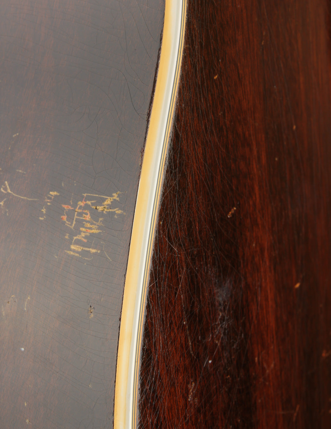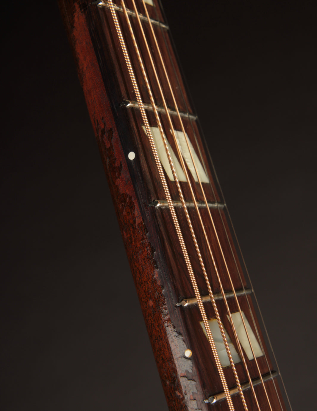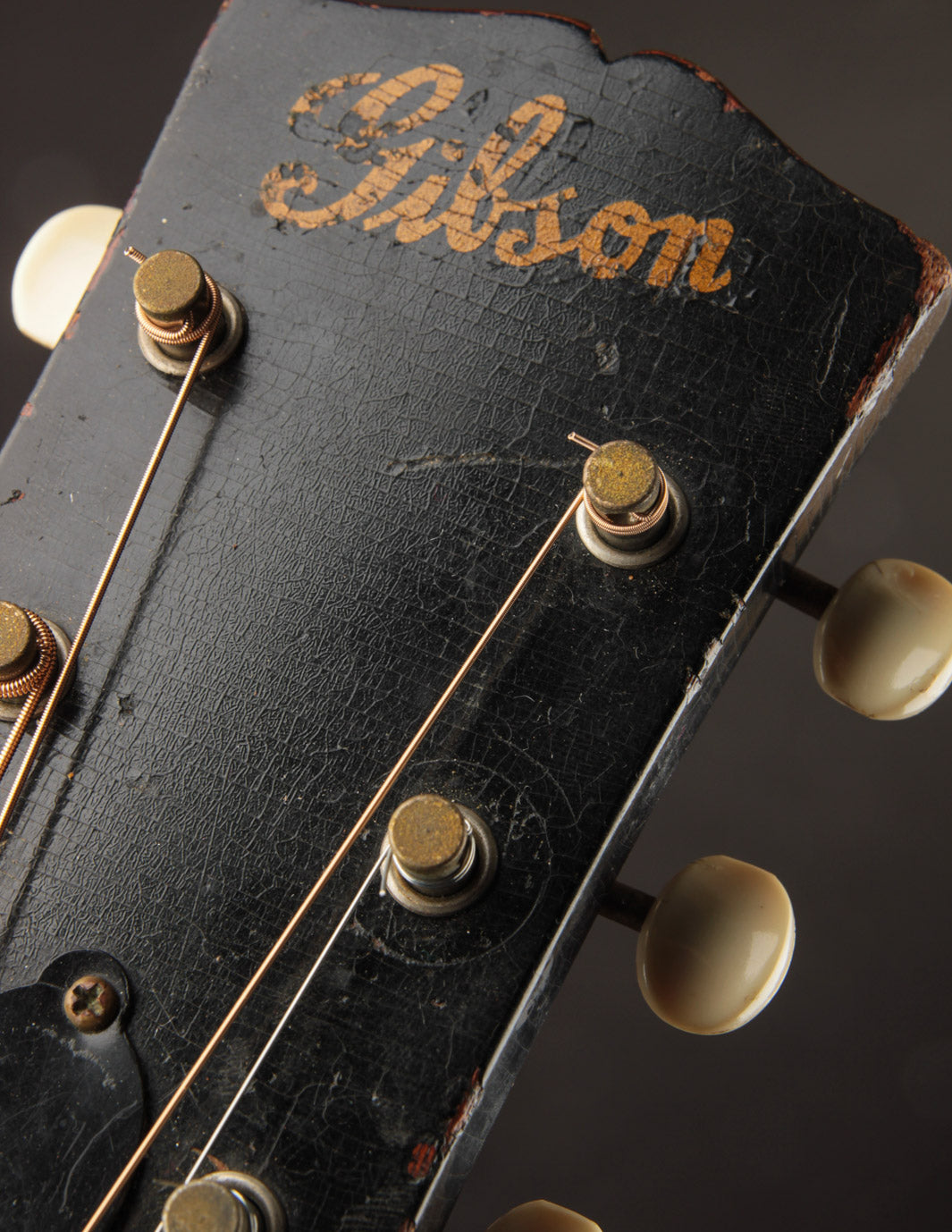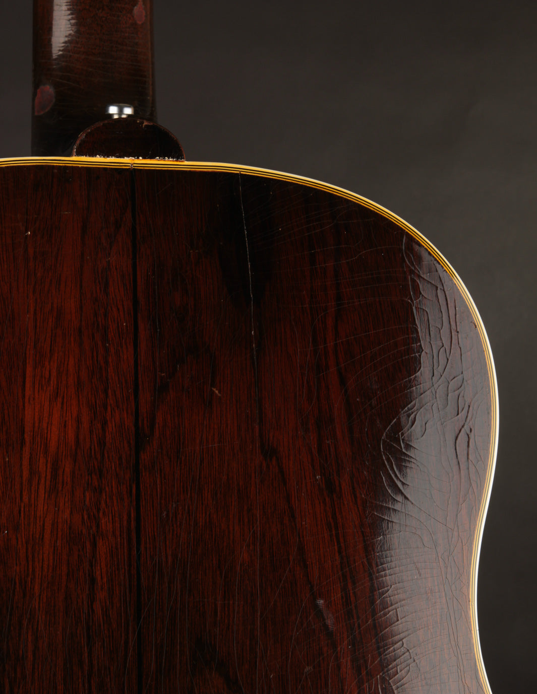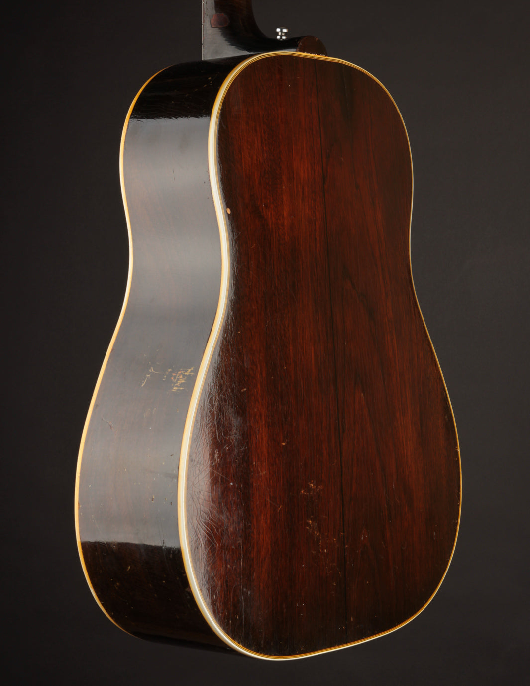 Condition: it's likely evident from looking at the photos, that this guitar has been played, and played heavily. The top shows playwear down to bare wood around the soundhole and in front of the bridge; and this area has localized finish touch up. One repaired top crack, one repaired back crack, and the scattered finish chipping / peeling emblematic of so many mid-40's Gibsons. The bridge has been replaced; and our shop has just refretted the fingerboard. In all? A great-playing SJ with tone and vibe to spare. Priced with non-original hard case. Expedited shipping at online checkout -- interested buyers are welcome to contact us for an in-hand description and Ground shipping options.