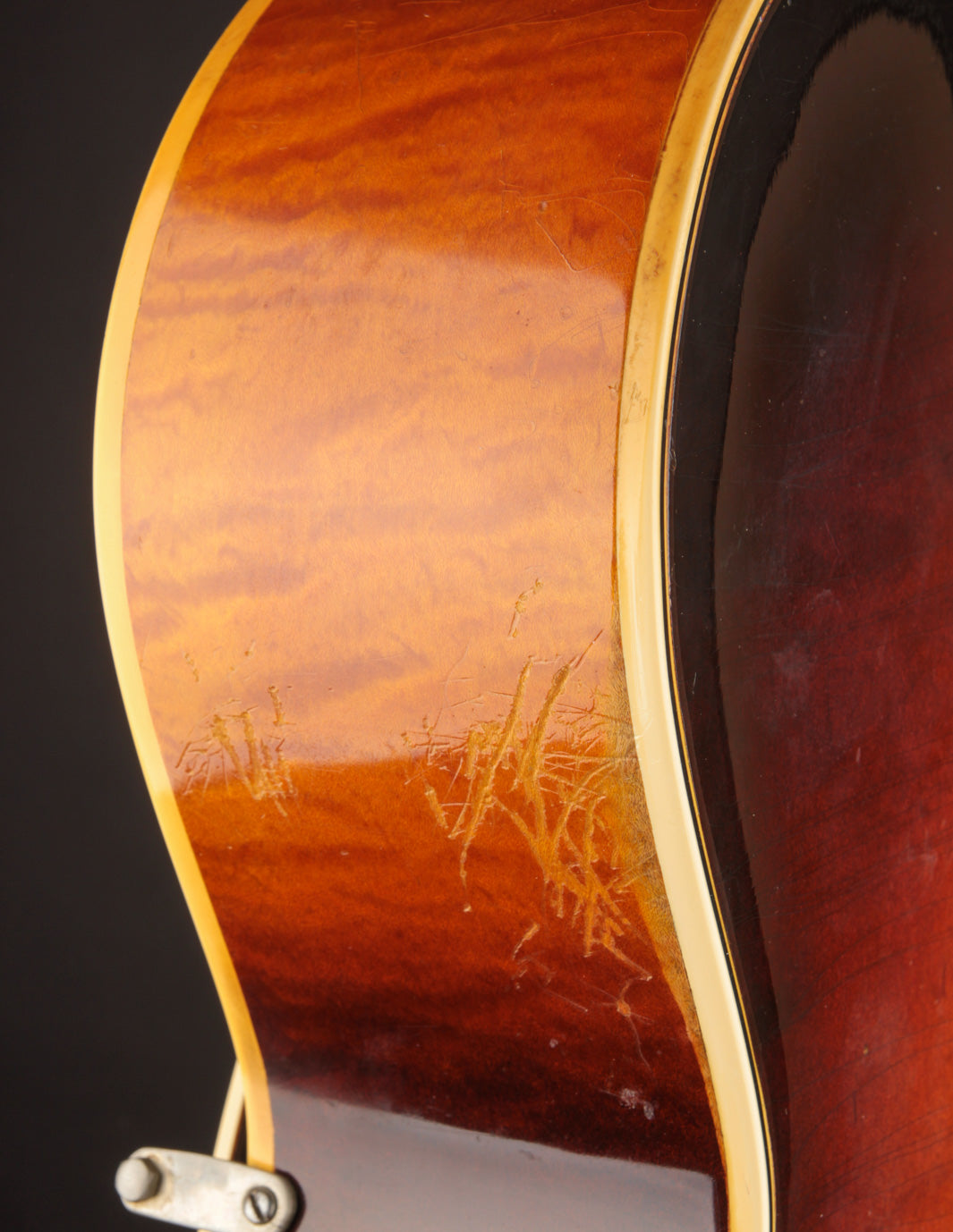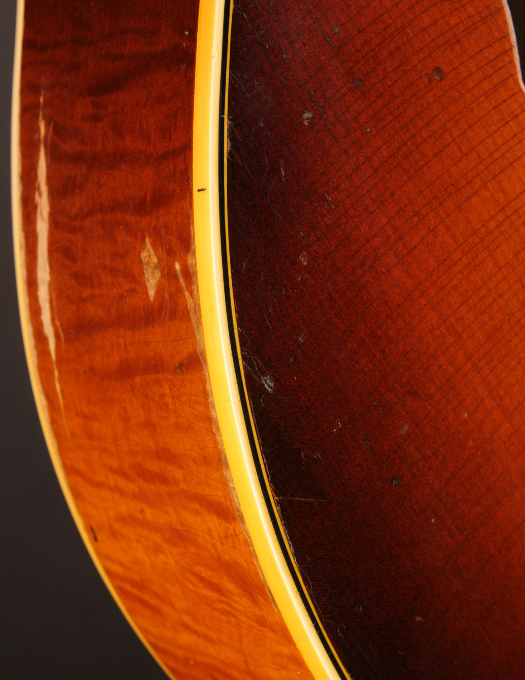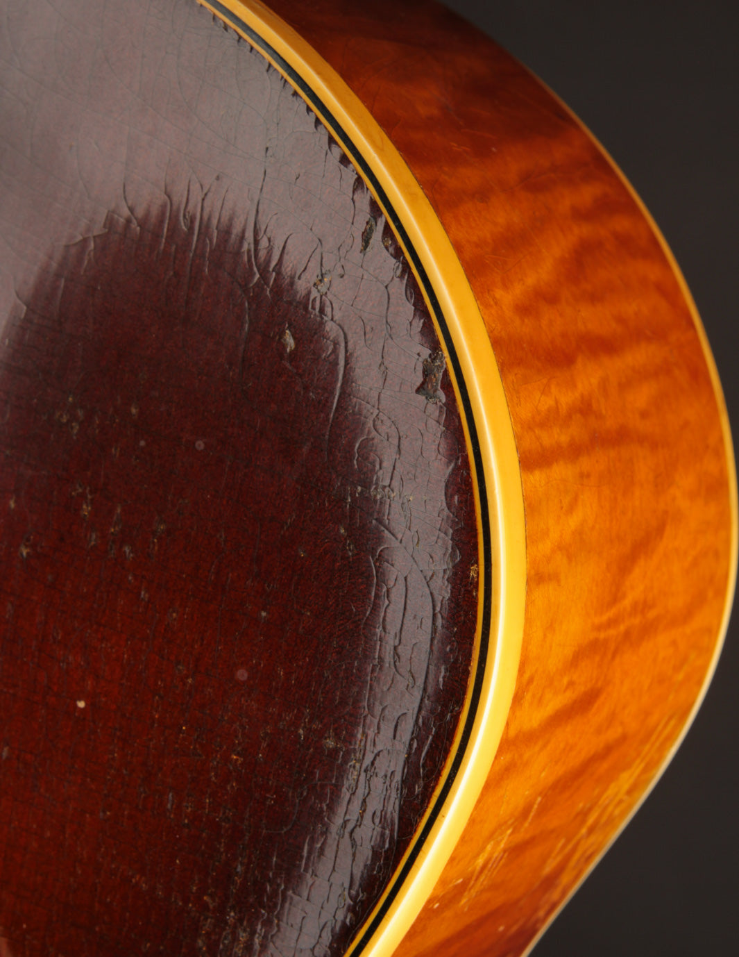 Besides all of the natural play wear, there's some light center seam separation on the back of the body that's tight and has required no further attention. The rims on the lower bout show some minor cupping, but the guitar is structurally sound, so we've elected to leave it be. It seems as though it's been that way a long time.