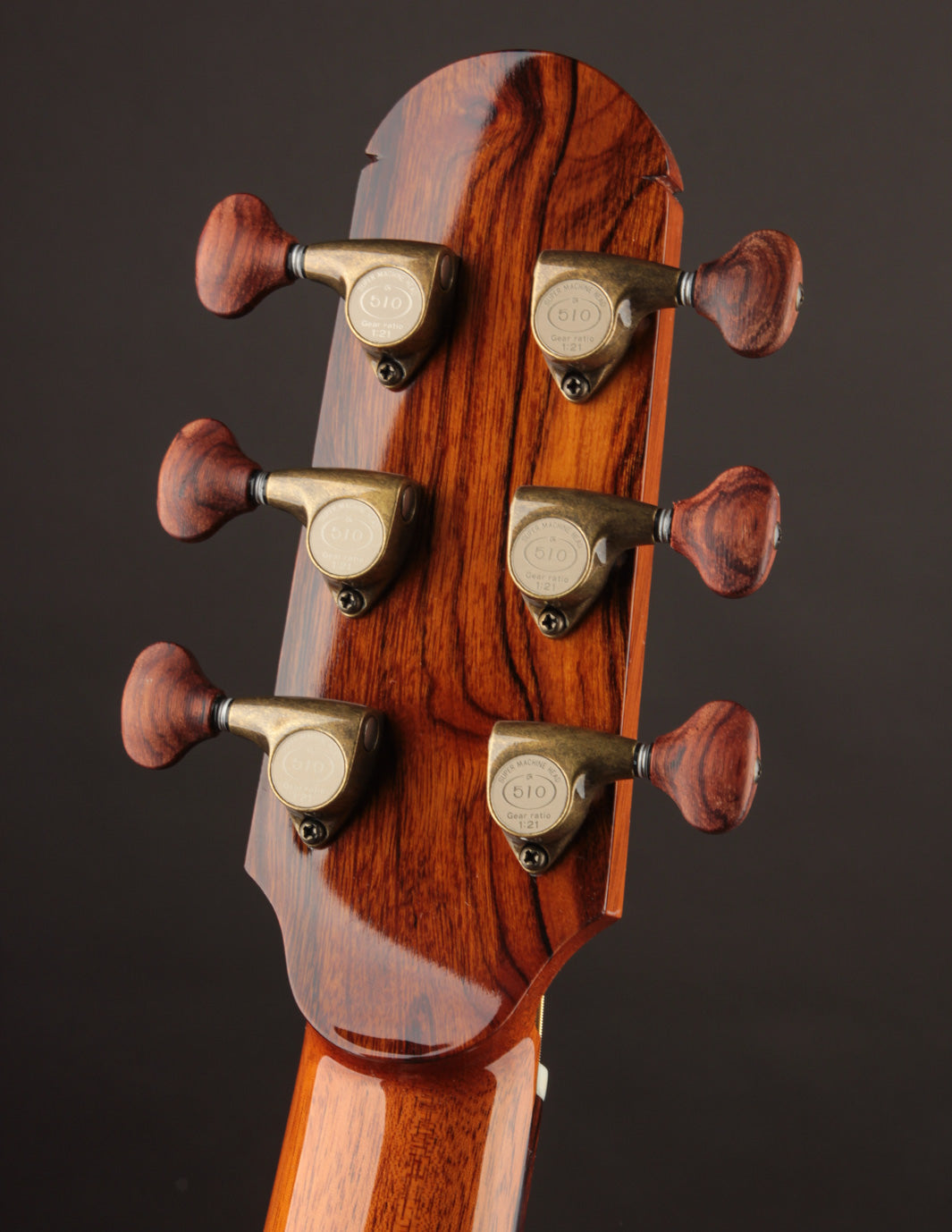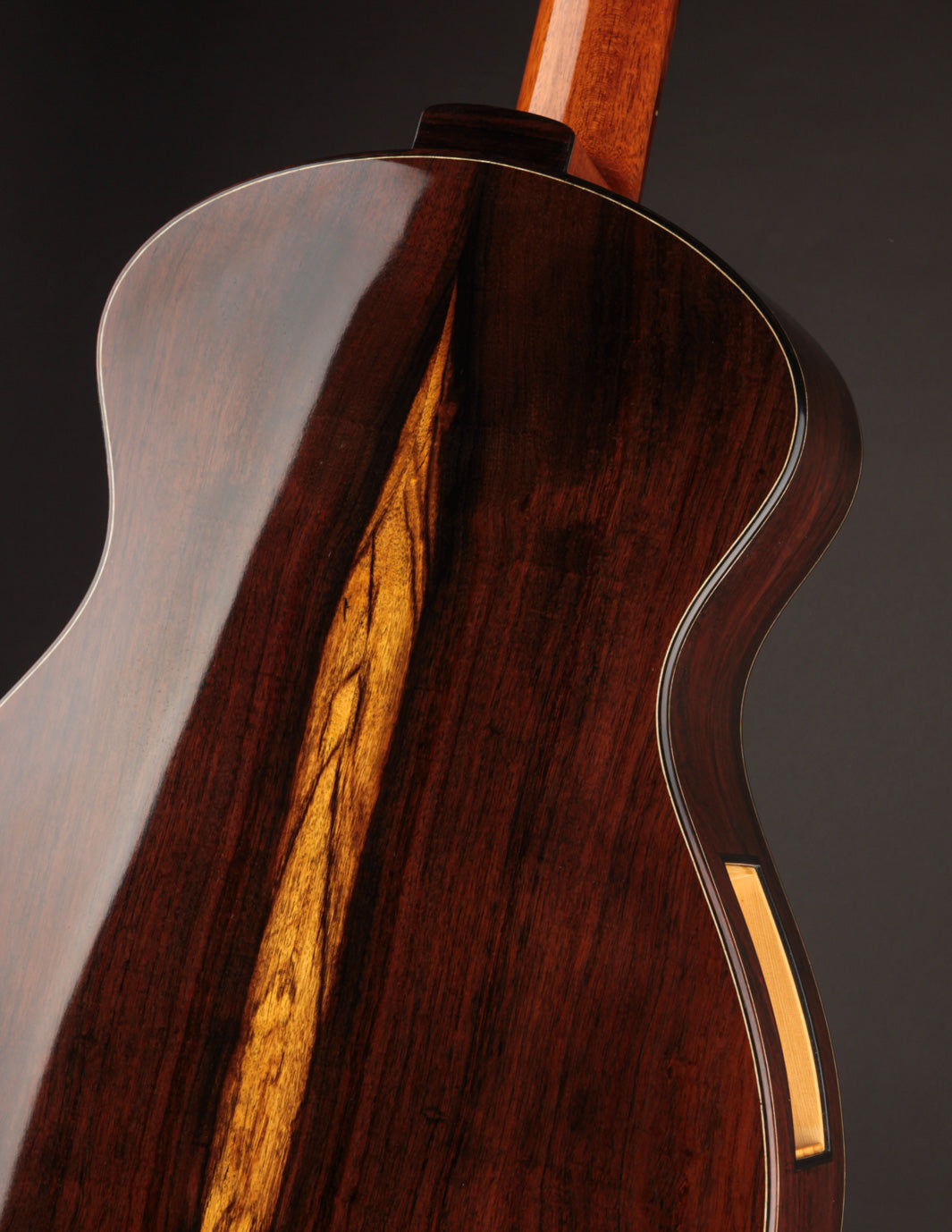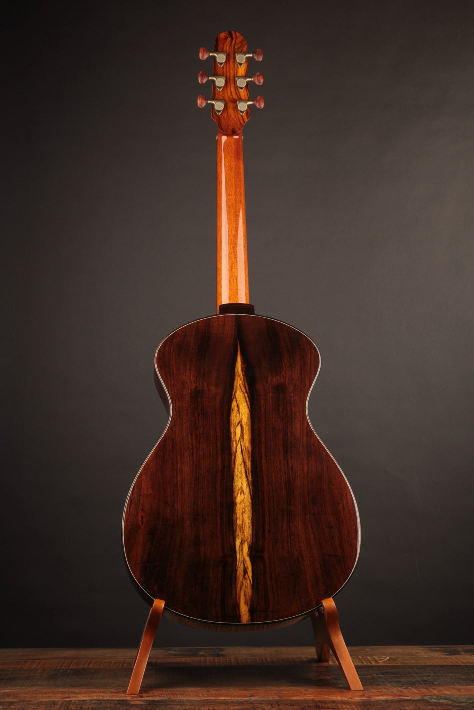 We're thrilled to be able to offer this Kraut 00, built for display at the 2025 Fretboard Summit in Chicago. The body, fretboard, bridge, headstock veneer, and tuner buttons are all made from Kraut's favorite North American hardwood: Desert Ironwood. Native to the American Southwest and Northern Mexico, Desert Ironwood is prized for its incredible density and lustrous color, leading many instrument builders to compare it to Brazilian Rosewood. By any objective measure of guitarmaking, this 00 is nothing short of sensational.