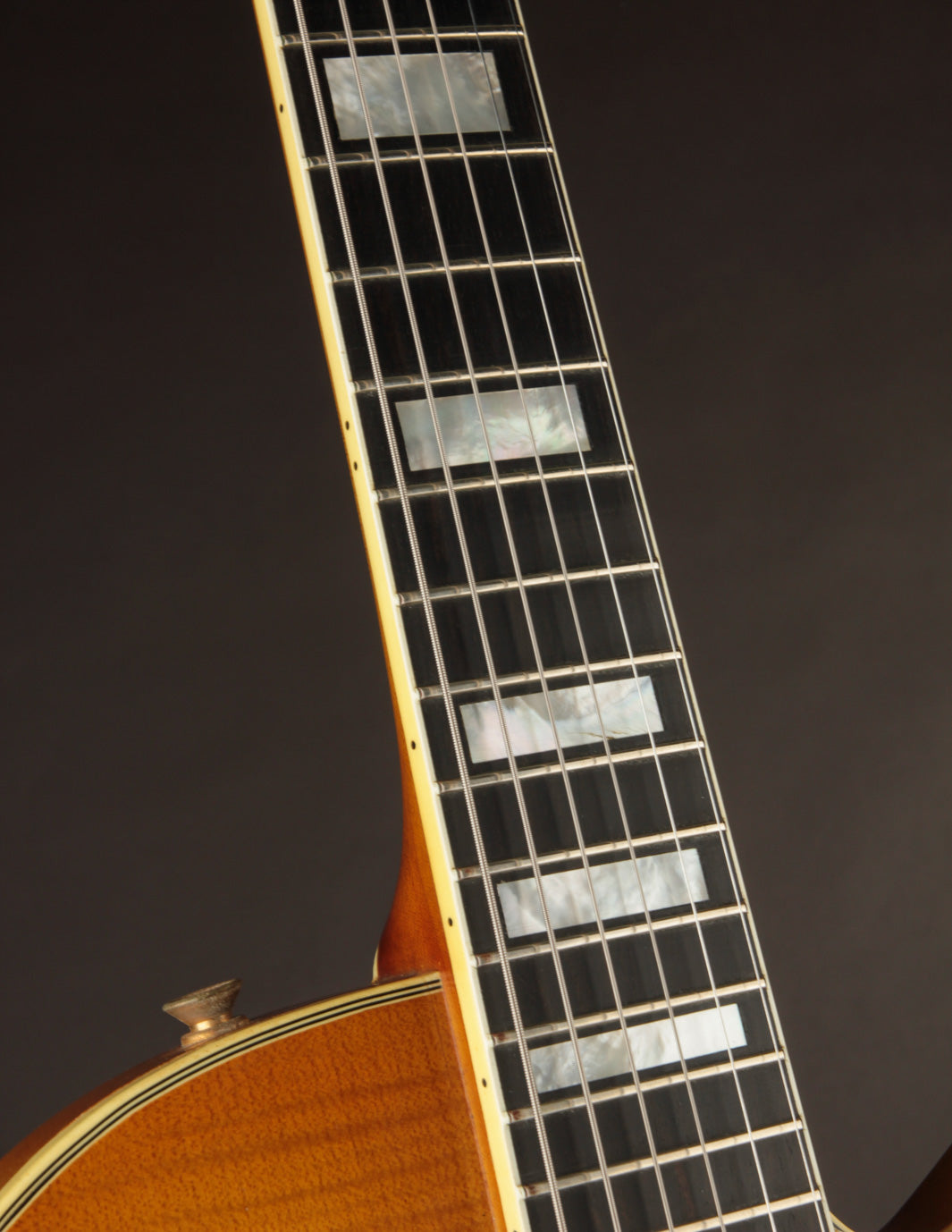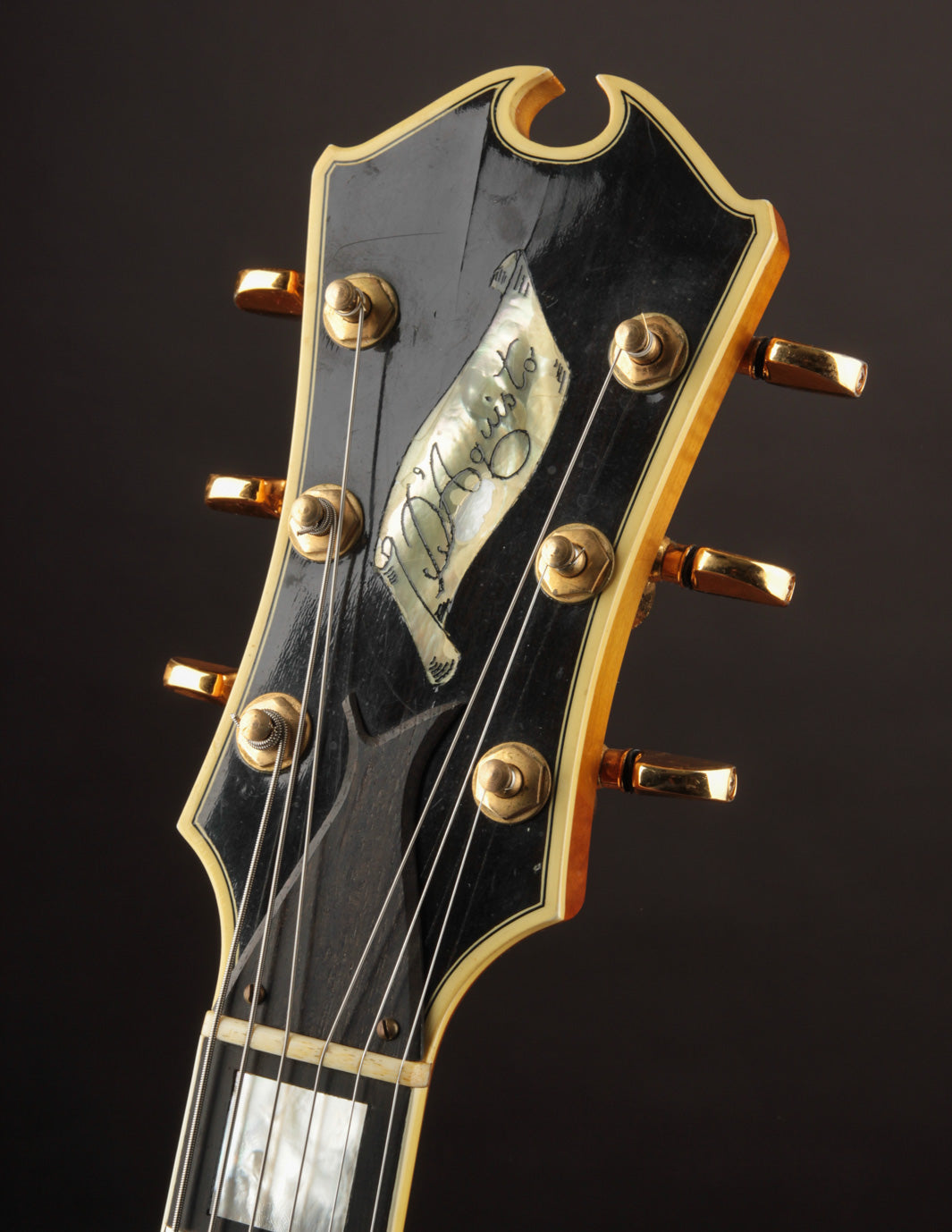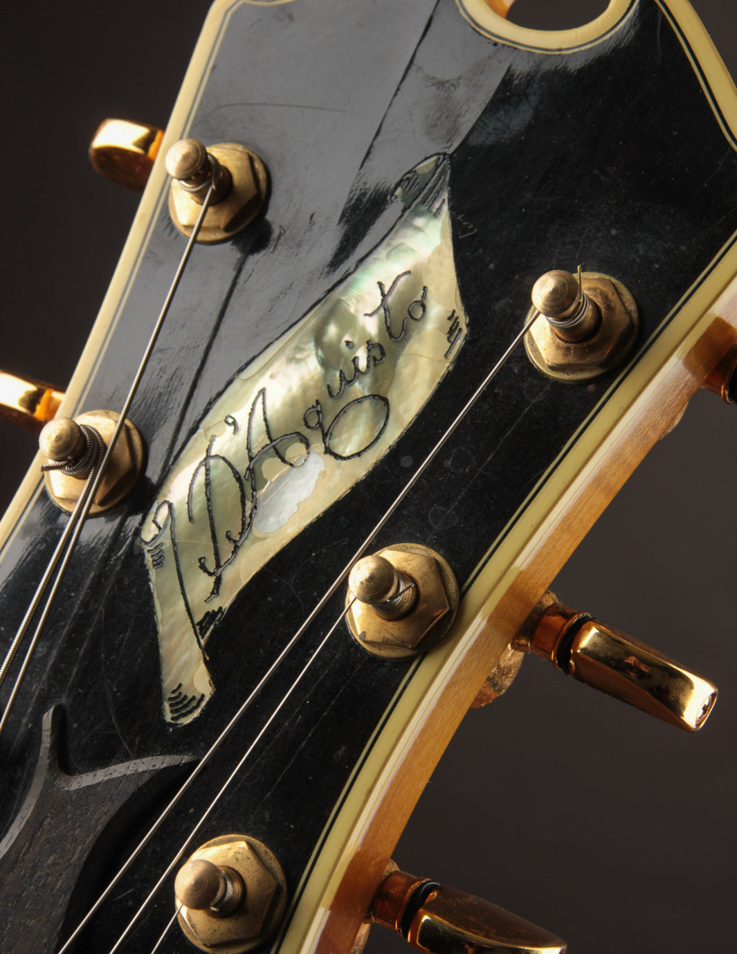 The neck is made of a single piece of Maple, and in all likelihood from the same batch of woods used in the construction of the body. It features a 1 3/4" nut width with a slim tapered D neck carve, bound with an Ebony fingerboard that's inlaid with large pearl block markers. The headstock features the wide flare open scroll top found on many of Jimmy's guitars, with a scrolled pearl inlay in the center and the D'Aquisto named scripted inside. The headstock is fully bound with purfling as well.