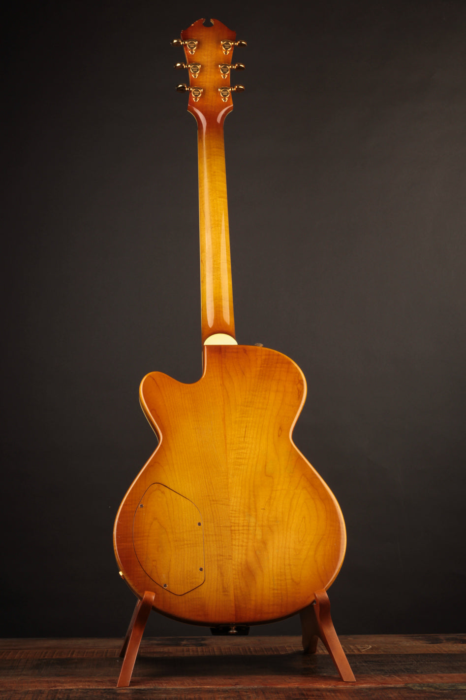 For the sake of clarity, this is actually a chambered semi-hollow electric. It's a "hollow solid" of sorts, as referenced over the years amongst D'Aquisto owners and afficionados. The lack of f-holes along with the use of solid woods in a slim-bodied format might suggest otherwise, but Jimmy did incorporate a combination of weight relief and acoustic voicing in this style of build, and it's immediately noticeable upon playing it.