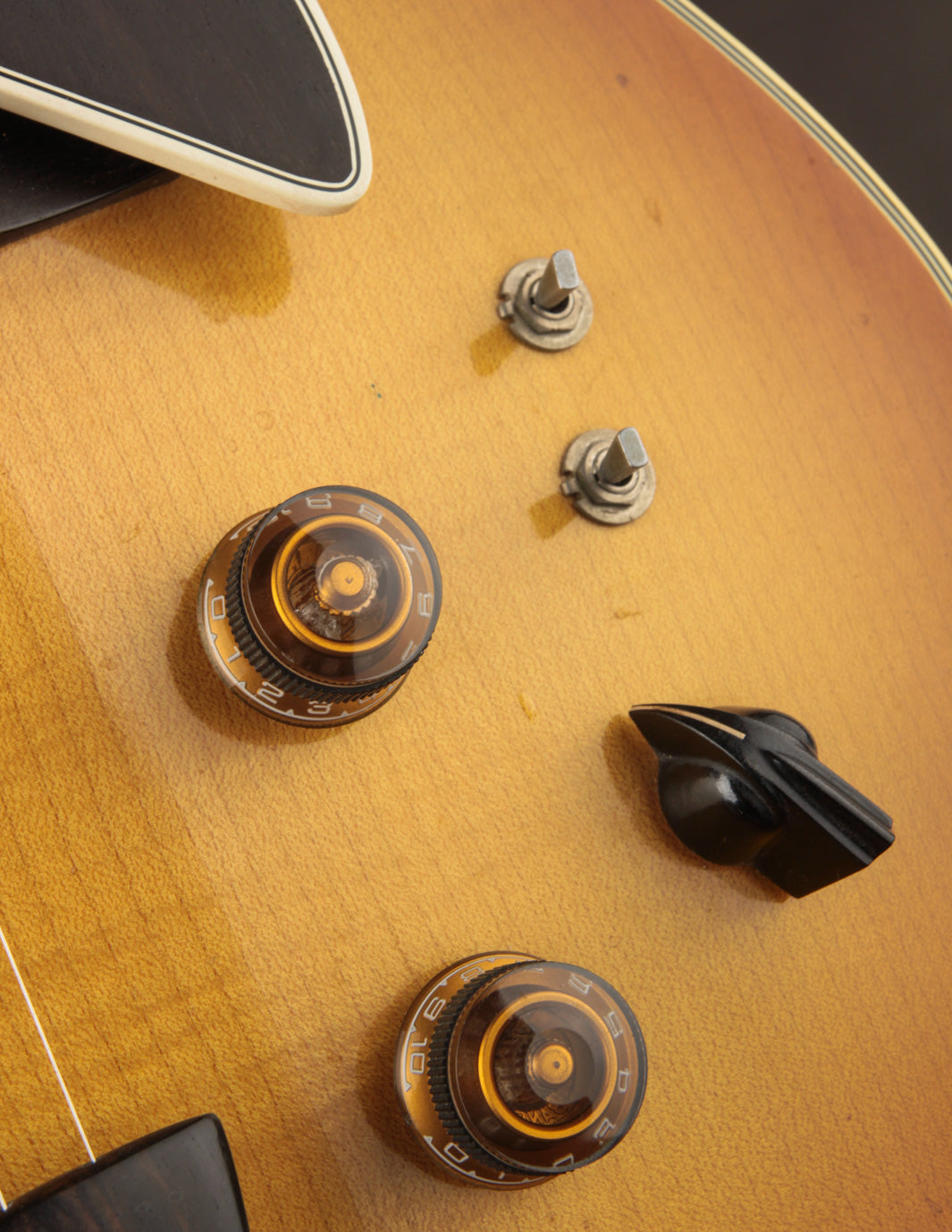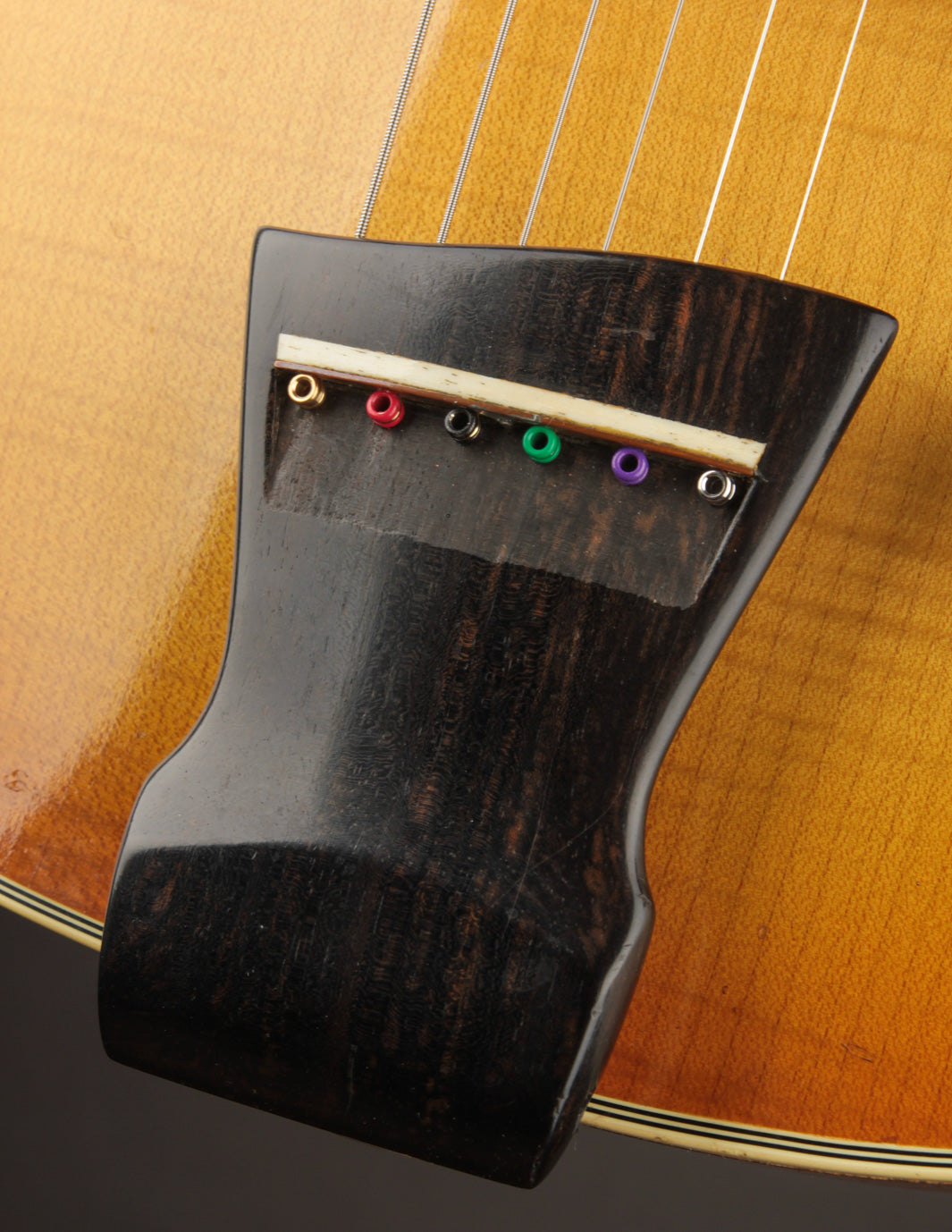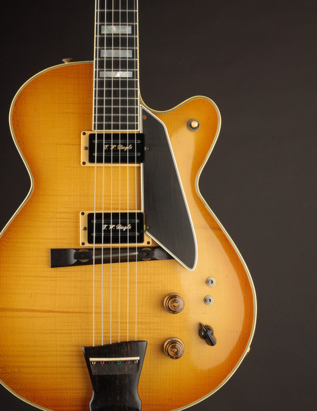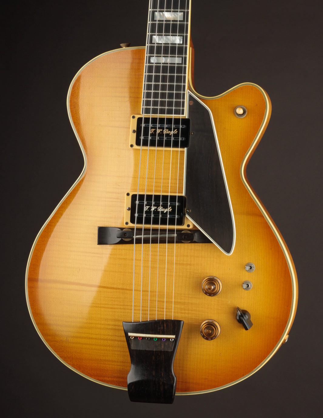 It's outfitted with an original set of T.W. Doyle humbuckers, designed and built by New Jersey native Tom Doyle. Jimmy recommended these pickups to the owner, and having seen these pickups in other D'Aquistos, it was clear that he had a great working relationship with Tom and found their voicing to suit his builds quite well. With a varitone circuit integrated into the electronics along with phase and coil split switches, it's about as versatile a configuration as you'll find in a D'Aquisto. The pickups provide a clear, smooth response with lots of range and control. Traditional jazz and blues to fusion seem easily accessible with minor control adjustments.