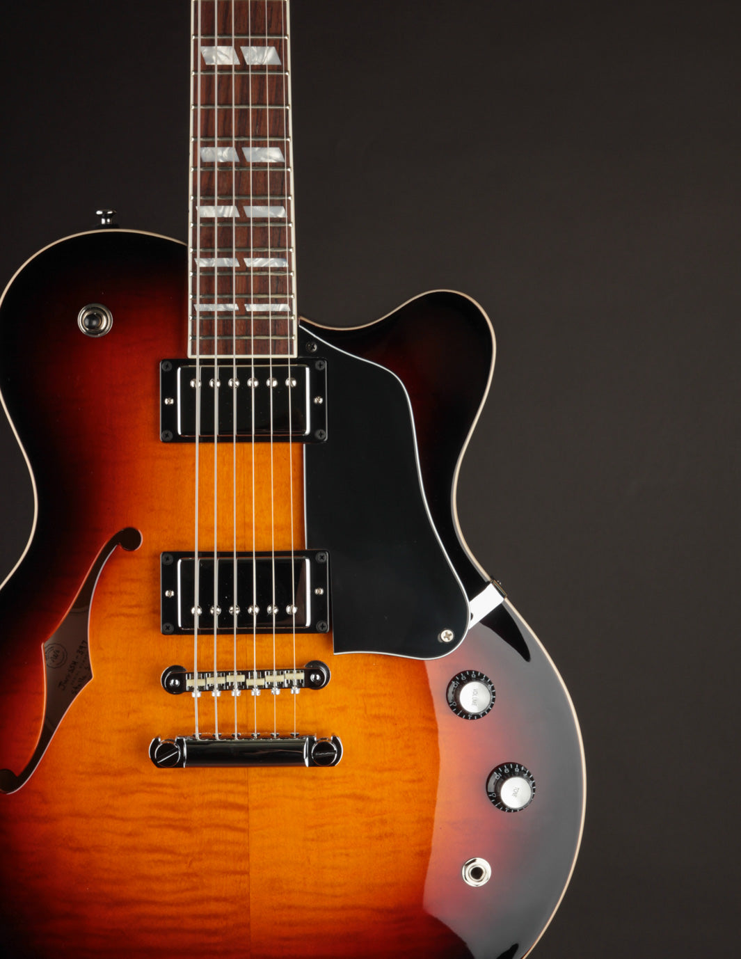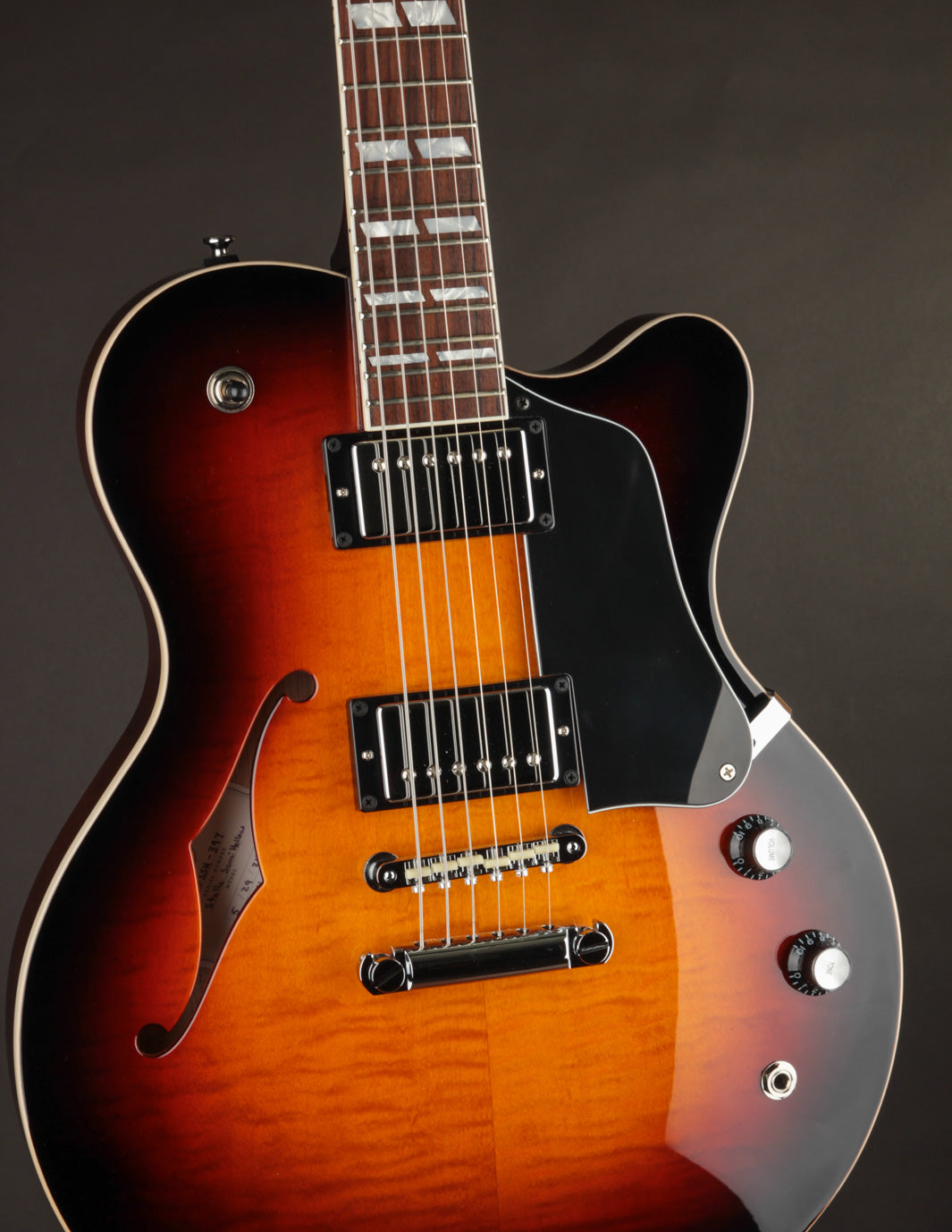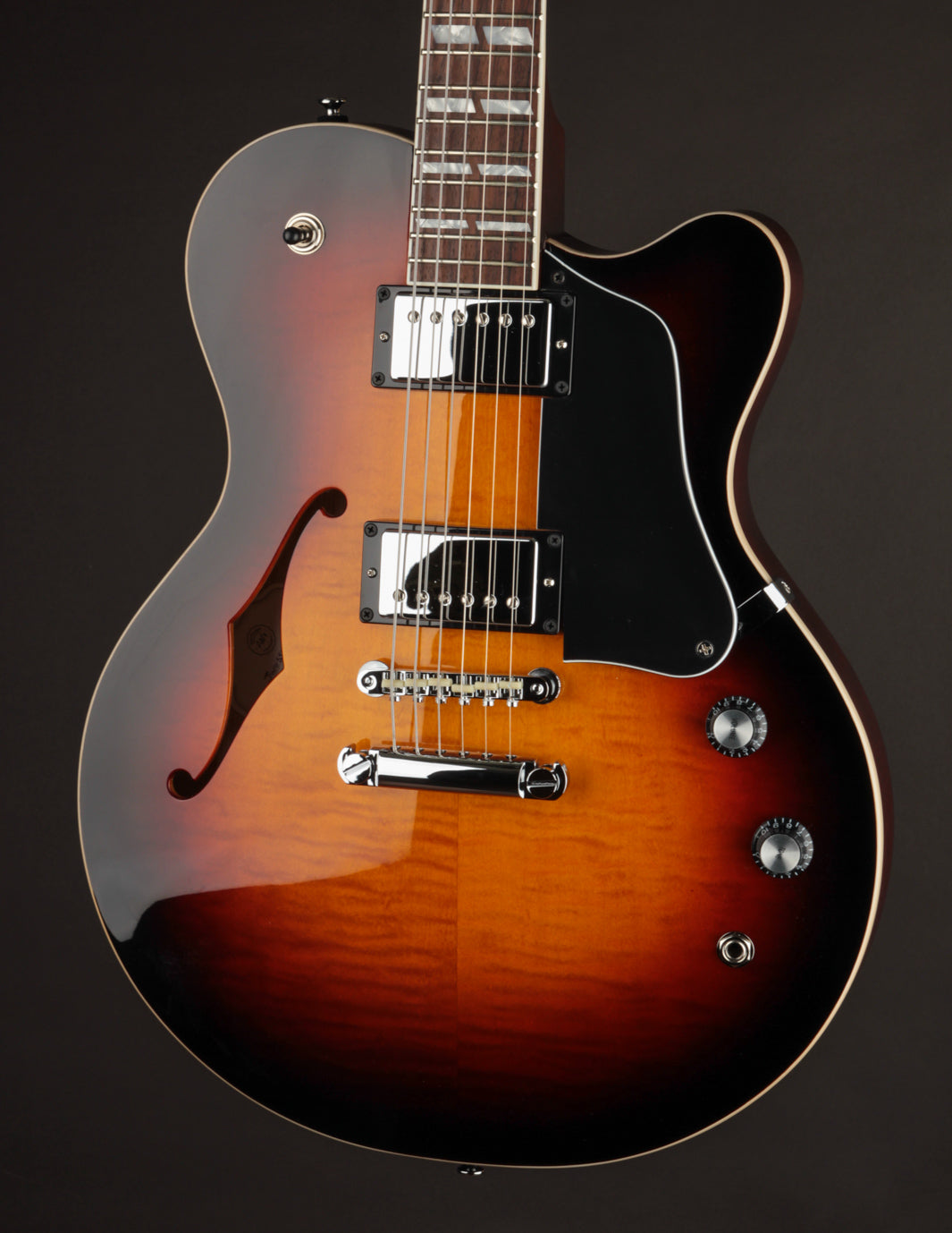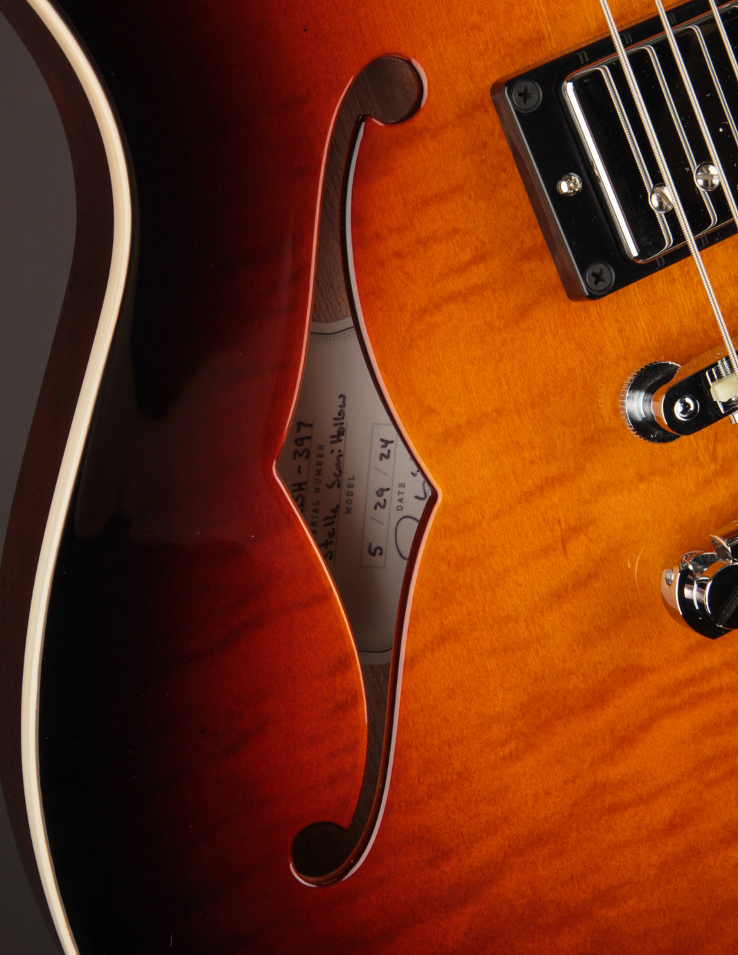 Featuring a curly maple top, semi-hollow mahogany body, mahogany neck w/a rosewood fingerboard, 24.75" scale length, and twin Lollar humbuckers, the Stella semi-hollow pulls from a well-proven combination of specs.