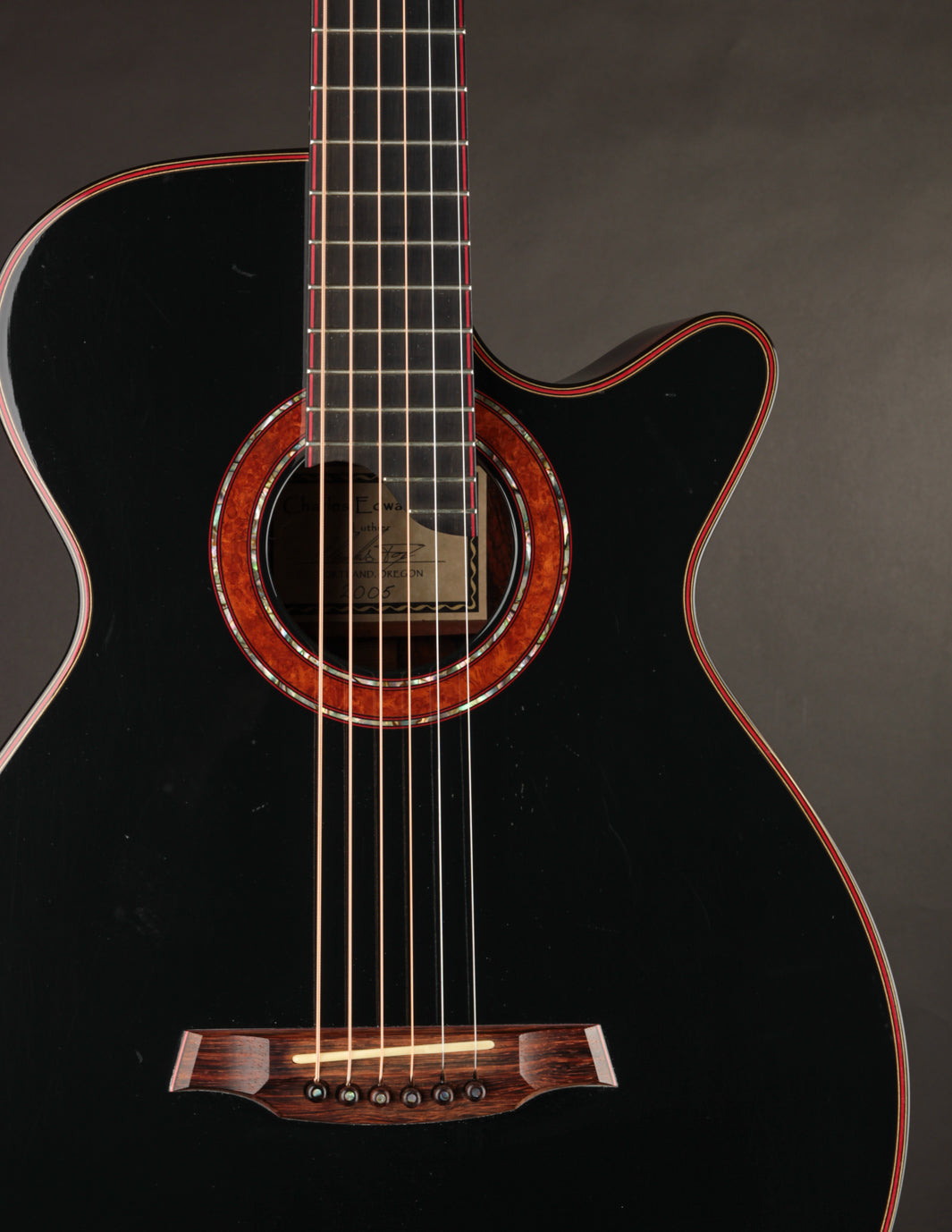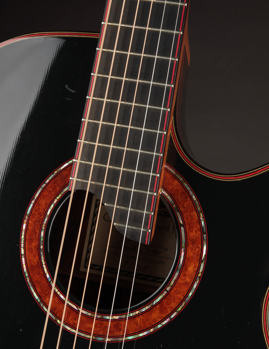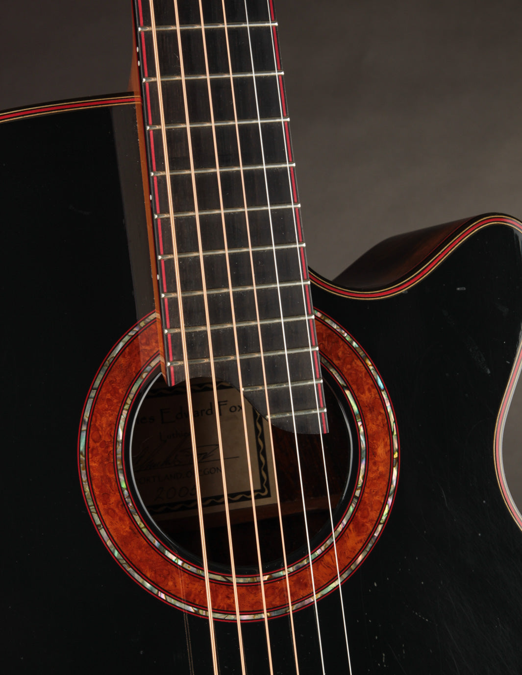 Mr. Fox was quite a fixture on the guitar-building scene in the early to middle aughts; and he made a name for himself through his innovative designs and his presence as an instructor at the American School of Lutherie. The "Ergo" was his signature guitar ~ a lightly built small jumbo, with a thin body, double-top construction, and cantilevered fretboard.