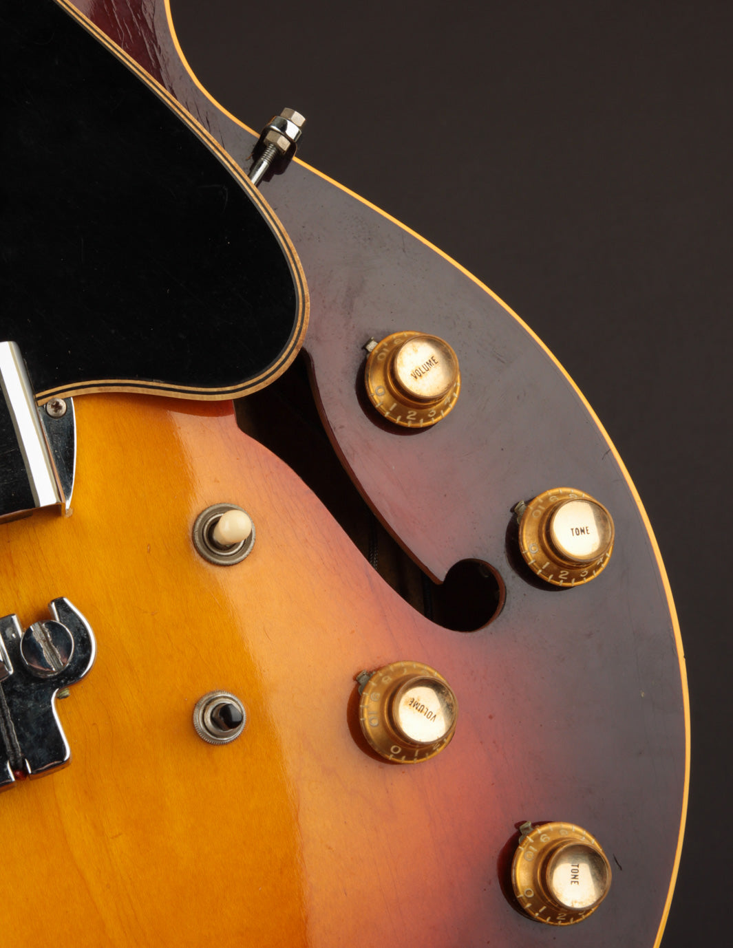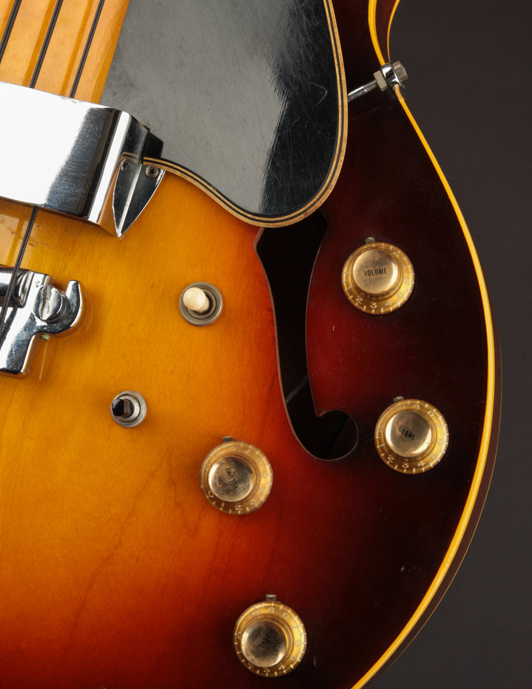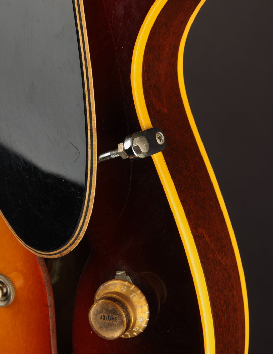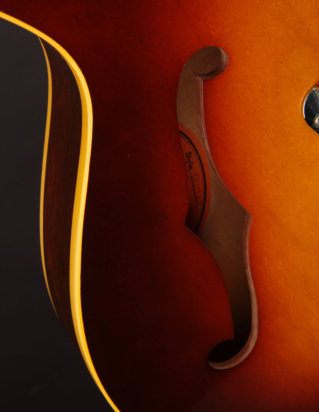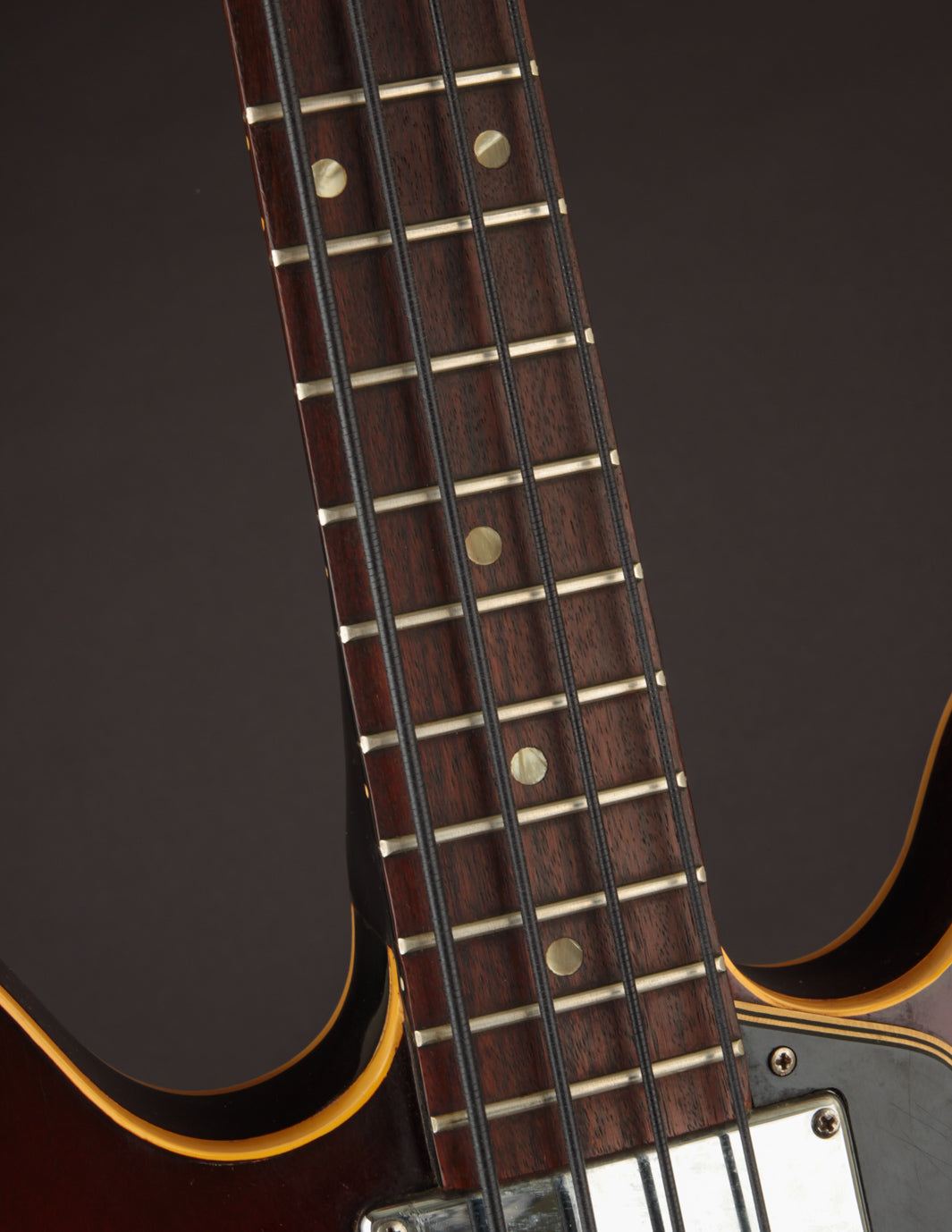 This EB-2D recently found its way into our shop from the sister of its late owner who had purchased in nearly 30 years prior. With the exception of the mute assembly, it has remained in a factory original state its entire life. The Sunburst finish is still rich and vibrant with minimal fading, and the binding has aged nicely to a darker cream/yellow. It features original plastics throughout, including the "reflector" knobs that were abandoned in favor of "witch hat" knobs later in 1967, keeping it more of a true early/mid 60s specs in that regard.