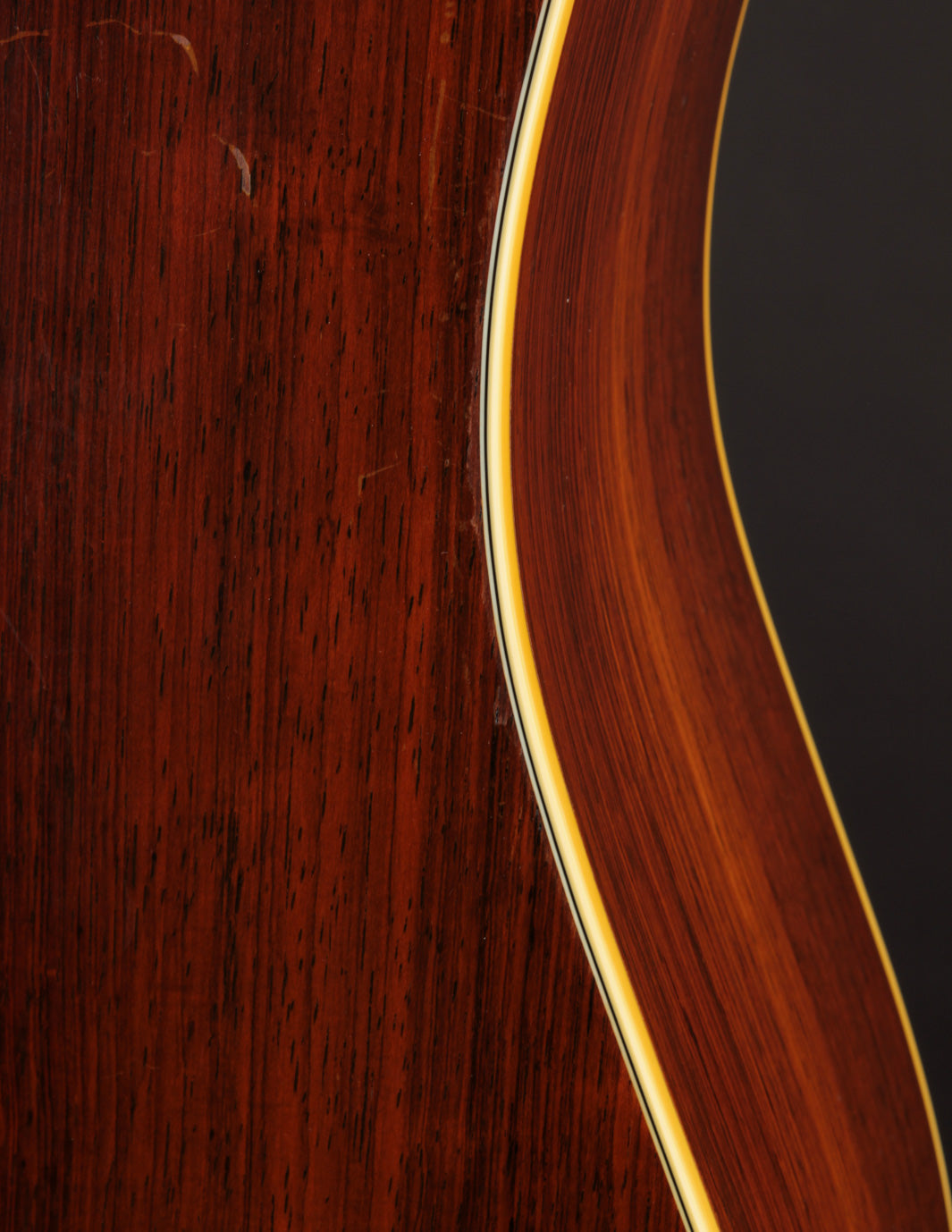 So it comes as no great surprise that 77299 remains in near-perfect condition a few months after its 82nd birthday. Remember that this guitar was essentially one woman's wedding ring; and her family treated it as such. Even though Roy Fleeger continued performing with it for many years, putting a little wear on the top between the bridge and the pickguard, this instrument is the definition of an heirloom. It was neatly wiped down and kept in its case when not in use, and passed down to Roy and MaryAnn's children when they could no longer play it. Its surroundings and environment must have been excellently maintained, as its original finish remains gleaming and mostly un-checked. There are no cracks. And aside from the aforementioned playwear on the soundboard, the only other significant sign of use is a small spot of worn finish on the back of the neck, where hundreds of hours of first-position chords have been logged. When our consigning owner acquired 77299 from an intermediary representing Roy and MaryAnn's son in 2009, no work had ever been done to it. Luthier Ken Fallon performed a neck reset, and installed new frets and a new bridge at that time. The setup remains unaltered since then, and needs no adjustment. The guitar's action measures perfectly, at 3/32" (bass side) and 2/32" (treble side) under tension of medium gauge strings. 77299's structure is otherwise completely original. It is still housed in its original hardshell case.