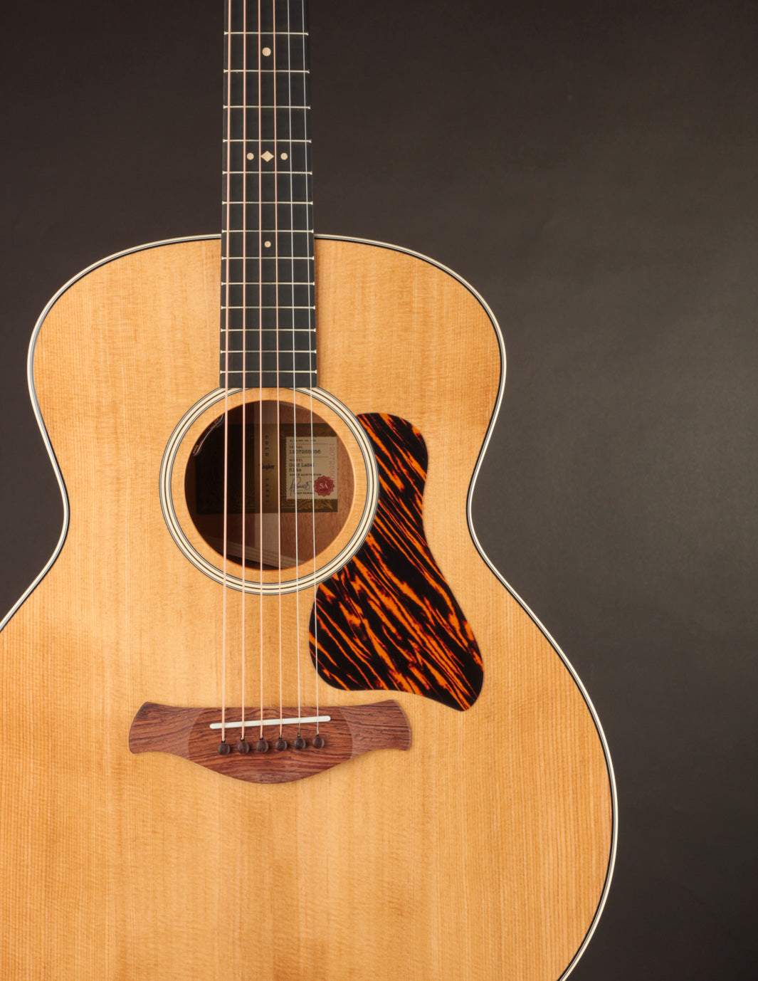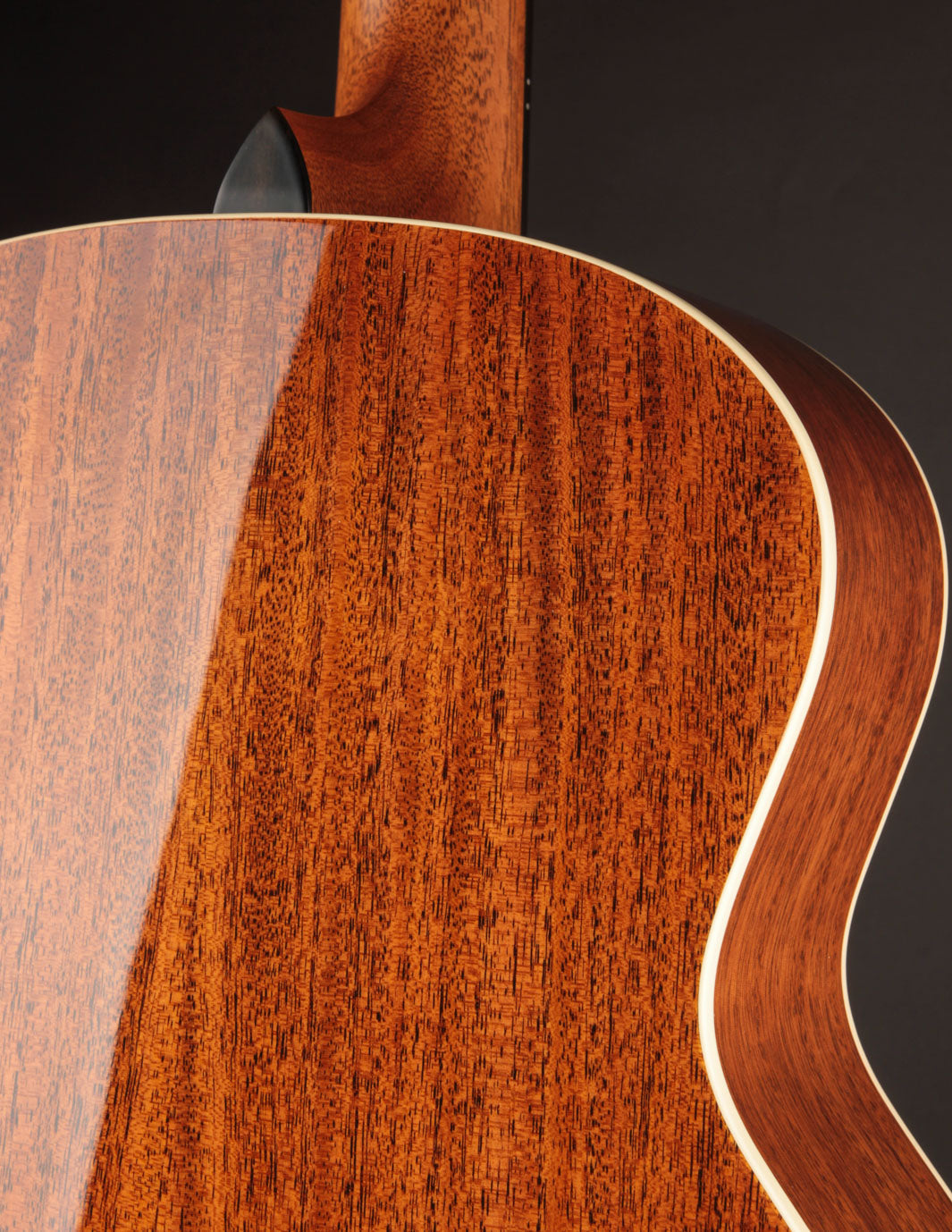 There are a number of interesting design elements at work to achieve this new sound. First and foremost, the Gold Label welcomes a new size, the Super Auditorium, to the Taylor family. Just a touch larger than the extremely popular Grand Auditorium, it's a very comfortable guitar to sit with. It's very open and resonant when fingerpicked or played lightly, and dynamic and punchier when played aggressively.