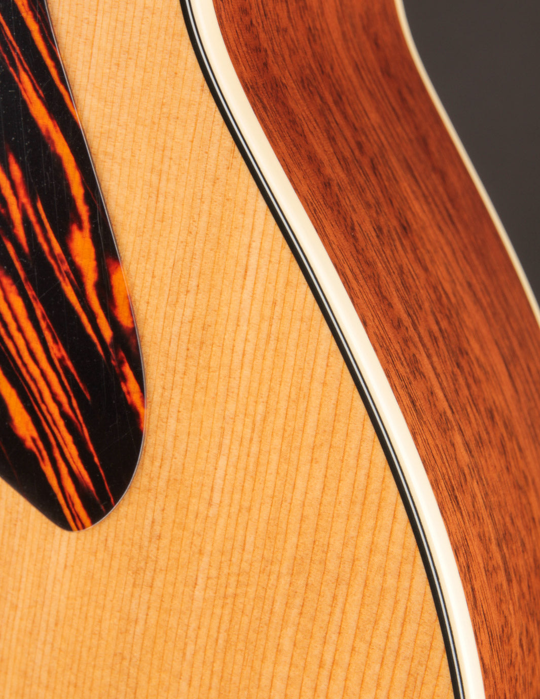 The torrefied Sitka top and Mahogany back and sides contribute to a resonant tone with a strong fundamental note. Fanned V-Class bracing, as well as a unique long tenon neck joint, improve resonance and energy transfer through the body and neck.