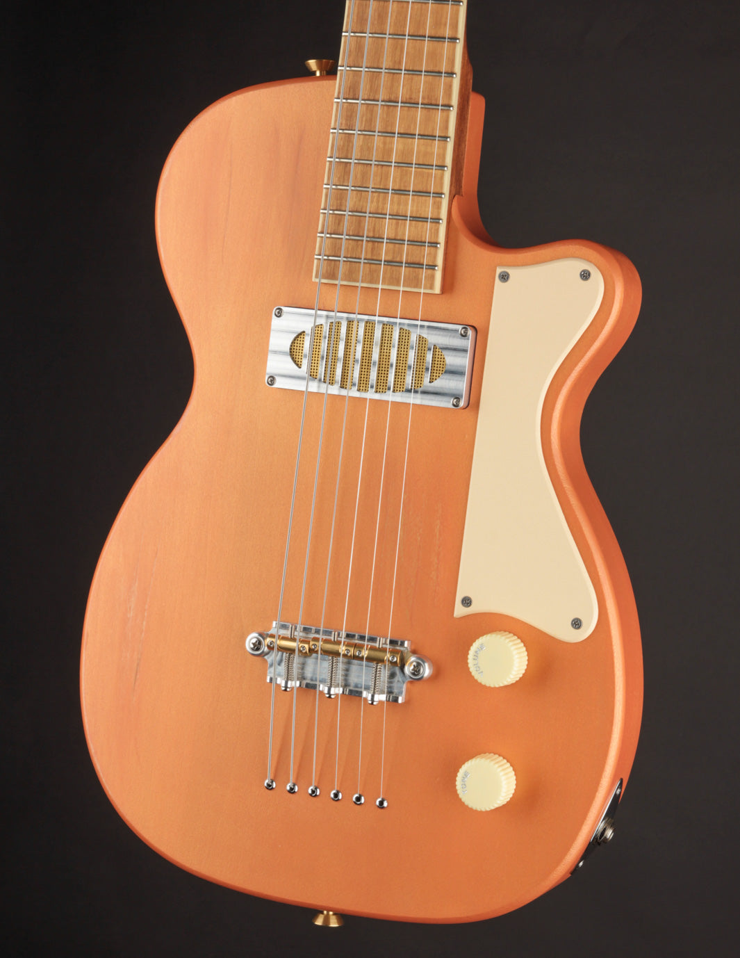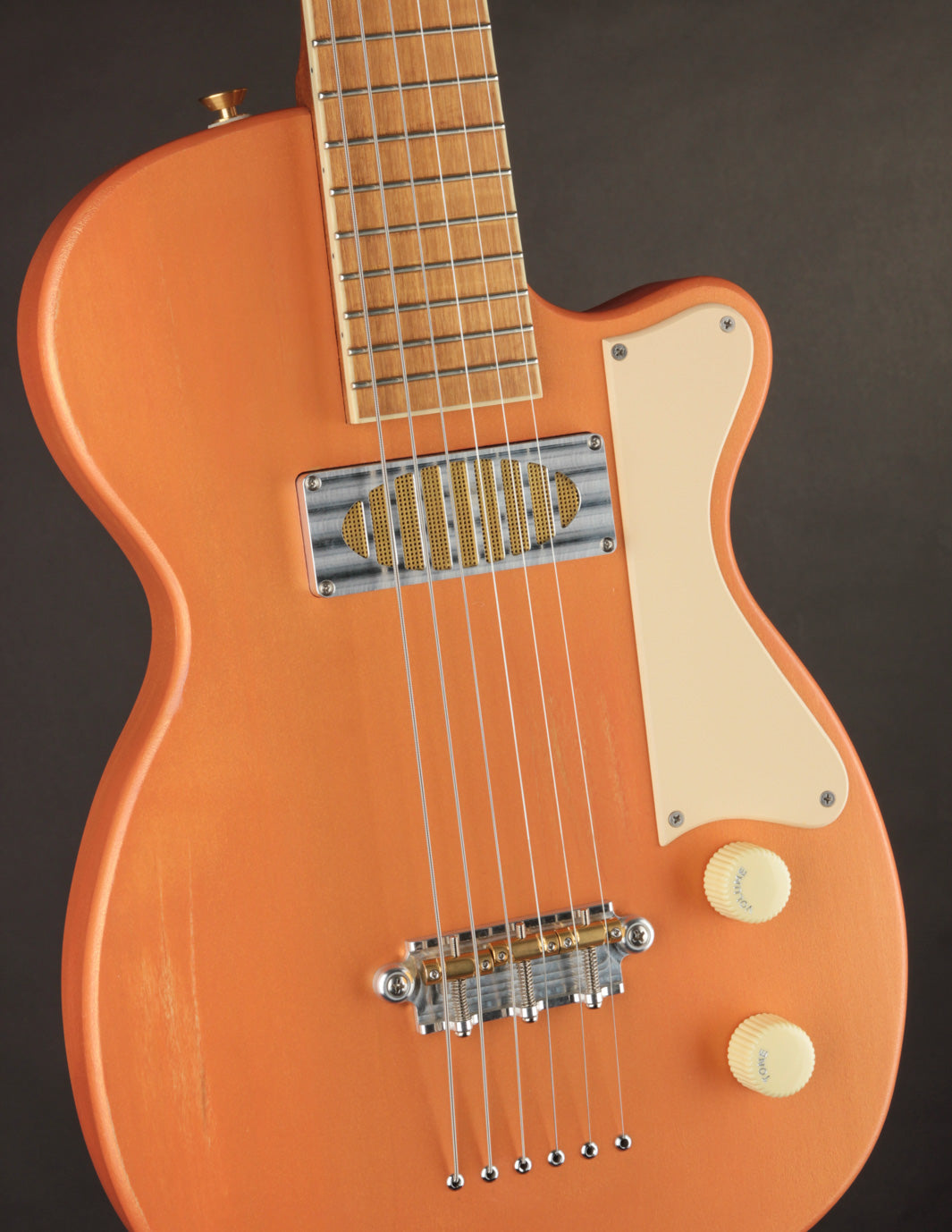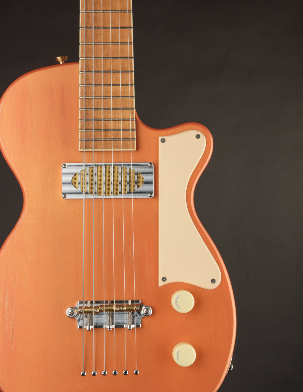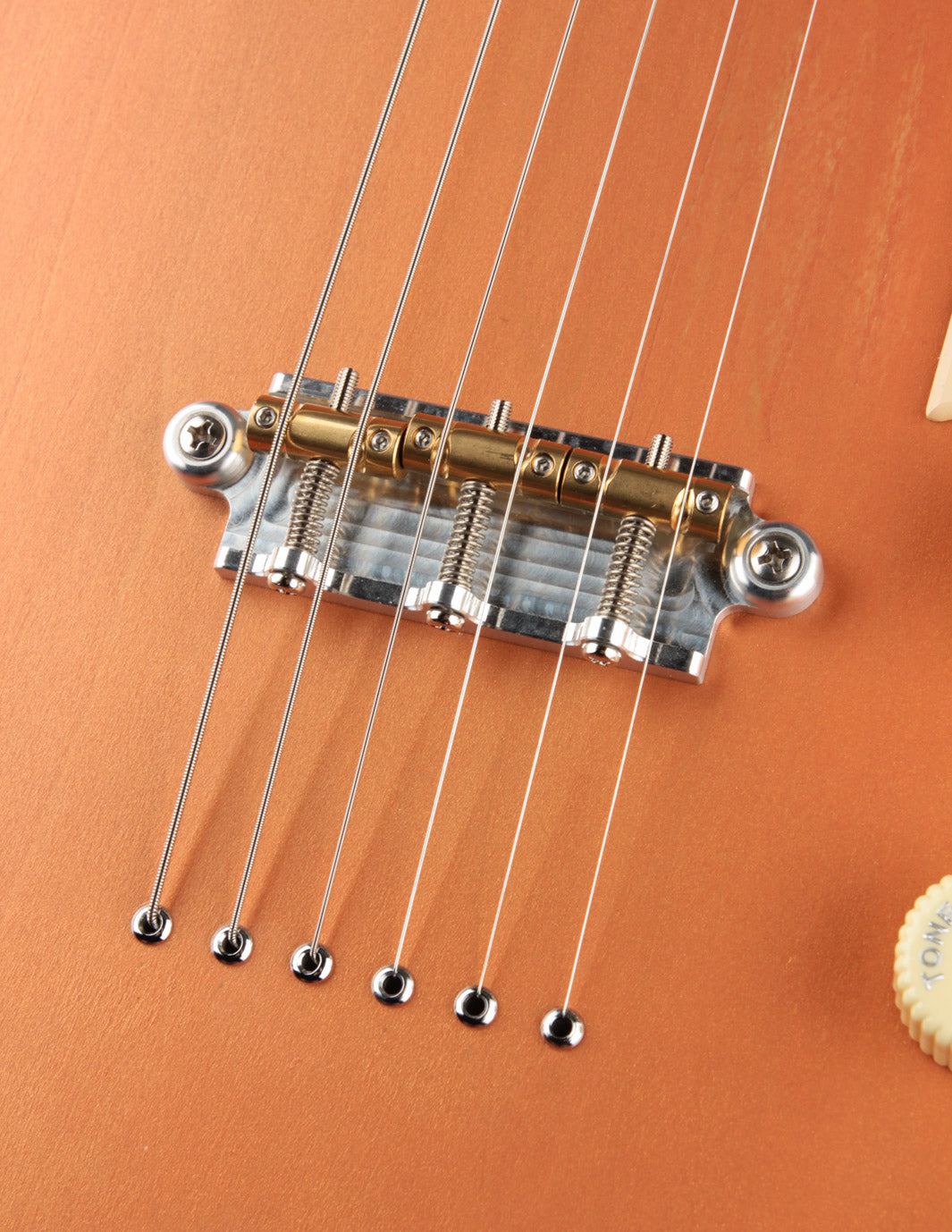 The large C/D neck and Aged Orange Metallic finish (a little bit of that aged Copper look is in there!) give a nod to the originals, while the MOJO Hersheybucker and custom-milled aluminum bridge and brass saddles offer wider tonal variety, more sustain, and precise intonation. The string-through design is a nice touch as well - we definitely feel the added resonance at play.