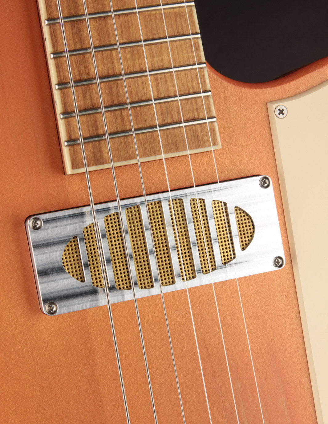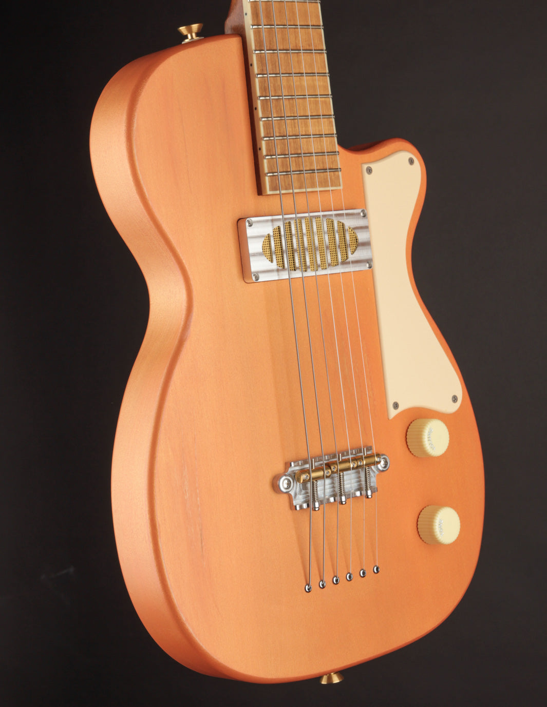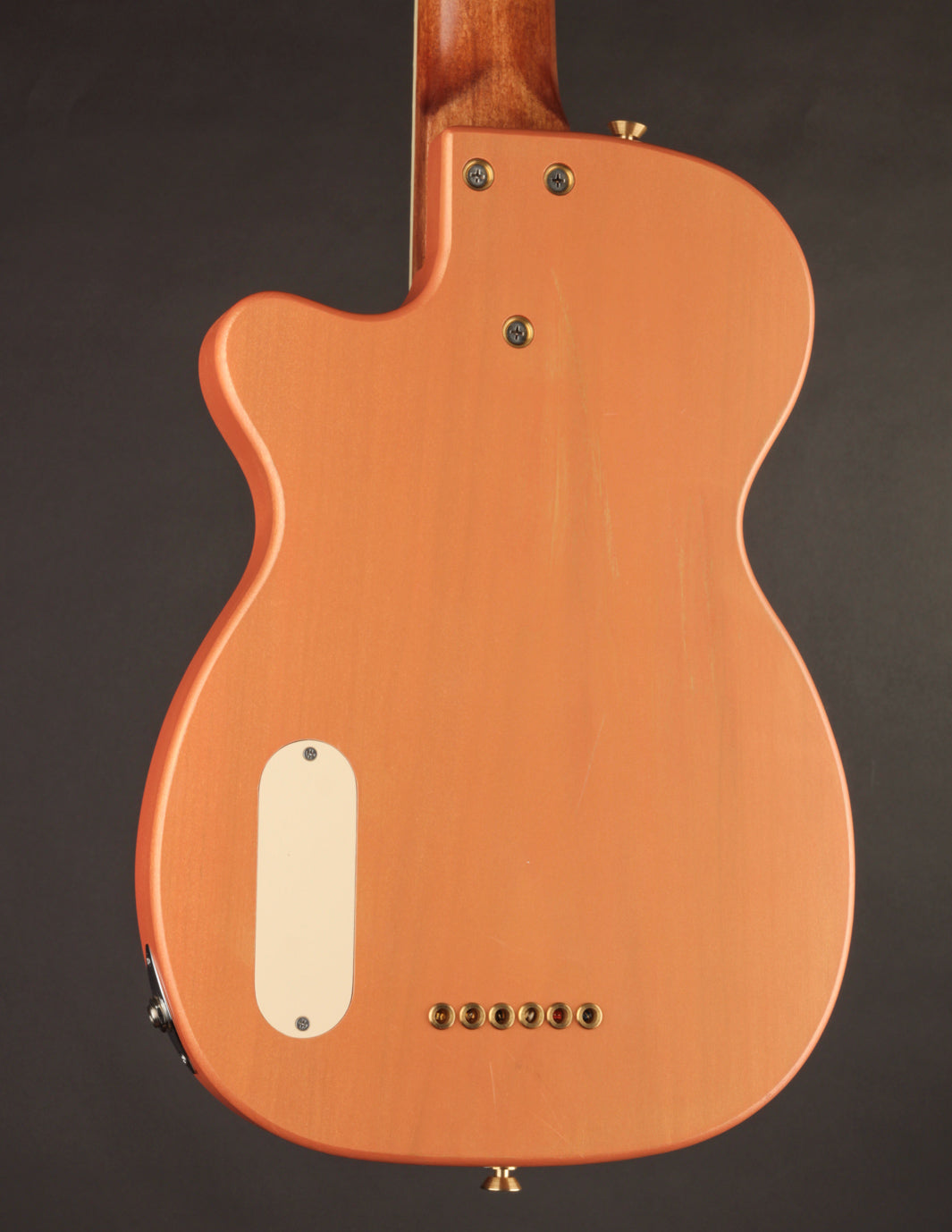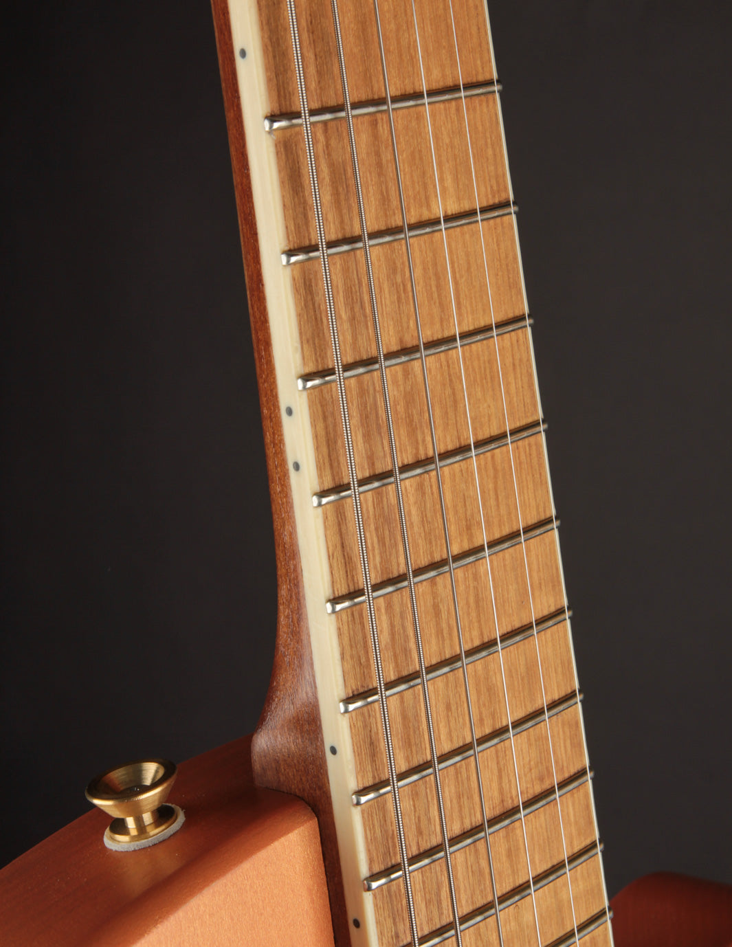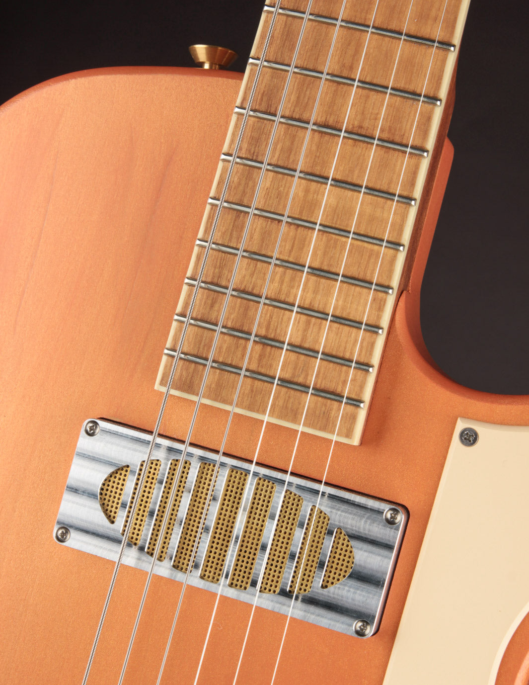 The large C/D neck and Aged Orange Metallic finish (a little bit of that aged Copper look is in there!) give a nod to the originals, while the MOJO Hersheybucker and custom-milled aluminum bridge and brass saddles offer wider tonal variety, more sustain, and precise intonation. The string-through design is a nice touch as well - we definitely feel the added resonance at play.
