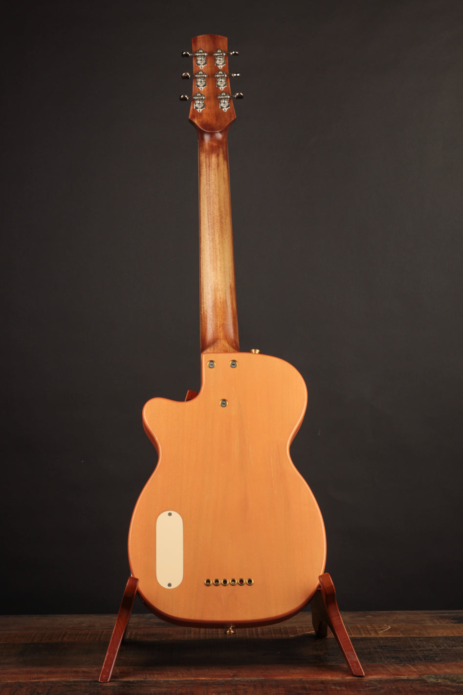 Arguably his most notable model is the Forty-Four. The Forty-Four takes the compact single-cut design of the original Harmony H44 Stratotone and elevates it from mail-order to luthier-grade, all while retaining what made the originals so special. From the reclaimed tonewoods and custom-made hardware to the handwound pickups and striking finish work, the Forty-Four is as captivating tonally as it is visually.