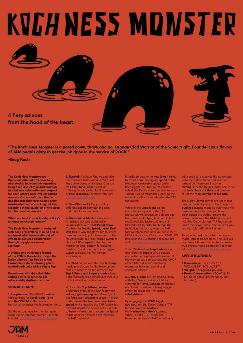 Born from a 15-year collaboration between Greg Koch and JAM Pedals, the Kochness Monster is Greg’s ultimate “throw-and-go” rig: compact, road-ready, and loaded with four of JAM’s most beloved effects. Designed with travel in mind but built to handle any gig or session, it’s the all-in-one box Greg relies on to deliver the goods night after night.