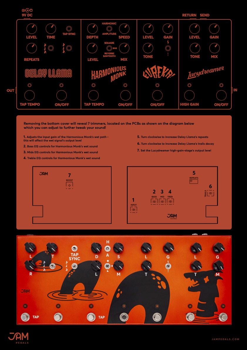 Inside you’ll find an awesome lineup: Lucydreamer Overdrive, Eureka! Fuzz, Harmonious Monk Tremolo, and the Delay Llama - all wired together in a smart, no-fuss chain. One standout feature? You can sync the Delay Llama’s tap tempo with the Harmonious Monk, letting a single tap drive both effects and unlocking beautifully warped rhythmic textures.